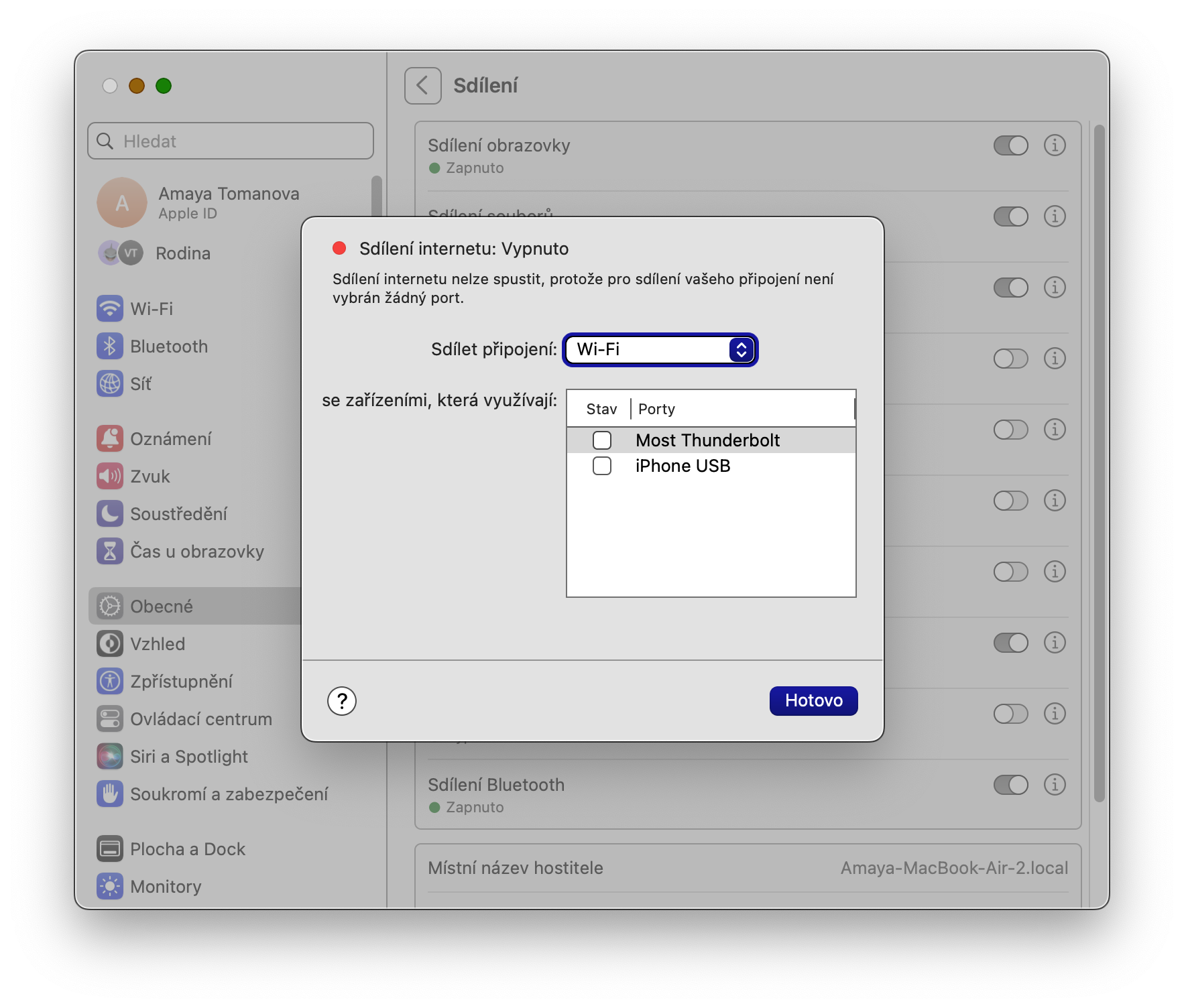 - Aktivujte položku Sdílení internetu a připojte iPhone k Macu za pomoci USB kabelu.