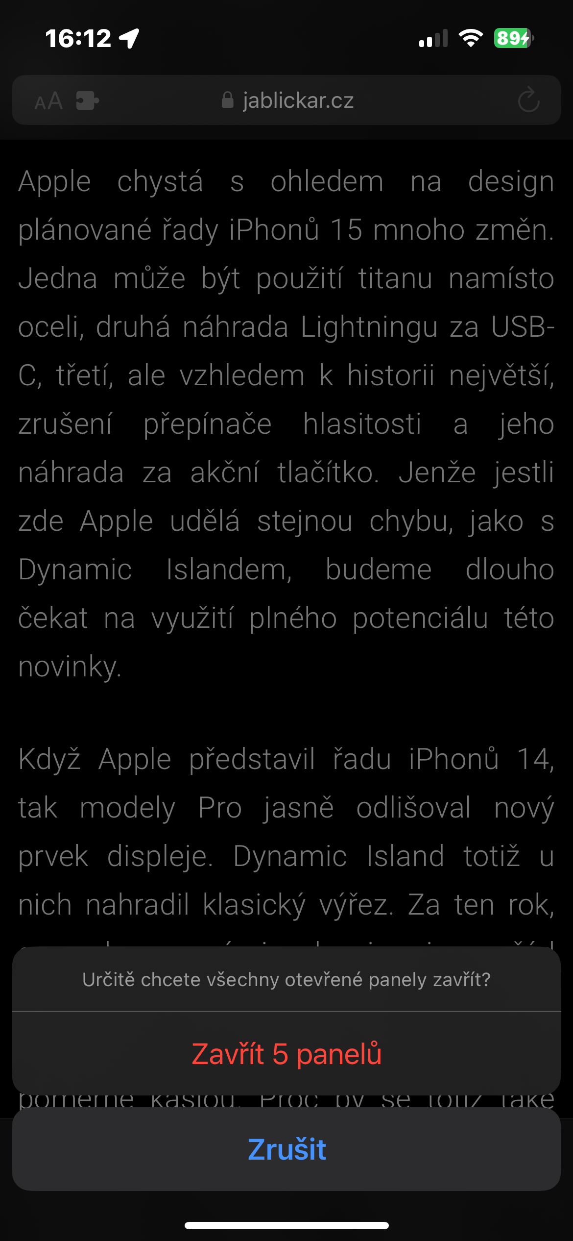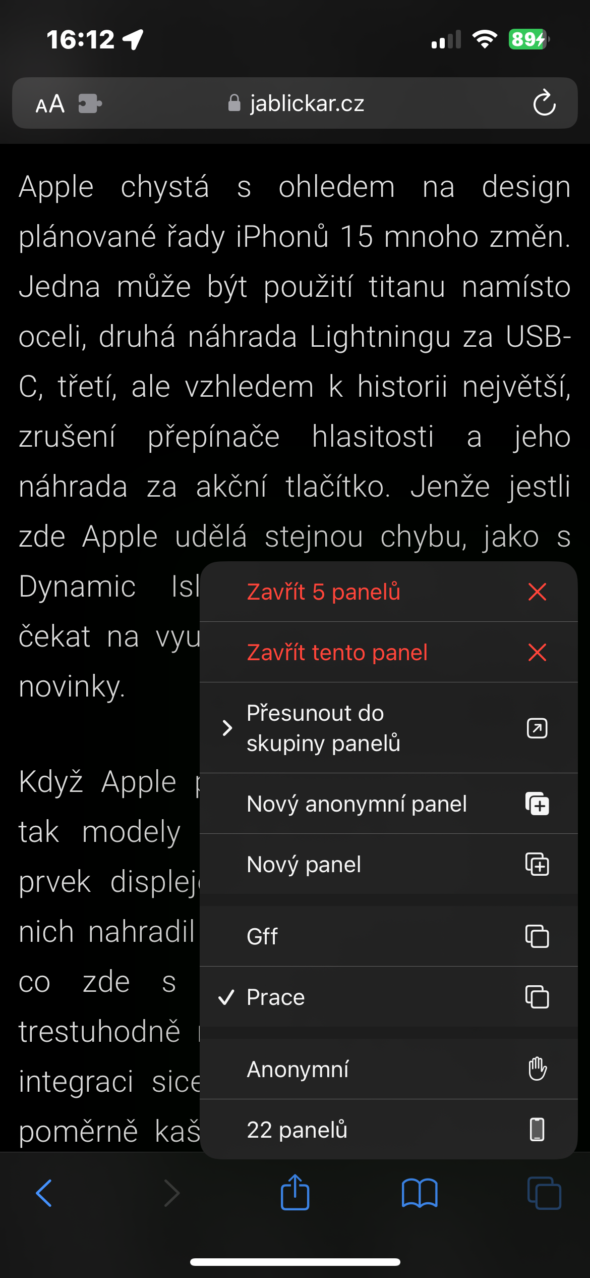 Než se pustíme do některých pokročilejších postupů, můžete začít nejlépe tím, že v Safari zavřete nadbytečné karty. Nechávat je otevřené nemá smysl, pokud aplikaci nepoužíváte, a i když ano, všechny je nevyužijete. Raději si tyto karty uložte jako záložky, abyste se k nim v případě potřeby dostali později. Stačí dlouze stisknout ikonku karet v pravém dolním rohu a poté klepnout na Zavřít XY panelů.