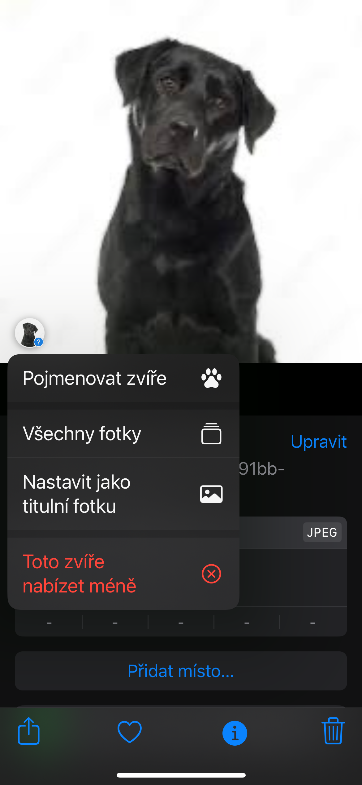 Fotíte často vašeho domácího mazlíčka? Ve Fotkách na iPhonu s iOS 17 a novějším mu můžete přiřadit jméno. Stačí najít danou fotku a klepnout na ⓘ . V levém dolním rohu snímku by se měl zobrazit jeho náhled se znaménkem + – po klepnutí na něj můžete zvíře pojmenovat, případně provést další akce.