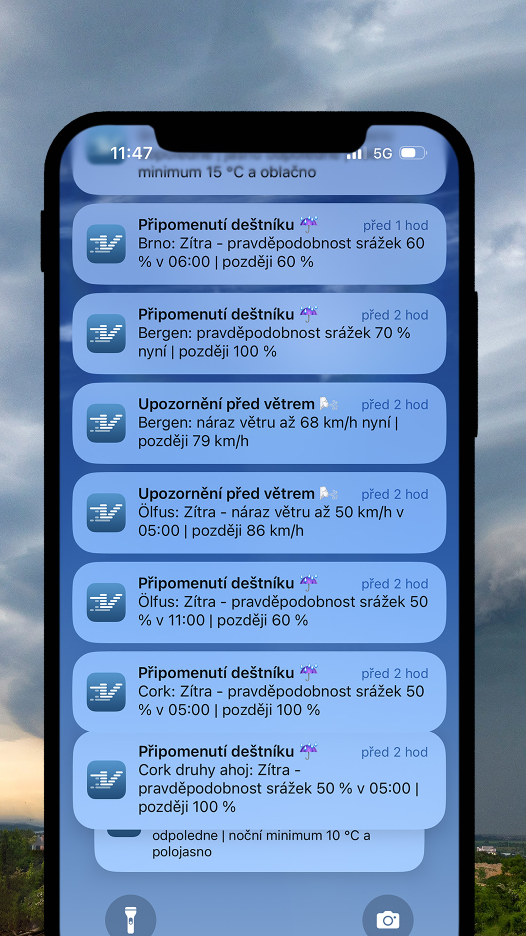 Každý den můžete dostávat denní souhrny, které vám poskytnou přehled o počasí během následujícího dne. Dále můžete očekávat notifikace, které vás ráno upozorní na možnost deště nebo nárazového větru v průběhu dne. Zvláště důležité jsou notifikace, které vás varují před bleskovými údery v určité vzdálenosti od vaší aktuální polohy. Tato funkce má značný potenciál v oblasti zvyšování bezpečnosti, zejména pokud jste venku nebo na výletě. Ročně desítky lidí v Evropě zraní úder blesku. Právě tyto notifikace tak mají největší potenciál zvýšit bezpečnost. Například na výletě vám přijde notifikace, že 40 kilometrů na západ od vaší polohy právě uhodil blesk. Díky této informaci máte dostatek času najít bezpečné místo, kde můžete bezpečně přečkat bouřku. Tato včasná výstraha může předejít možným nebezpečným situacím.