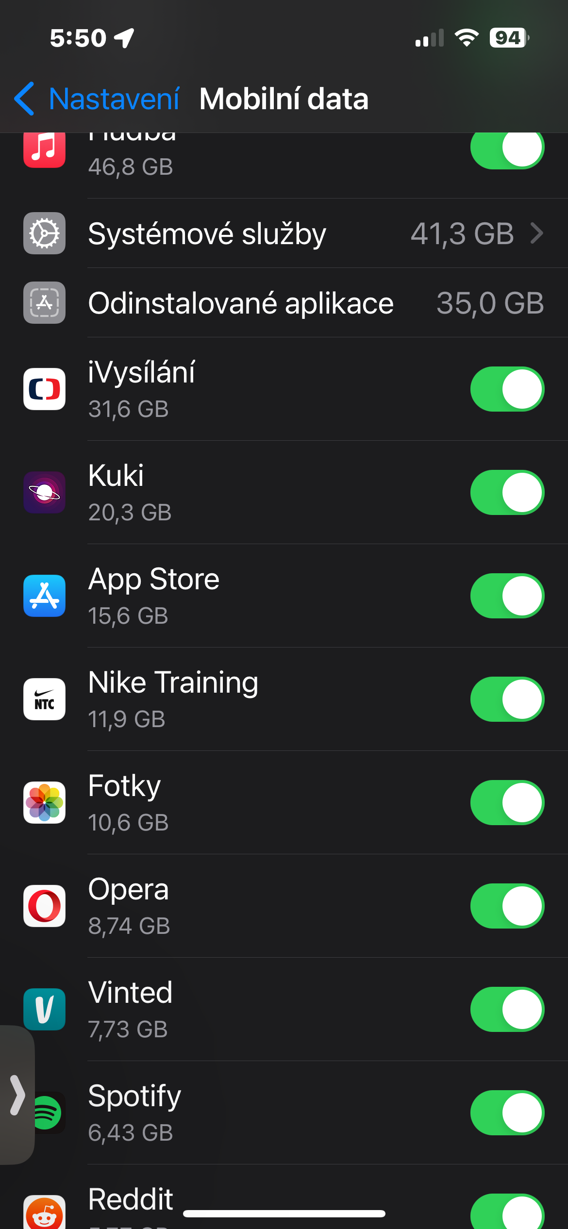 Výchozí nastavení na iPhonu umožňuje všem aplikacím přístup k mobilním datům, pokud nejsou data úplně vypnuta. U nepoužívaných aplikací můžete tuto možnost zakázat v Nastavení -> Mobilní data. Najděte seznam aplikací a vypněte přepínač pro aplikace, které nemáte v plánu používat. Můžete také zkontrolovat, kolik dat jednotlivé aplikace využily v nedávném období, což vám pomůže rozhodnout.