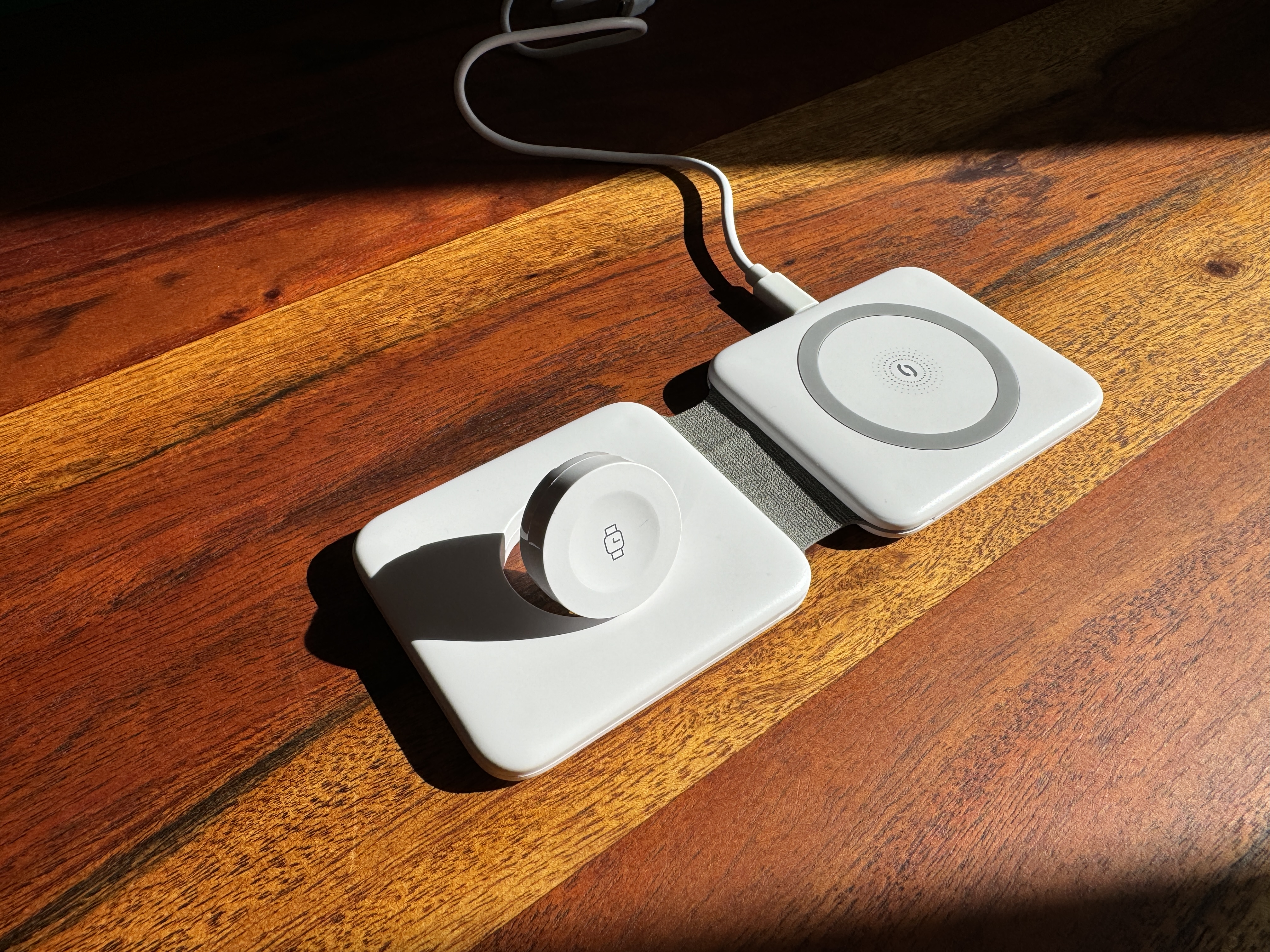 Celá nabíječka potřebuje jeden USB-C kabel, který je součástí balení. Vedle portu, do kterého jej zapojíte, se nachází dvě malé LED diody informující o stavu nabíjení na jedné a druhé podložce. Je však potřeba počítat s tím, že diody překryje telefon. Samotná nabíječka má nabíjecí výkon 2.5W pro hodinky a 15W pro telefon, ovšem zároveň má také maximálně 15W celkový výkon, proto pokud nabíjíte hodinky, telefon budete nabíjet maximálně 12,5 W. V případě iPhone se pak dostáváte na rychlost nabíjení 5 až 7,5W, protože nabíječka nemá certifikaci MagSafe.