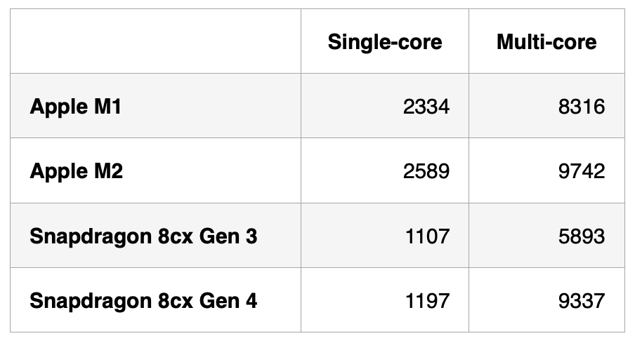 Testy Geekbench nového procesoru Qualcomm odhalují jednojádrové skóre 1197 a multi-core výsledek 9337. Snapdragon 8cx Gen 4 má osm výkonných jader narozdíl od čipů M1 a M2, kde jsou tato čtyři. Další čtyři jádra nového čipu Qualcommu jsou určena pro zvýšení efektivity, čímž se od Applu neliší. Jak si ale všechny tyto čipy stojí ve srovnání?