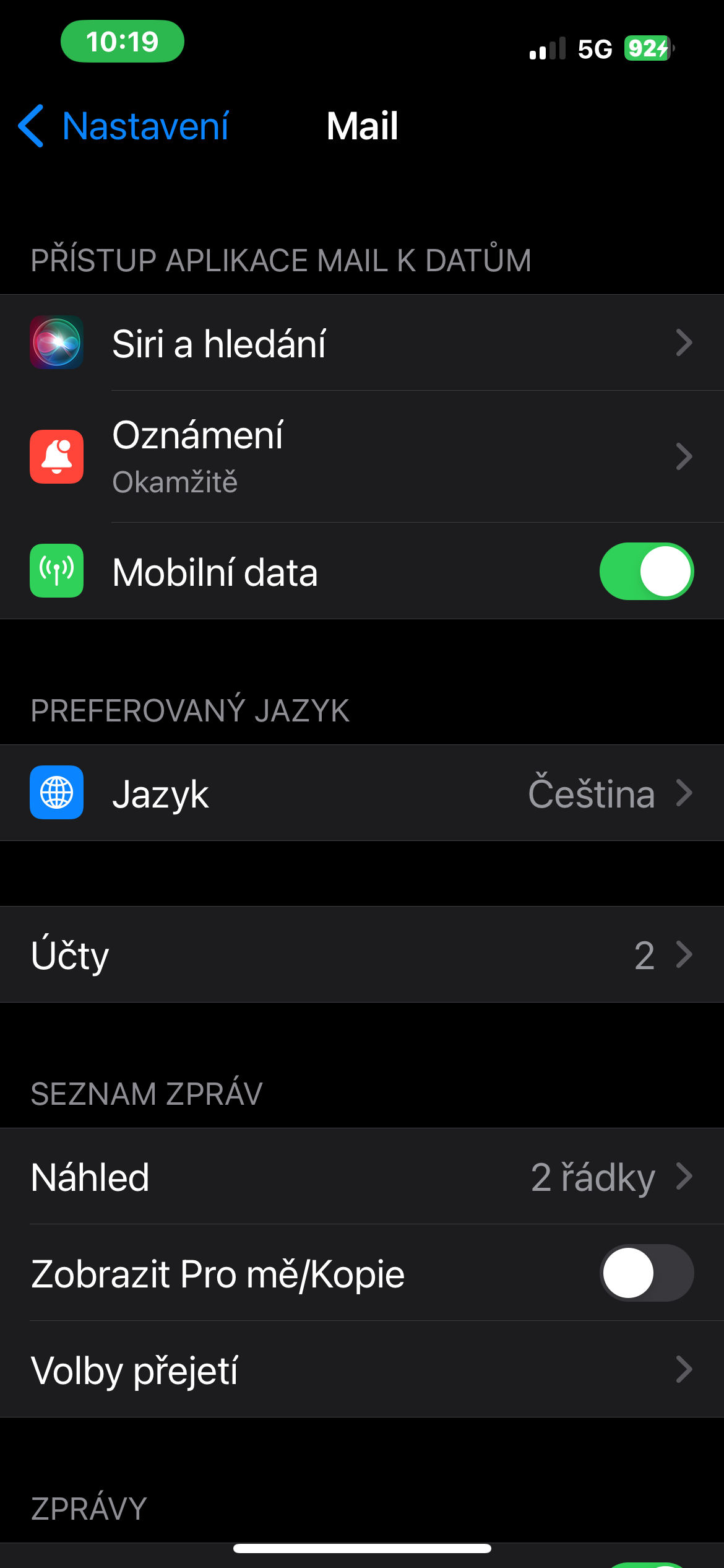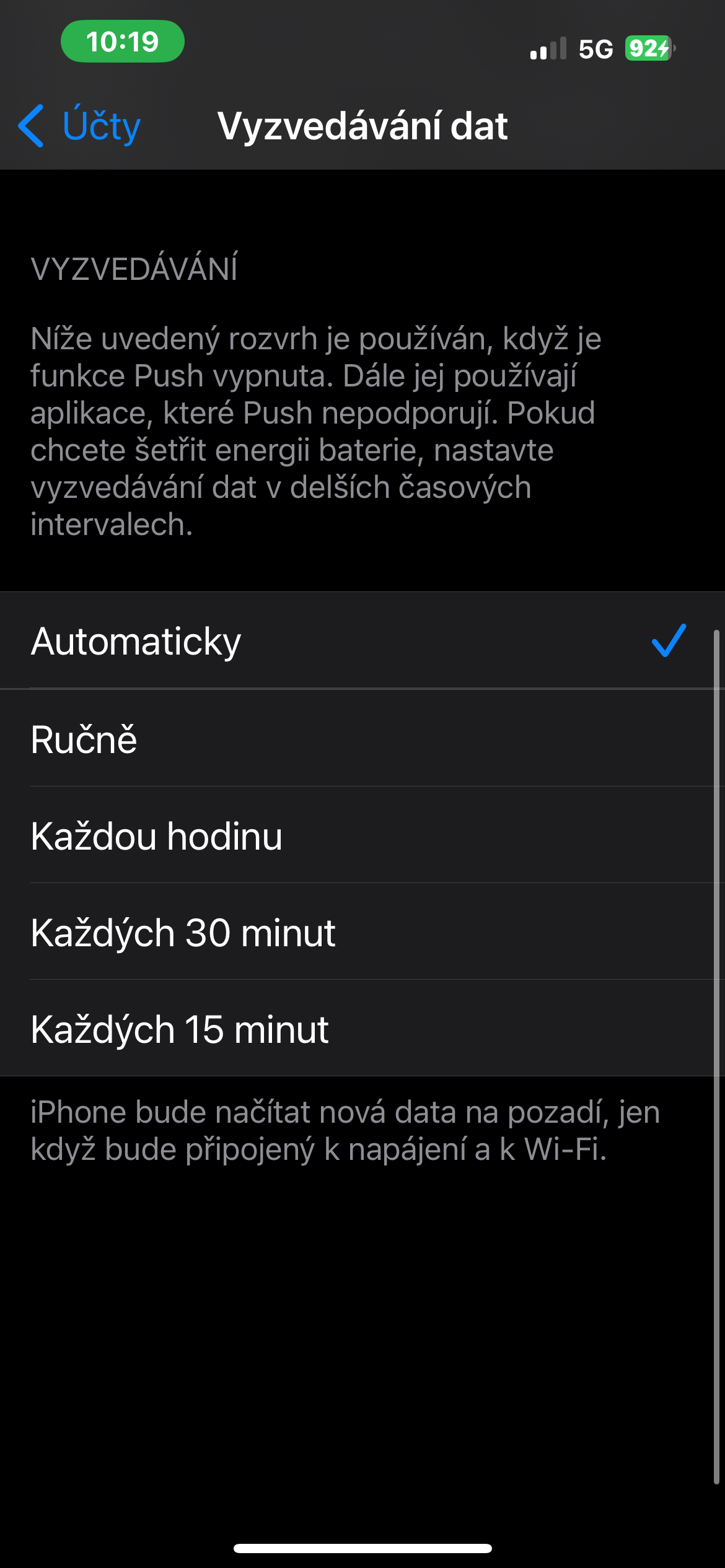 Na spotřebu baterie vašeho iPhonu může mít vliv i to, s jakou pravidelností systém vyzvedává e-mailové zprávy v nativním Mailu. Pro změnu tohoto nastavení spusťte na iPhonu Nastavení -> Mail -> Účty, klepněte na Vyzvedávání dat a nastavte vámi požadovaný interval.