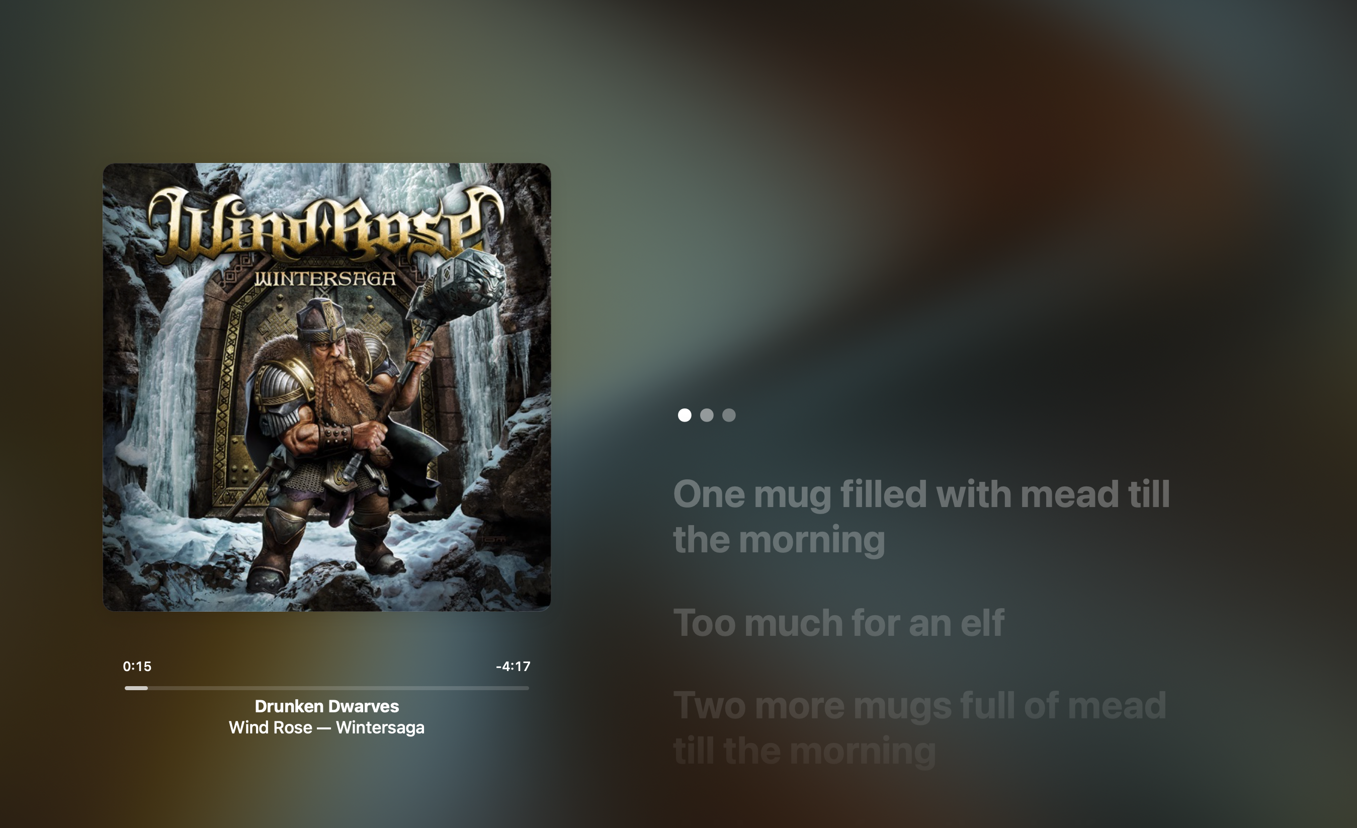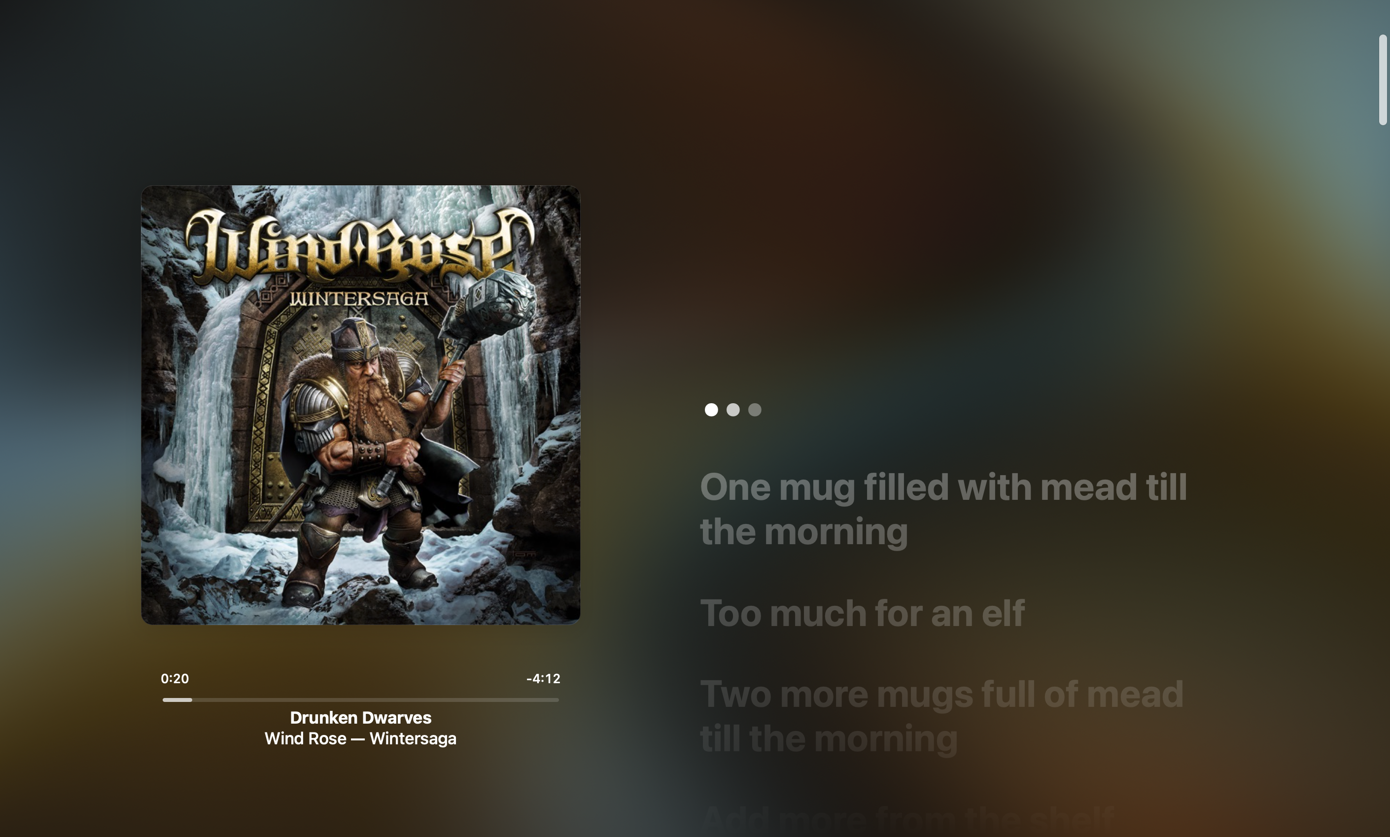 Rozhraní pro texty písní na celé obrazovce v Macu zobrazuje obal alba, vizualizační pozadí podle barvy alba a ovládací prvky přehrávání. Na ovládací prvky přehrávání můžete najet myší a najít další možnosti. Pokud skladba nemá k dispozici text, při vstupu do celoobrazovkového režimu se zobrazí pouze obal alba a ovládací prvky přehrávání.