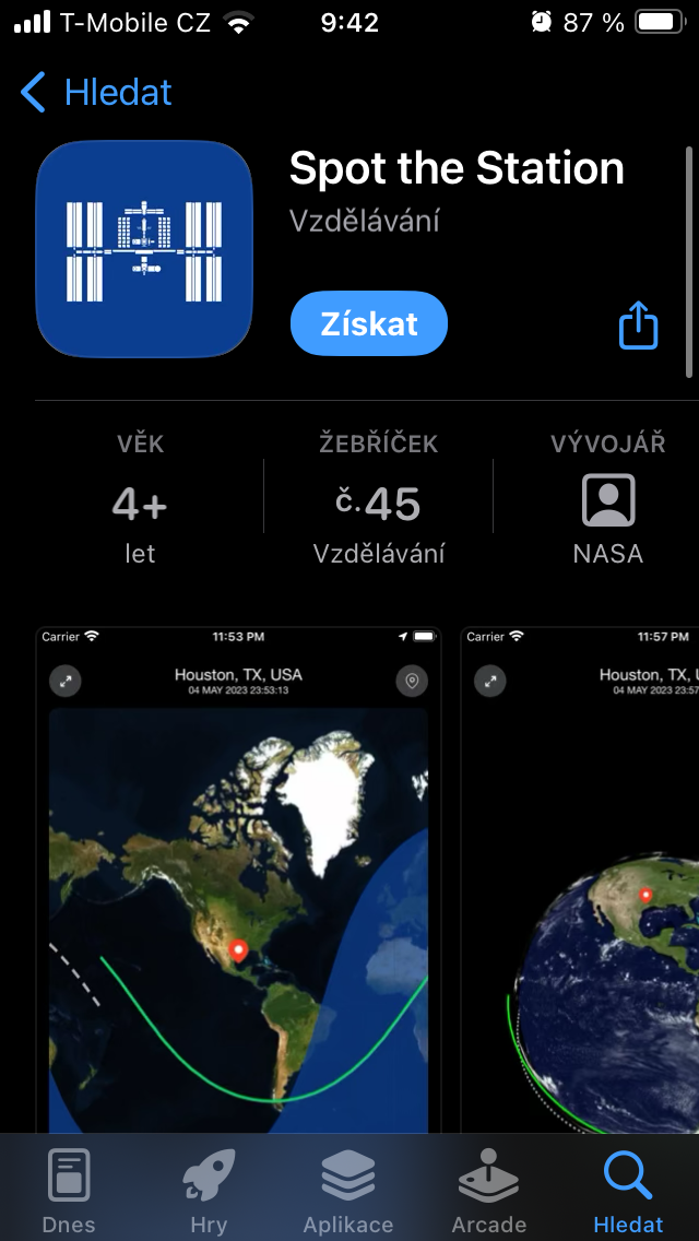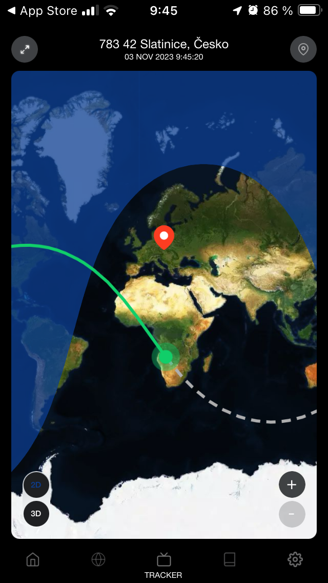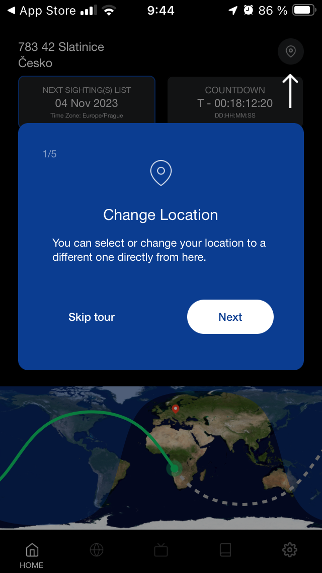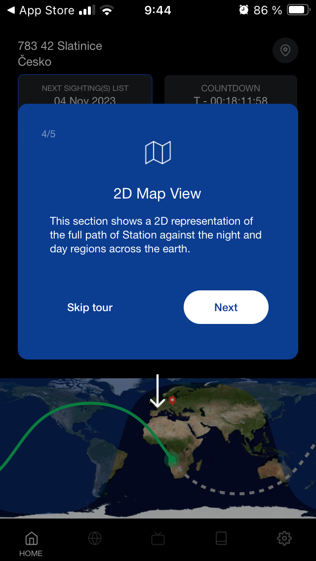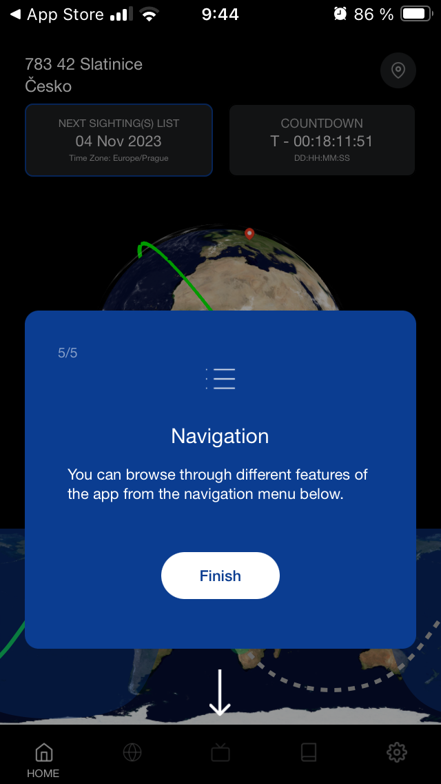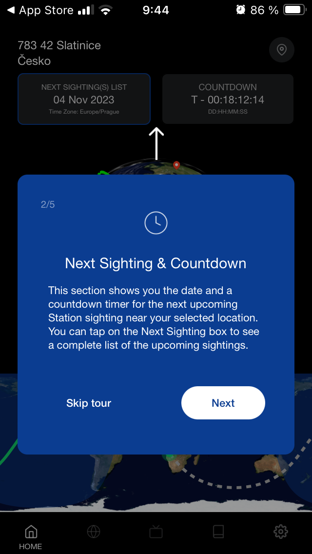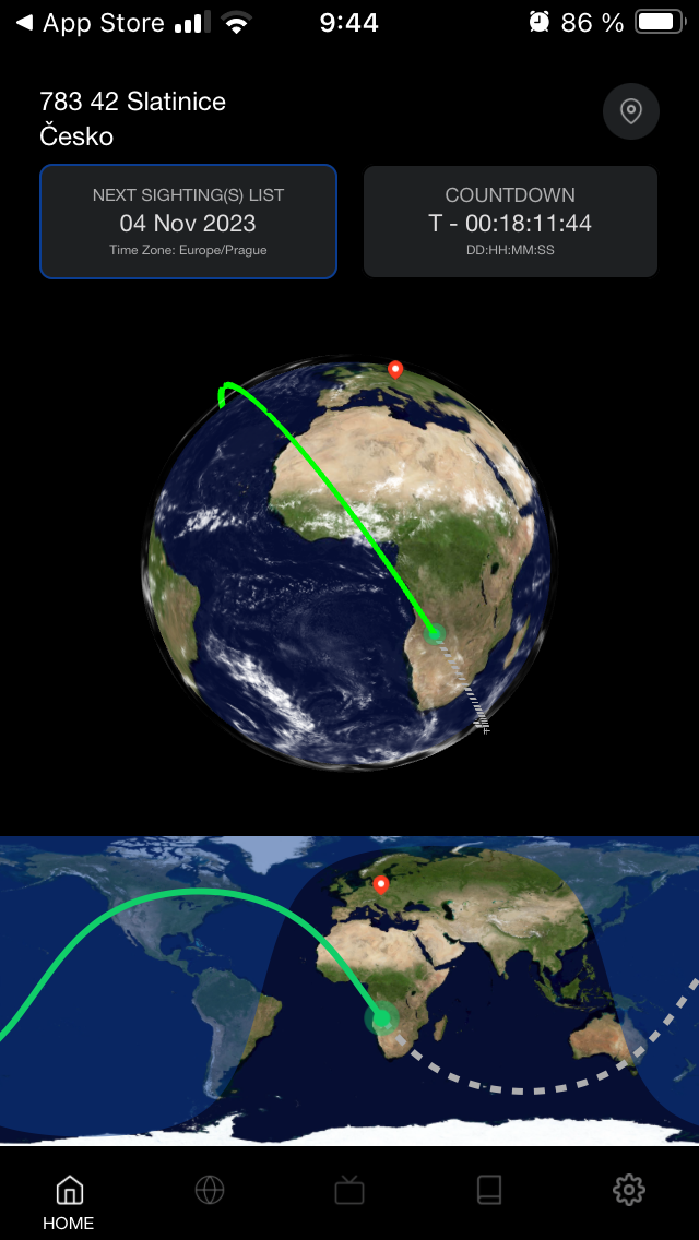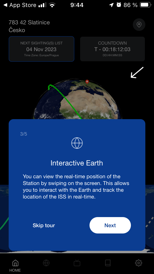 Hlavní stránka aplikace nabízí odpočítávání do dalšího možného pozorování a také glóbus se zobrazením aktuální polohy ISS. Ten je pod volbou nabídky aplikace „Tracker“ k dispozici přes celý prostor displeje s možností přiblížení. Lze také zapnout upozornění, abyste průlet nezmeškali.