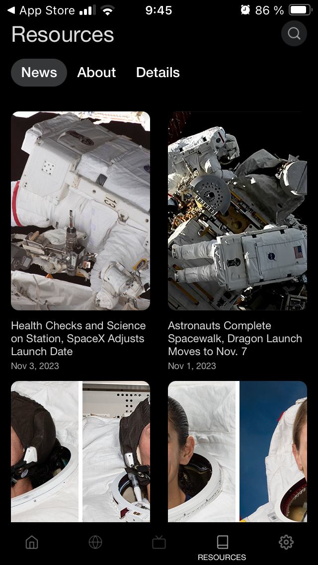 Pod ikonou „Resources“ se pak nachází množství článků zabývajících se nejnovějšími událostmi, probíhajícími projekty ISS i činností posádky na vesmírné stanici společně s některými základními fakty o jejím fungování i historii.