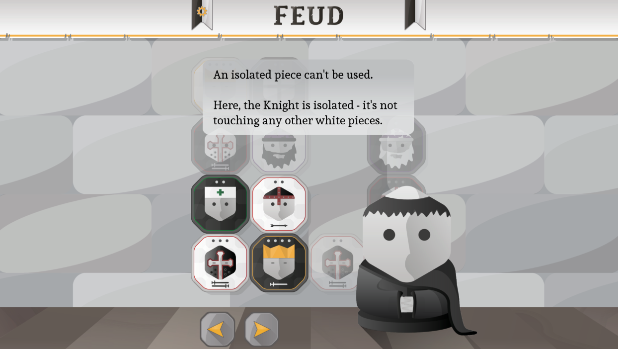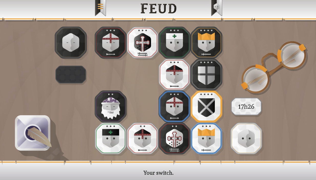 Feud je tahová strategická hra, která potrápí vaše mozkové závity. Vyměňujte figurky na mřížce 4 x 4, abyste izolovali soupeřovy figurky, nebo jděte rovnou po jeho králi. Zdokonalte své dovednosti proti třem postavám s umělou inteligencí s odlišnými herními styly a pak vyzvěte své přátele online nebo na stejné obrazovce.