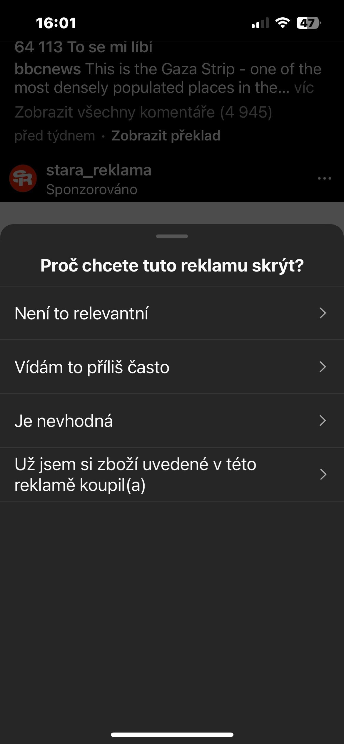 Reklam na Instagramu denně přibývá, ale když narazíte na nerelevantní reklamy, začne to být otravné a nepříjemné. Můžete je tedy skrýt. Jak na to? Klepněte na ikonku tří teček u příslušného reklamního příspěvku, zvolte Skrýt reklamu a nakonec vyberte důvod.