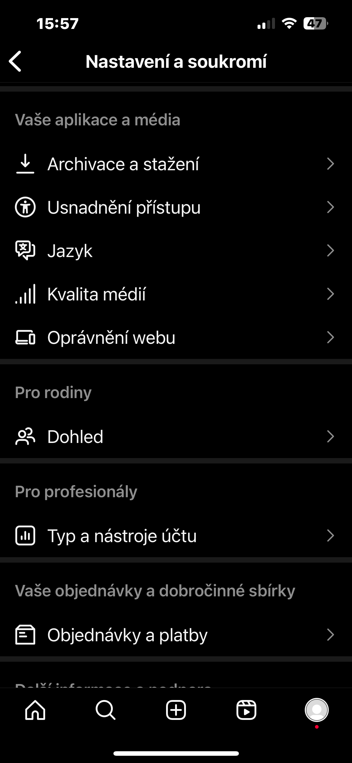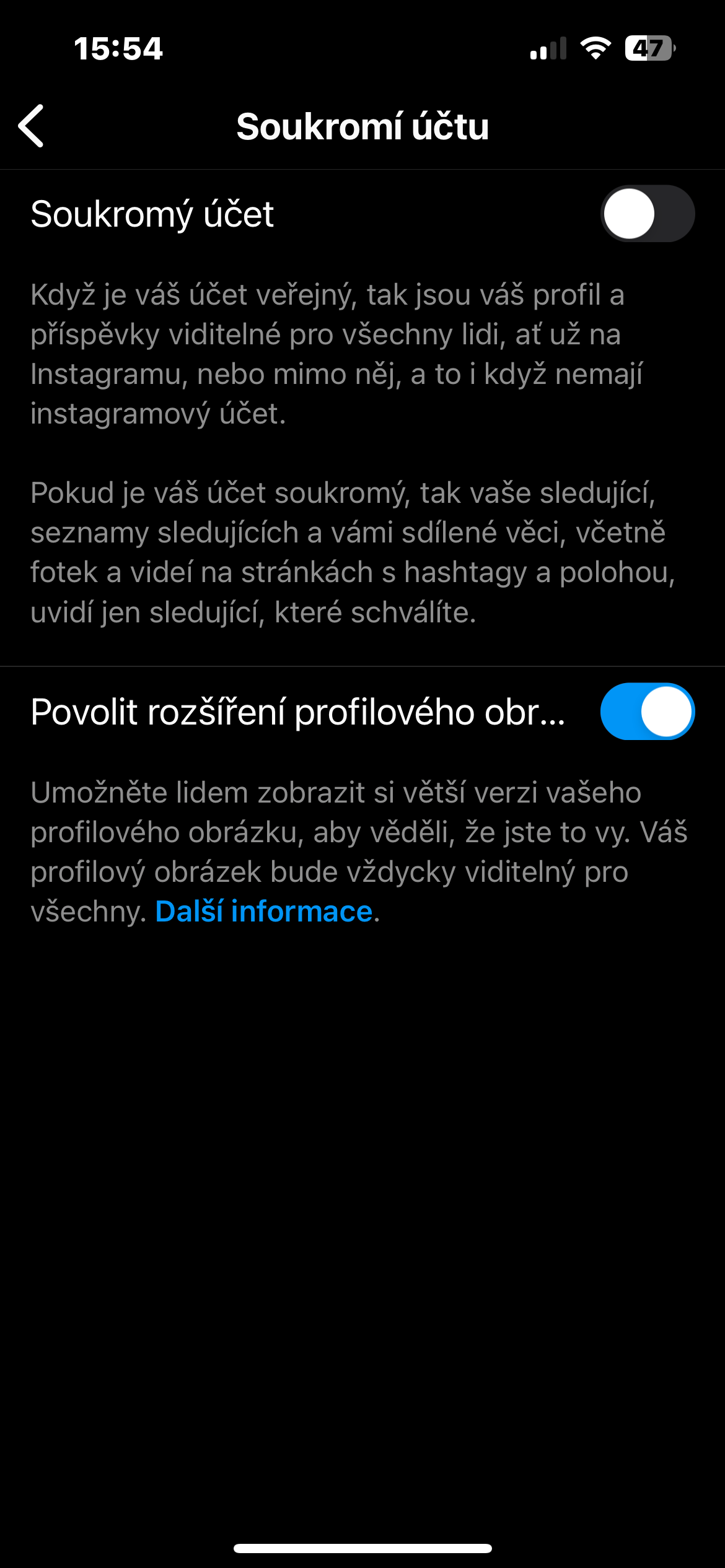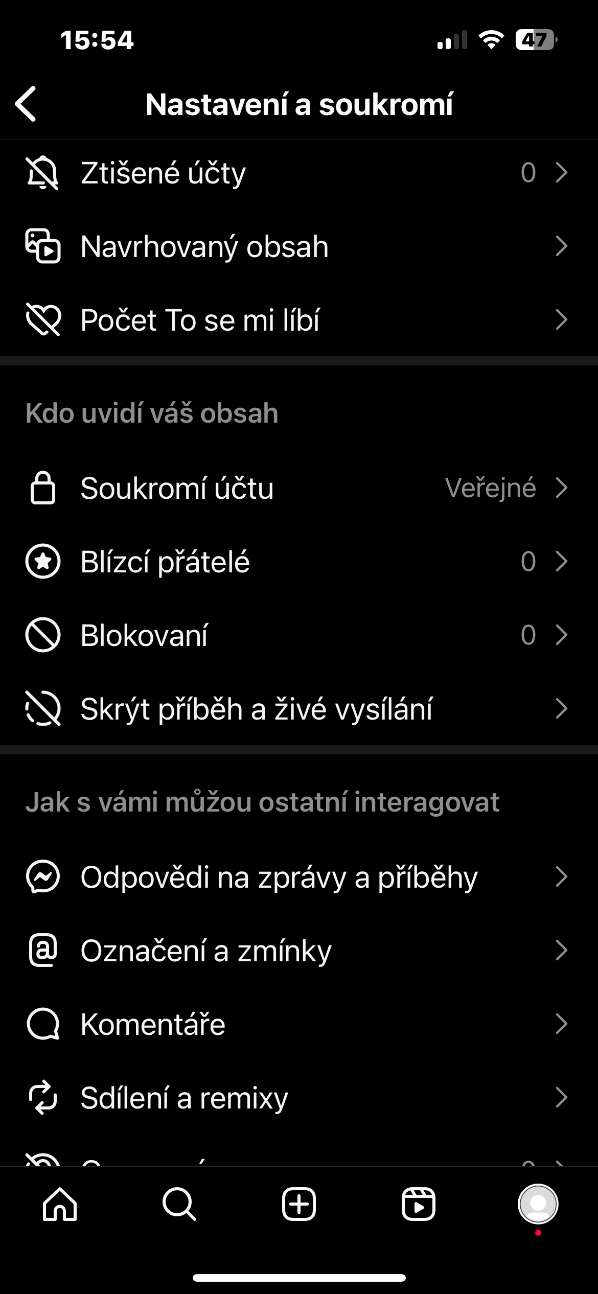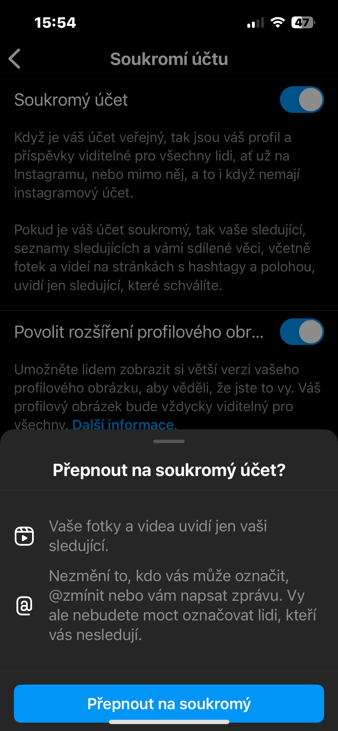 Nastavili jste si váš profil při zakládání Instagramu jako veřejný a chtěli byste to změnit? Spusťte Instagram, klepněte na ikonku vašeho profilu v pravém dolním rohu a poté vpravo nahoře na ikonku vodorovných linek. Zvolte Nastavení a soukromí -> Soukromí účtu, a aktivujte položku Soukromý účet.