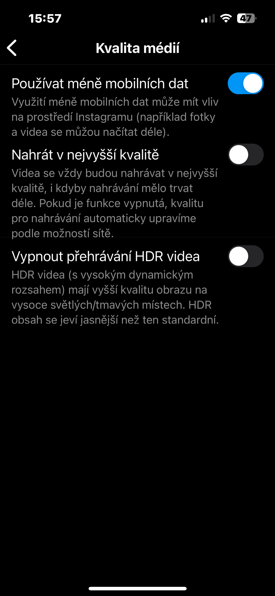 Pokud máte špatný signál nebo nedostatek dat, tato funkce vám pomůže. Mějte však na paměti, že vám to může zpomalit užívání Instagramu v danou chvíli, protože načítání médií bude trvat delší dobu. Klepněte na ikonku vašeho profilu -> Ikonka vodorovných linek -> Nastavení a soukromí. Zvolte Kvalita médií a aktivujte položku Používat méně mobilních dat.