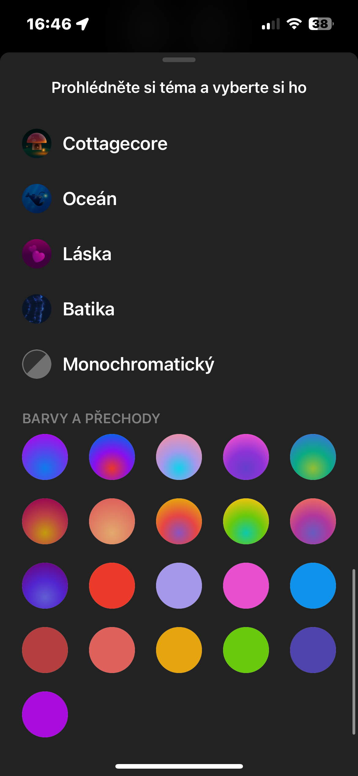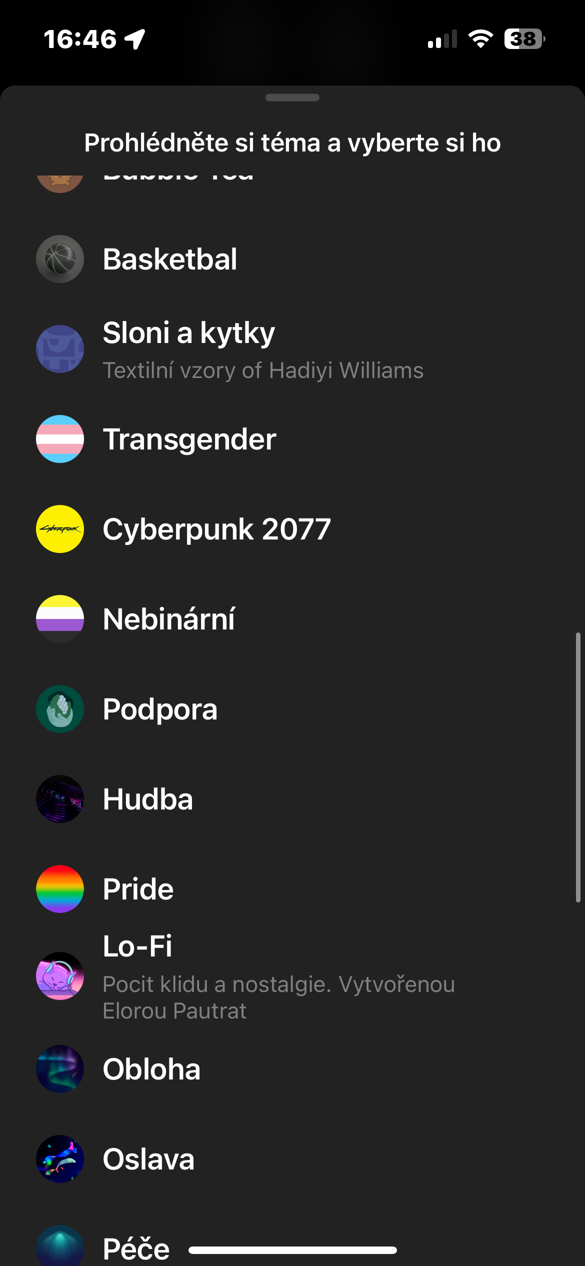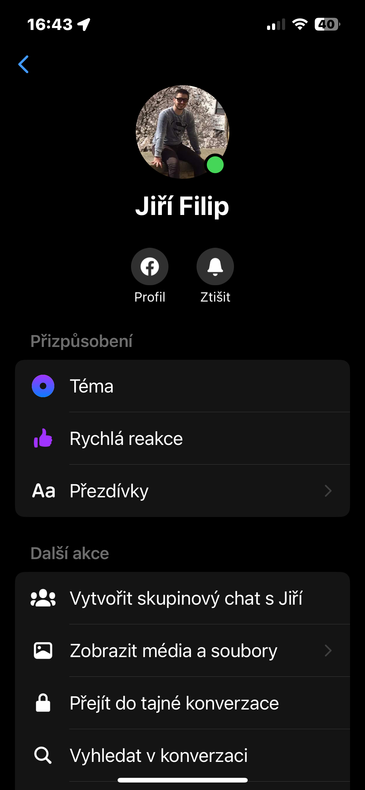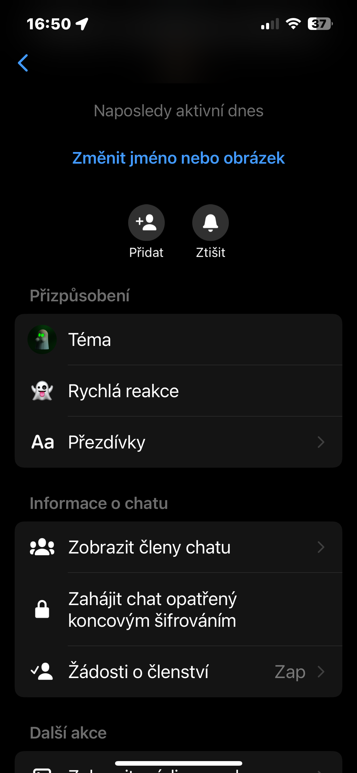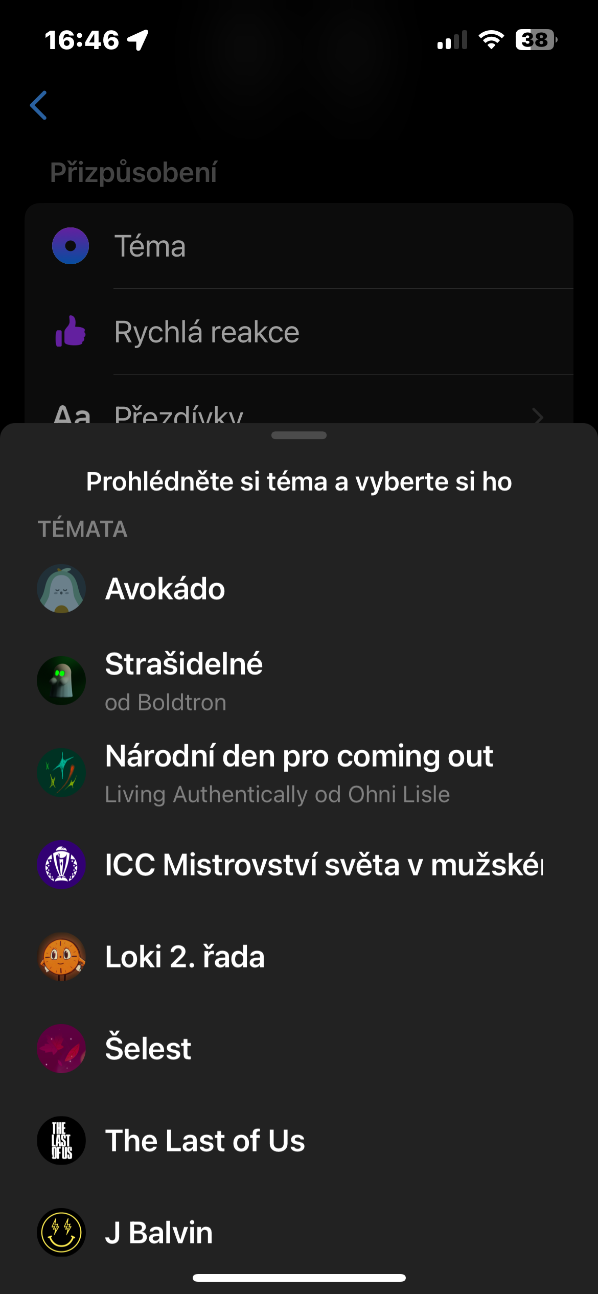 Otevřete chat s přítelem nebo skupinou, klepněte na jméno v horní části chatu a zobrazí se seznam možností, které vám umožní například ztlumit oznámení na určitou dobu, přidat přezdívku, vybrat barvu nebo emoji pro konverzaci a přidat další osoby. Klepnutím na Téma můžete přizpůsobit vzhled a téma chatu.