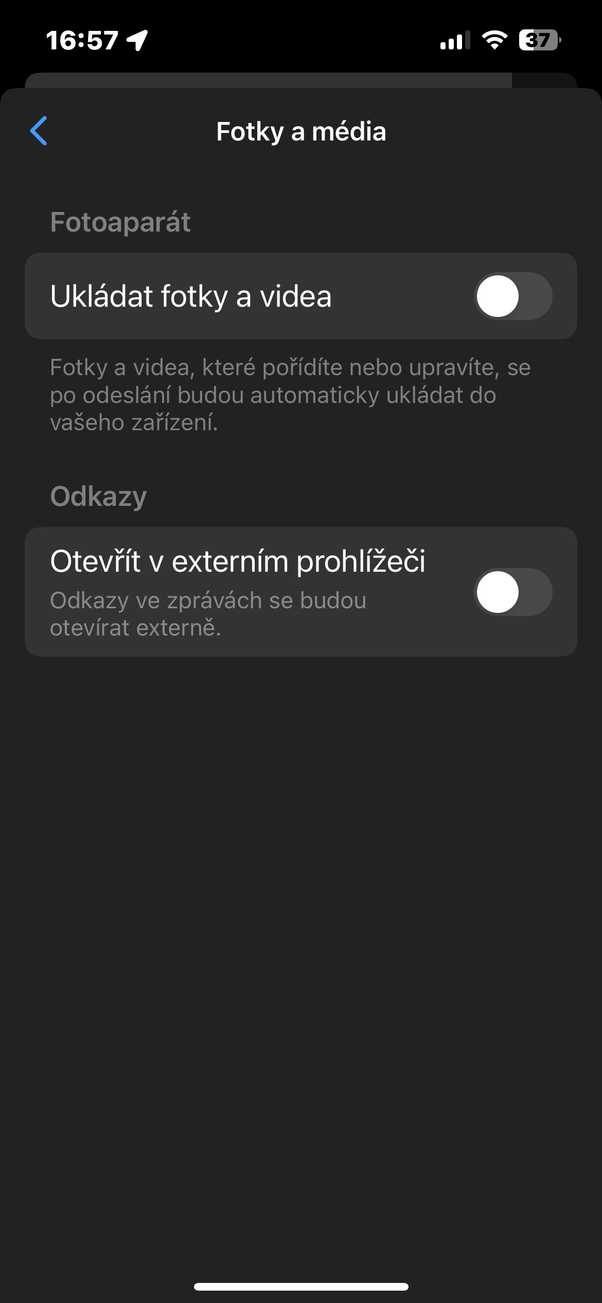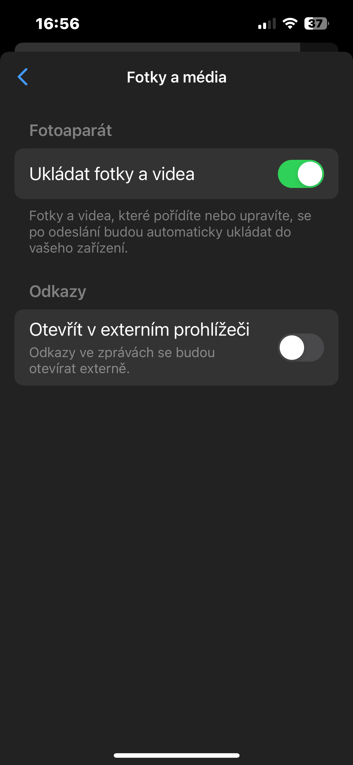 Pokud chcete, aby se fotografie z Messengeru, které pořídíte nebo upravíte, automaticky ukládaly na úložiště vašeho iPhonu, klepněte na ikonku vodorovných linek -> Ikonka ozubeného kolečka -> Fotka a média. Zde aktivujte položku Ukládat fotky a videa.