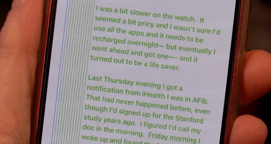 „Jednoho pátečního rána jsem dostala na hodinky oznámení o fibrilaci AFIB,“ řekla žena a dále rozvedla okolnosti osudového dne s tím, že se obrátila na svoji šéfovou a vyjádřila nejistý postoj k návštěvě lékaře. Zvažovala, zda k tomu přistoupí po plánované raní schůzce, nebo počká do víkendu, jak se její stav vyvine. K tomu se jí dostalo odpovědi: „Musíš jít hned.“