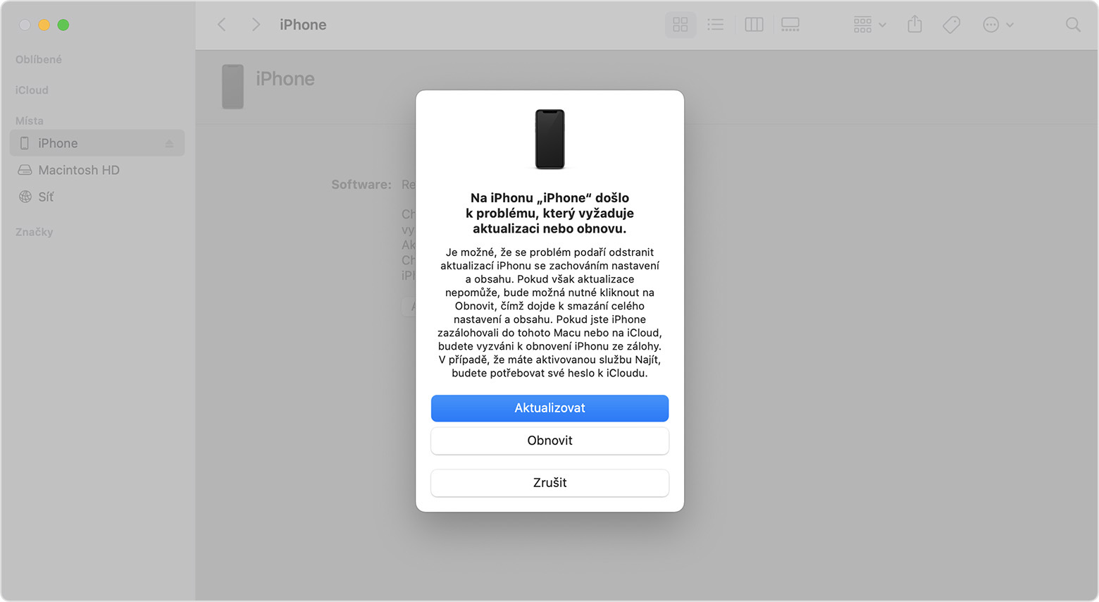 Příčiny problémů se zapínáním iPhonu mohou být různé, a někdy může pomoci obnovení přes iTunes či Finder. Připojte váš iPhone k Macu či jinému počítači za pomoci Lightning kabelu. Na Macu spusťte Finder, na ostatních počítačích iTunes. Automaticky by se vám měla zobrazit zpráva o tom, že na vašem zařízení došlo k problémům. Nejprve zkuste aktualizaci, při které nepřijdete o žádná data. Pokud aktualizace nepomůže, přistupte k obnovení přes iTunes / Finder, zde je ale již riziko ztráty nezálohovaných dat.