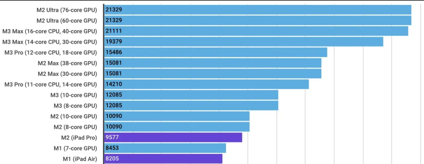 Znamená to tedy, že nejlepší čip, který se nachází v laptopech od Applu, se nyní vyrovná nejvýkonnějším čipům pro desktopové Macy, které jsou součástí modelů Mac Studio a Mac Pro. Čip M3 Max má oproti předchozímu M2 Max vyšší výkon díky přechodu na 3nm proces. Nabízí také více výkonných jader (12 oproti 8). M2 Ultra je stále jedničkou, ovšem velmi přesně. V žebříčku si obě konfigurace M2 Ultra udržely první a druhou pozici, ale nejvyšší verze M3 Max je jen o zlomek pozadu. Nižší model M3 Pro se nachází za oběma variantami M2 Max. Nezbývá tedy než čekat, jak si v testech povede zatím neuvedený M3 Ultra – s jeho uvedením si ale Apple zatím dává na čas. Všechna srovnání jsou provedena v programu Geekbench 6 Multi-core.