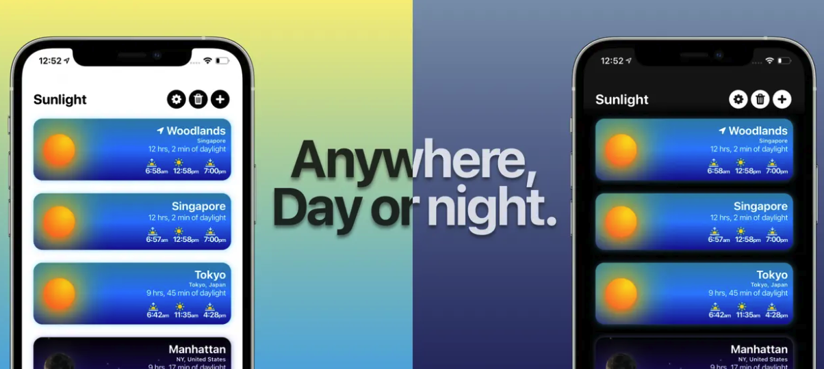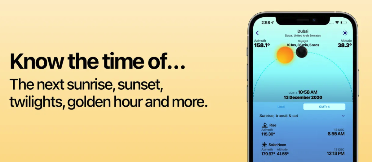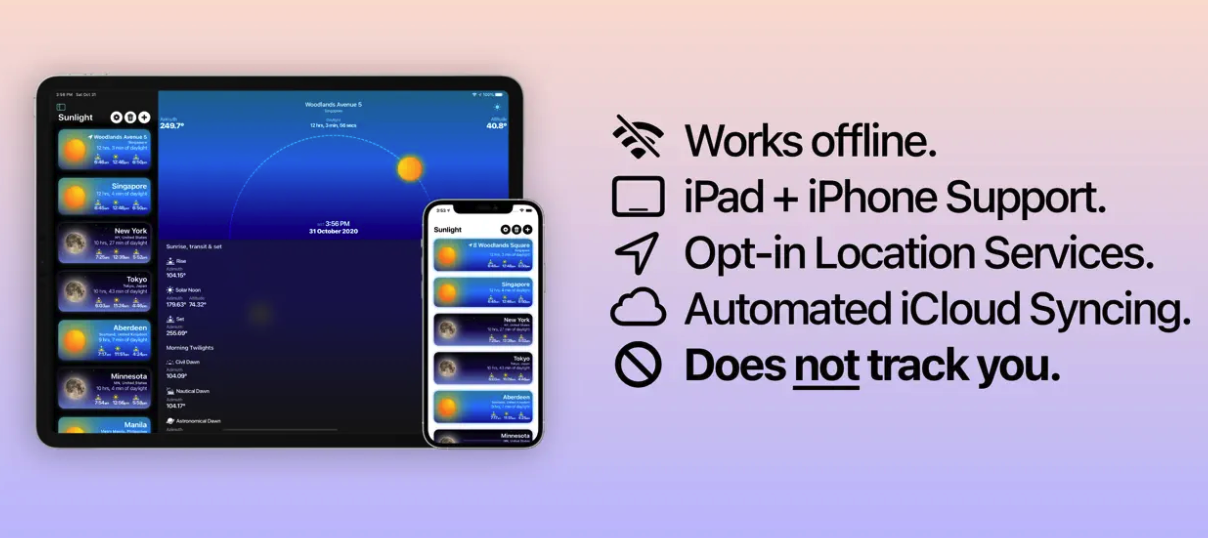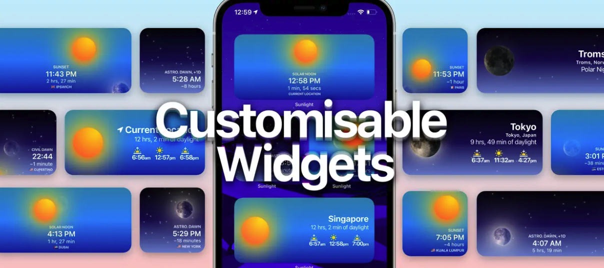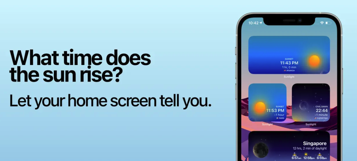 Pomocí aplikace Sunlight vám plocha vašeho iPhonu či jeho uzamčená obrazovka ukáže, kdy vás čeká další východ slunce. Ať už chcete jednoduše sledovat nádherný pohled na východ slunce, nebo zachytit ty nejlepší záběry krajiny během krásného období zlaté hodiny, Sunlight je pro vás ideální aplikací. Aplikace Sunlight nabízí skvěle zpracované, přizpůsobitelné widgety, které vám umožní sledovat časy východu a západu slunce na různých místech kdekoli na Zemi spolu s fázemi Měsíce, procenty osvětlení a dalšími údaji.