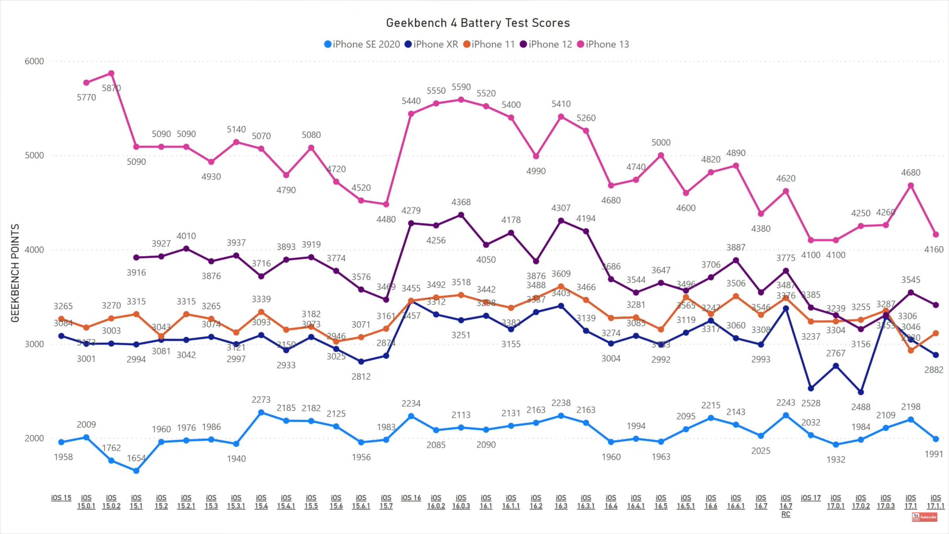 Jak lze vidět z tabulky pod odstavcem, tato aktualizace se zřejmě úplně nepovedla. Až na iPhone 11 všechny testované modely na výdrži baterie v bodovém hodnocení aplikace GeekBench ztratily. Obzvláště znepokojující je výsledek iPhonu 13, jenž dosáhl v testu na 4160 bodů. Od svého vydání pouze na dvou verzích iOS byl výsledek horší, a to na 17.0 a 17.0.1, kdy obdržel shodně 4100 bodů. Na iOS 15.0.2, tedy o dva roky zpět, měl tento model celkem 5870 bodů. Apple má tedy rozhodně co dohánět. Jaká je po aktualizaci na iOS 17.1.1 výdrž vašeho zařízení?