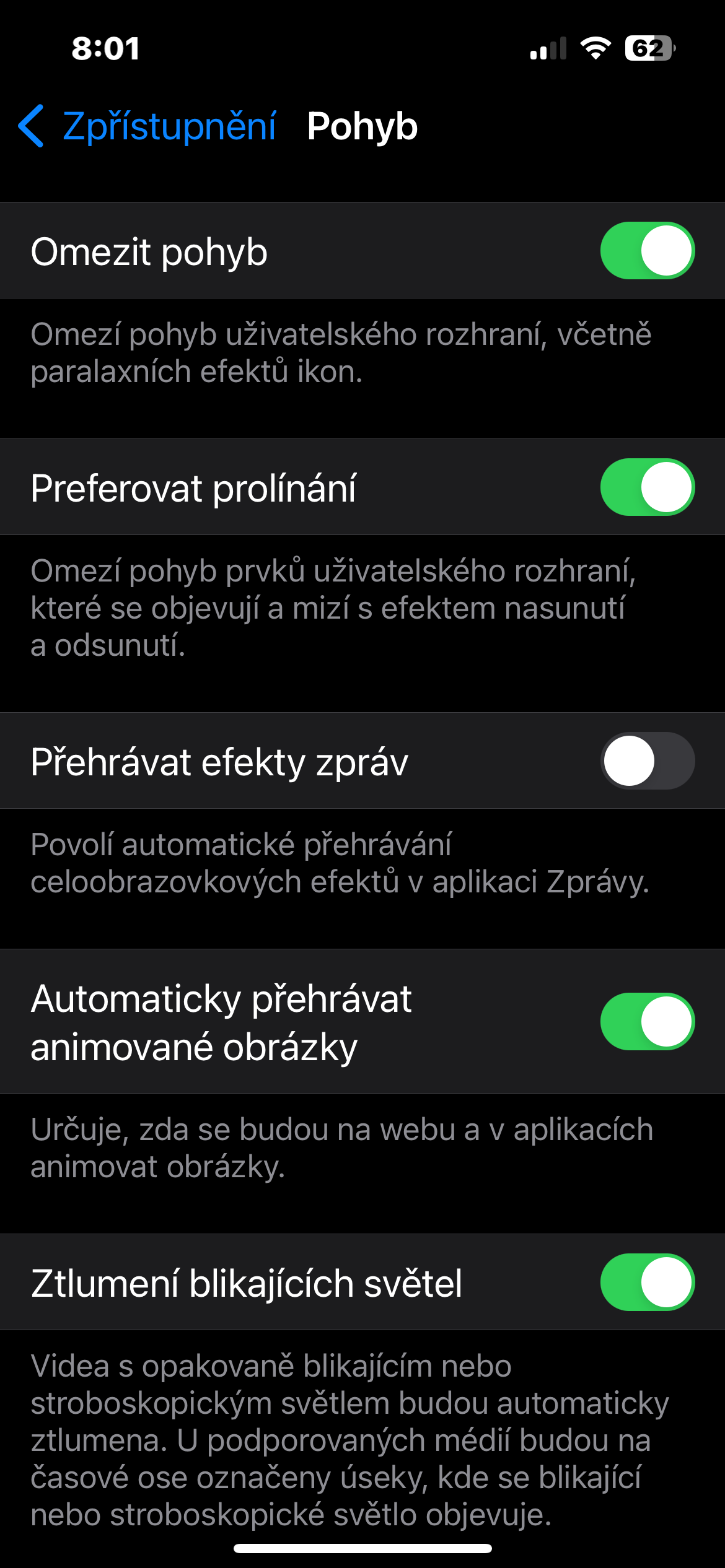 • V Nastavení -> Zpřístupnění -> Pohyb zkontrolujte, zda není aktivována položka Omezit pohyb.
