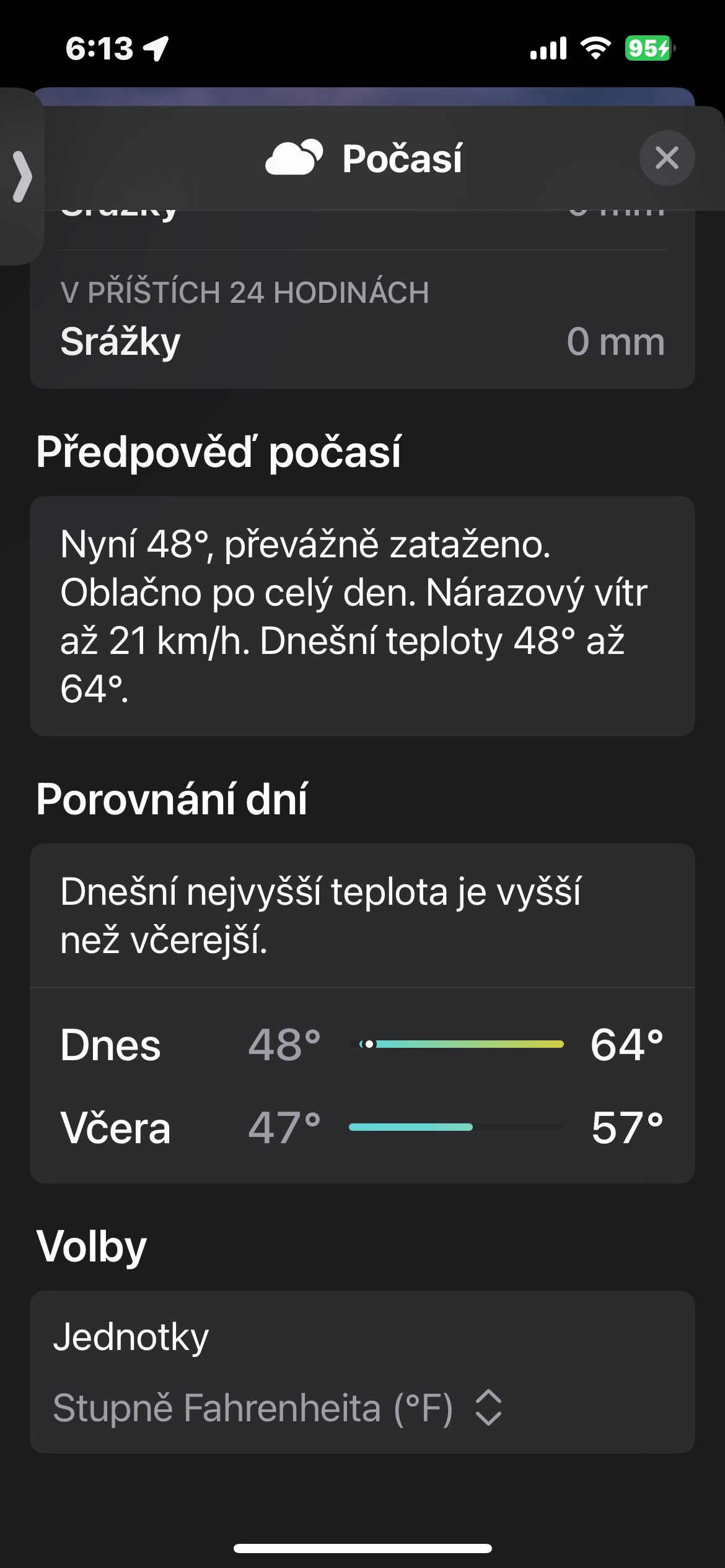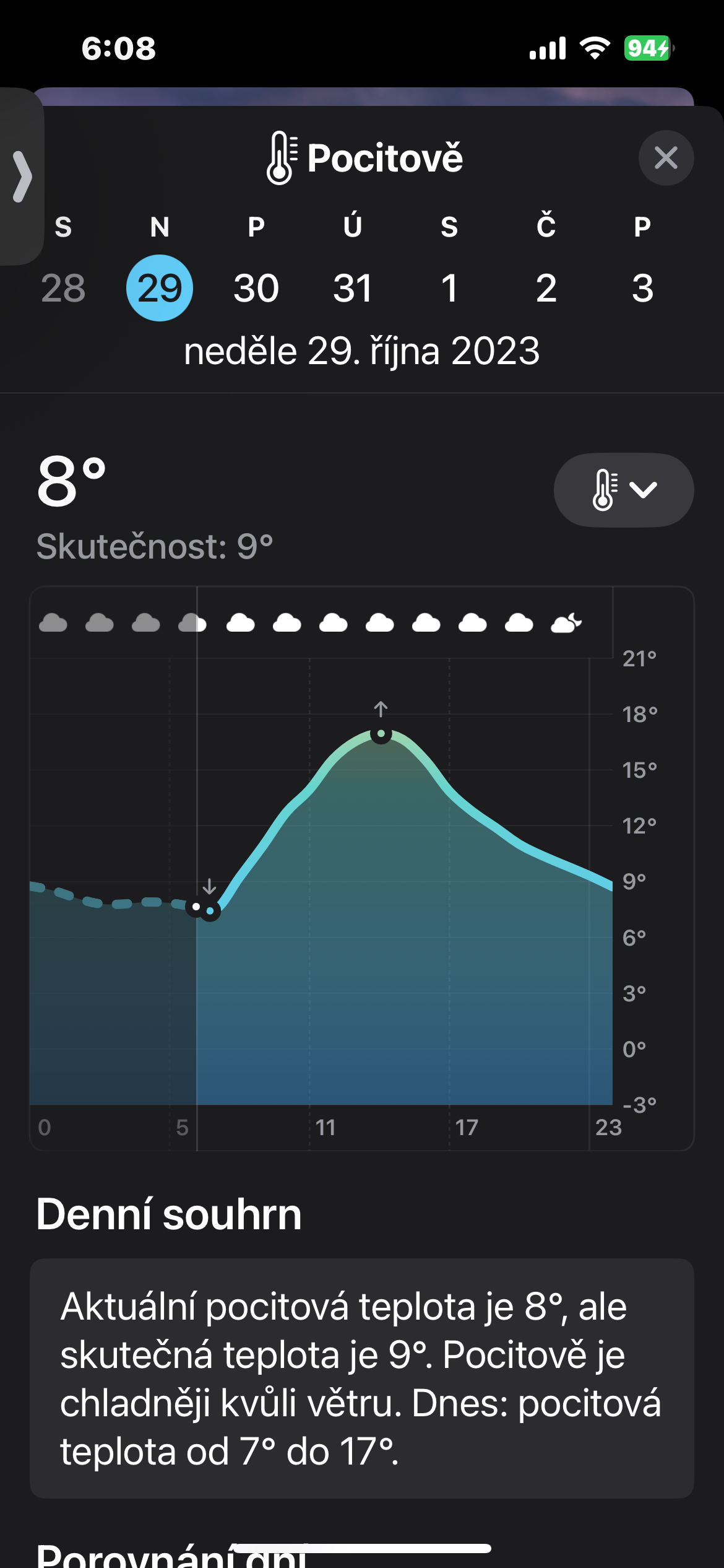 Nativní Počasí v iOS 17 nabízí také možnost zobrazení teploty aktuálního a předešlého dne. Klepněte na vybranou lokalitu a poté klepněte na údaj o teplotě v kartě s 10denní předpovědí. Nakonec stačí už jen zamířit o něco níže a zkontrolovat příslušné údaje v sekci Porovnání dní.
