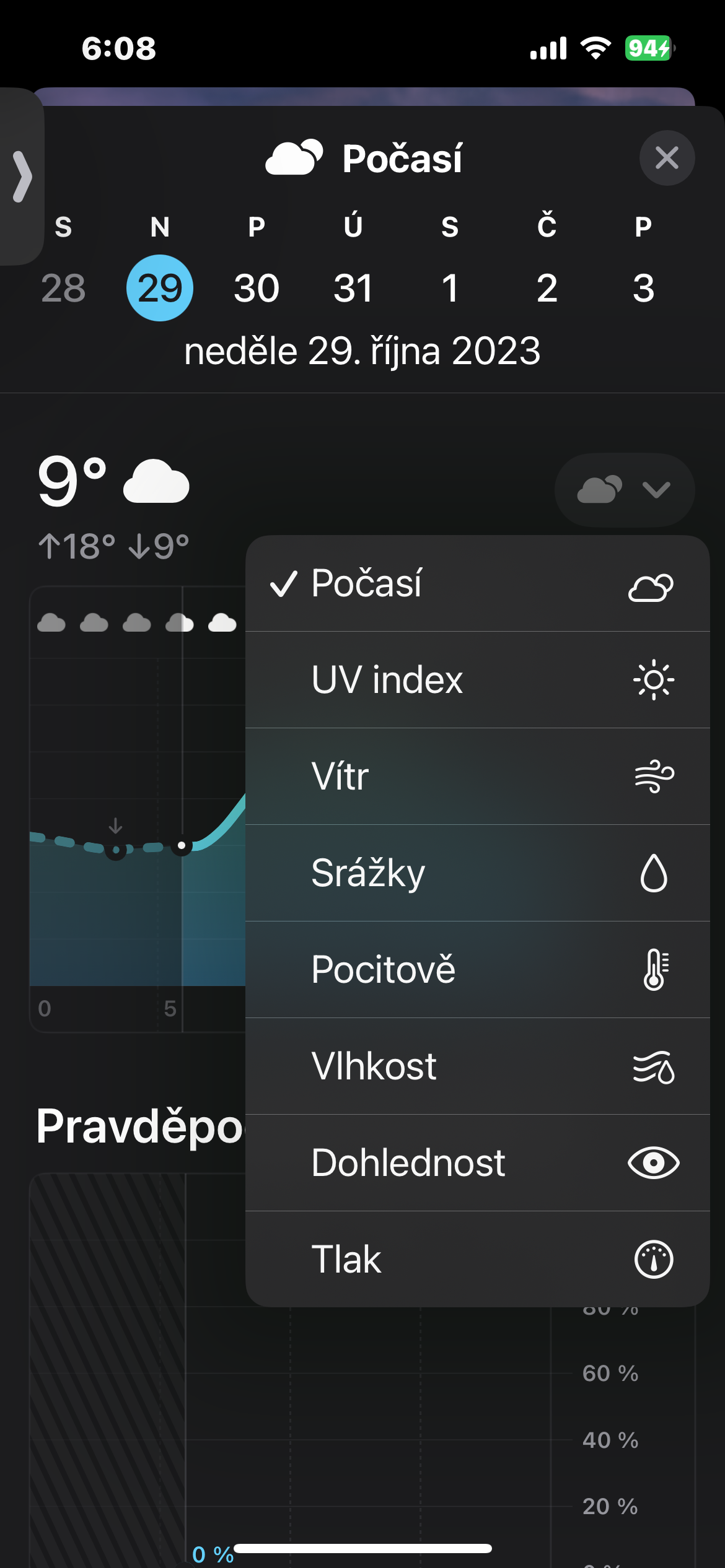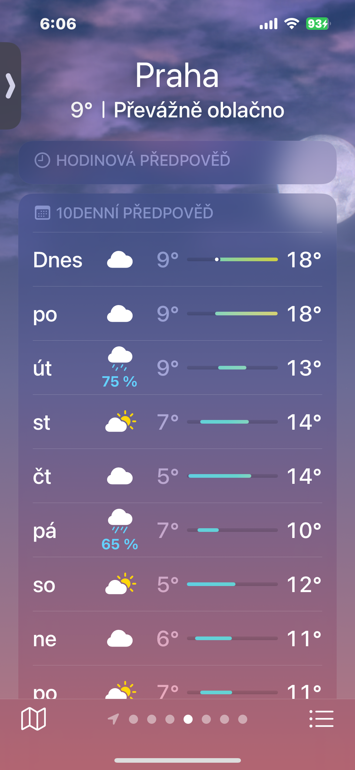 Pokud u vybrané lokality klepnete na kartu 10denní předpověď, můžete kromě teploty sledovat řadu dalších podmínek. V grafu s teplotou můžete po klepnutí na rozbalovací menu s ikonkou mraku vybrat, zda chcete přepnout na graf s UV indexem, větrem, srážkami nebo jinými podmínkami. Pod tímto grafem najdete také denní souhrn, stručné porovnání dní a vysvětlivky.