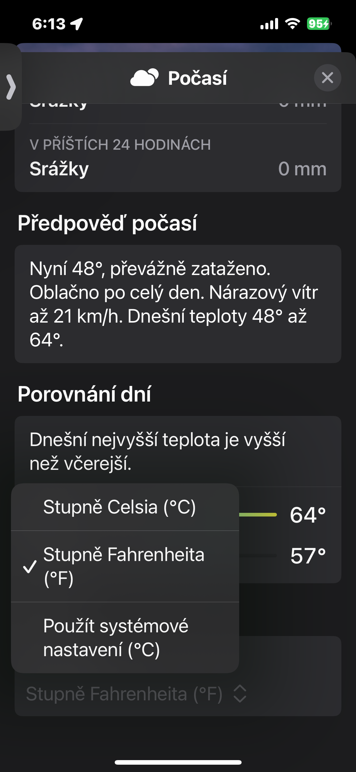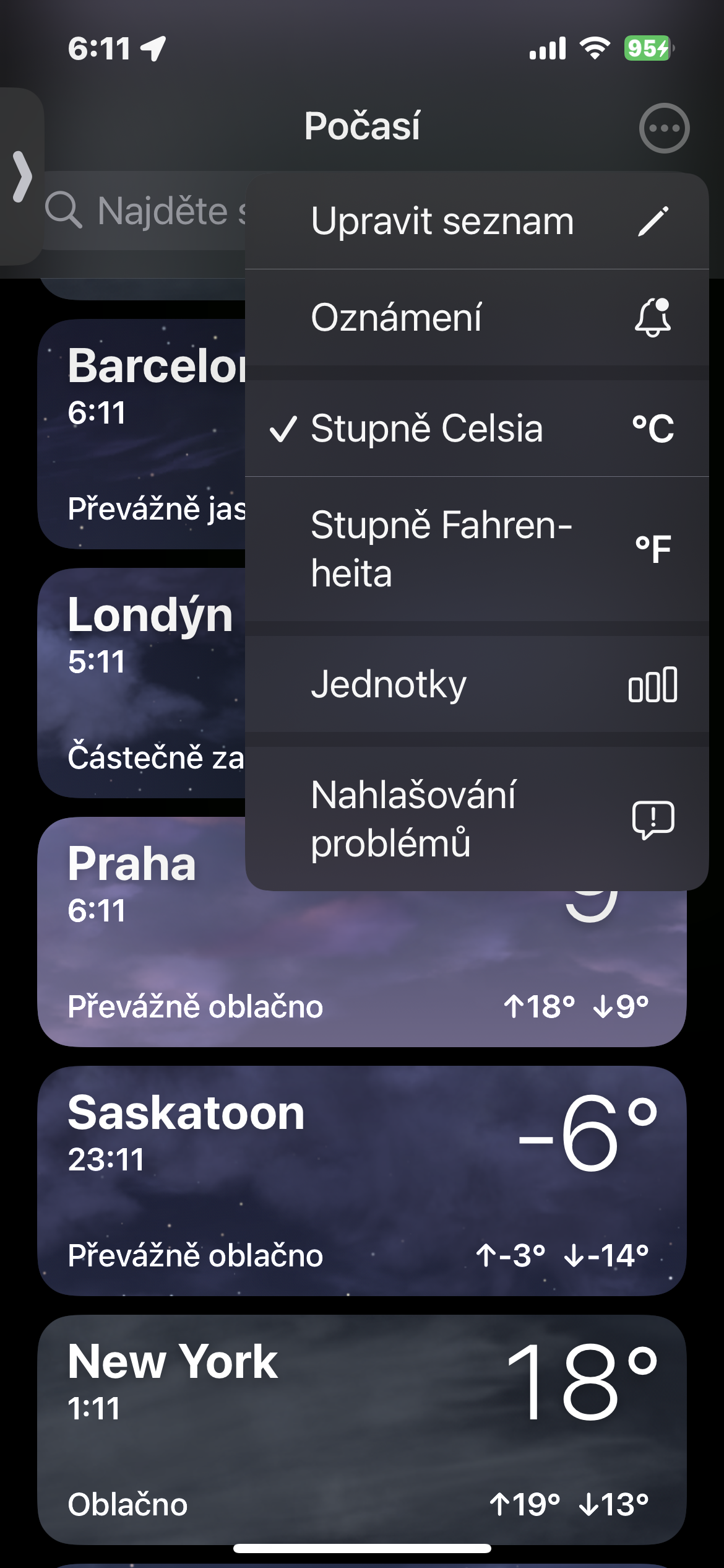 V nativním Počasí najdete hned několik způsobů, jak přepínat mezi jednotkami teploty. V hlavním přehledu s lokalitami můžete klepnout na ikonku tří teček v kroužku v pravém horním rohu a v menu, které se vám zobrazí, zvolit požadované jednotky. Můžete ale také u vybrané lokality klepnout na kartu s 10denní předpovědí nebo výhledem na celý den, zamířit zcela dolů a přepnout na jiné jednotky teploty.