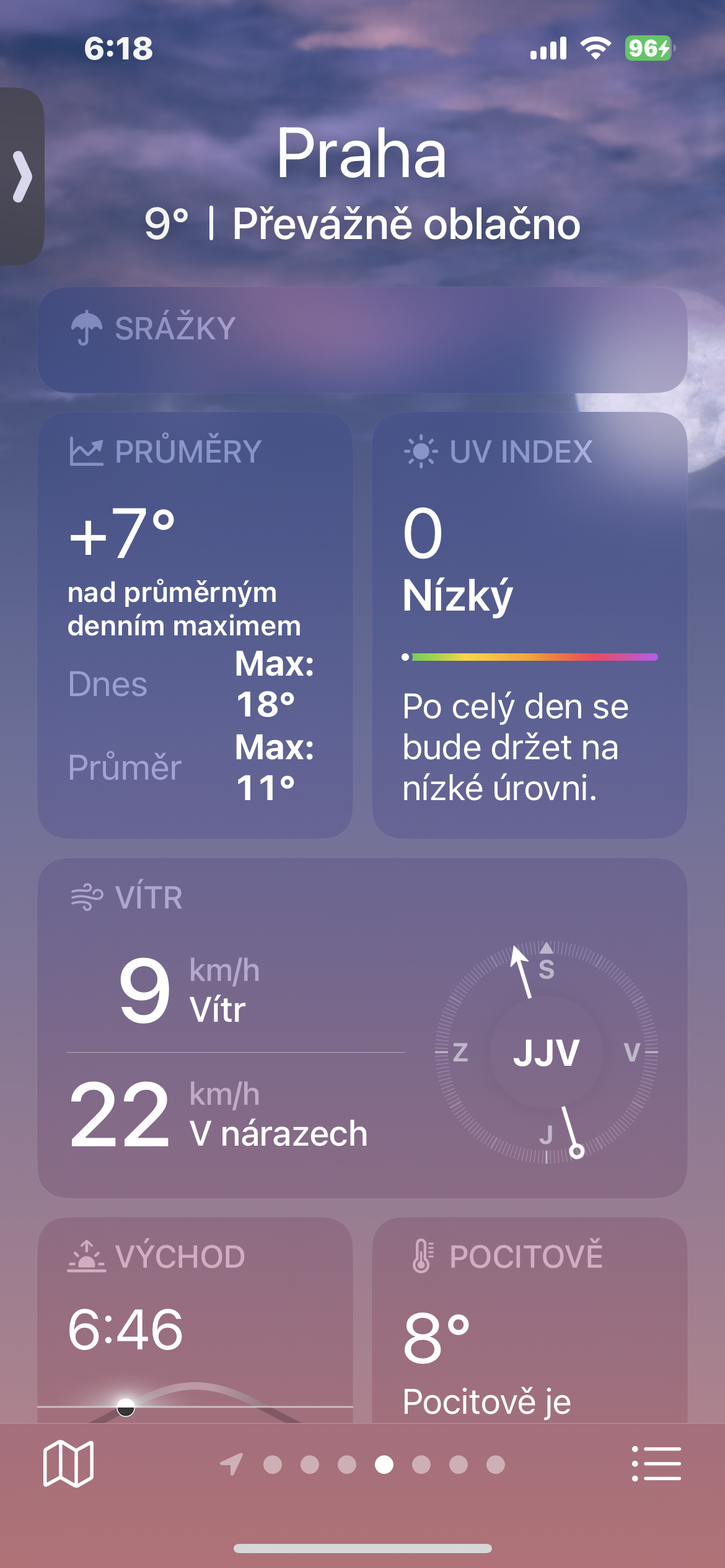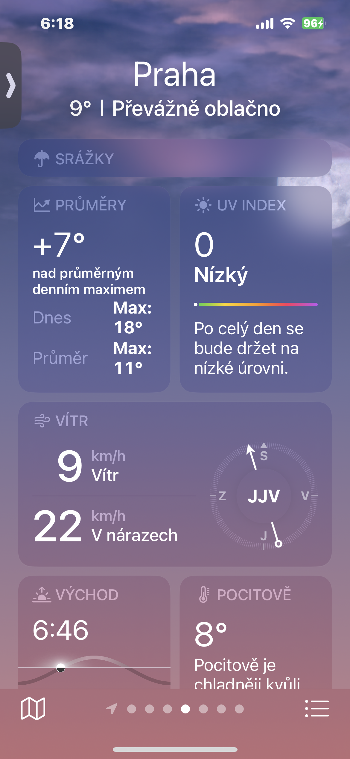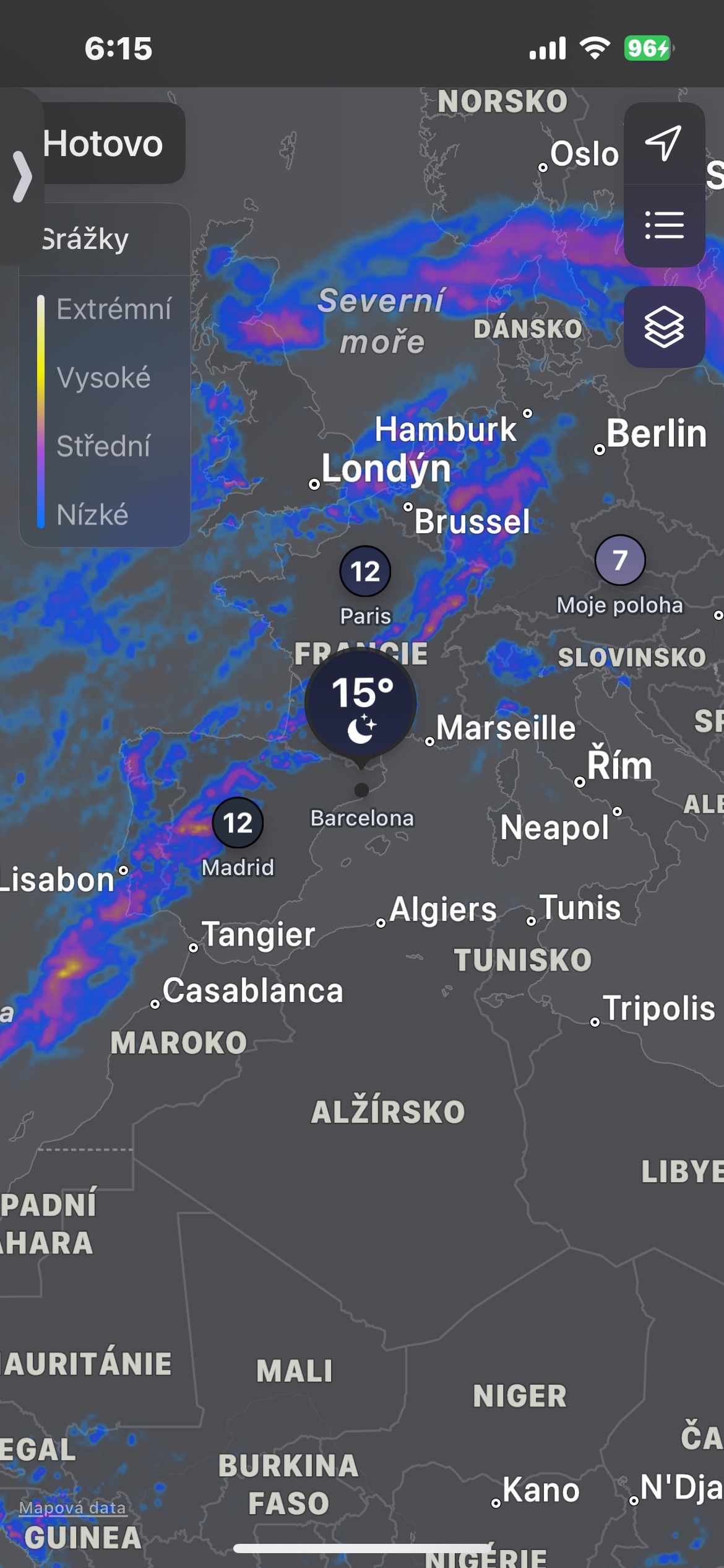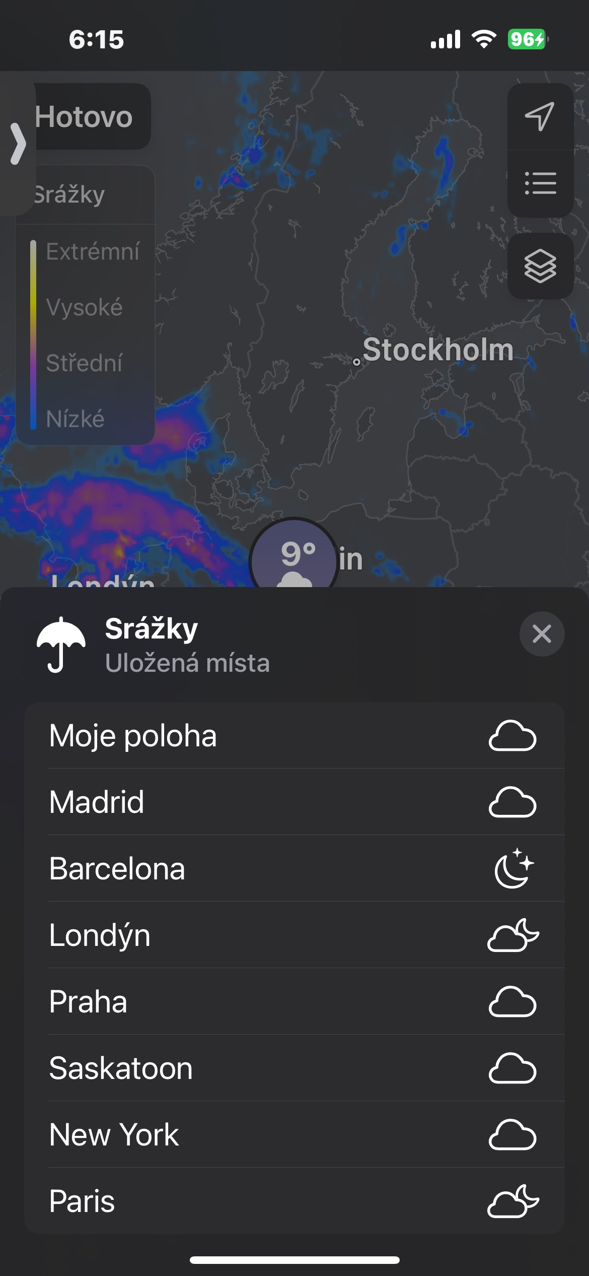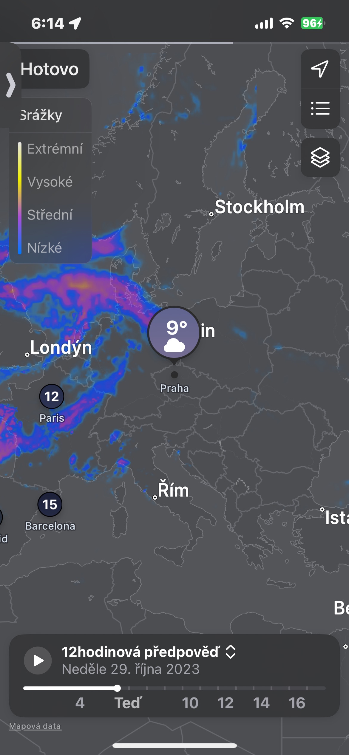 V nativním Počasí na vašem iPhonu můžete využít také interaktivní mapu srážek. Vyberte požadovanou oblast a zamiřte o něco níže k náhledu mapy s nápisem Srážky. Klepnutím mapu zvětšíte, za pomoci ovládacího prvku ve spodní části displeje můžete přehrát animaci vývoje srážek, klepnutím na ikonku vodorovných linek vpravo nahoře můžete snadno a rychle změnit lokalitu.