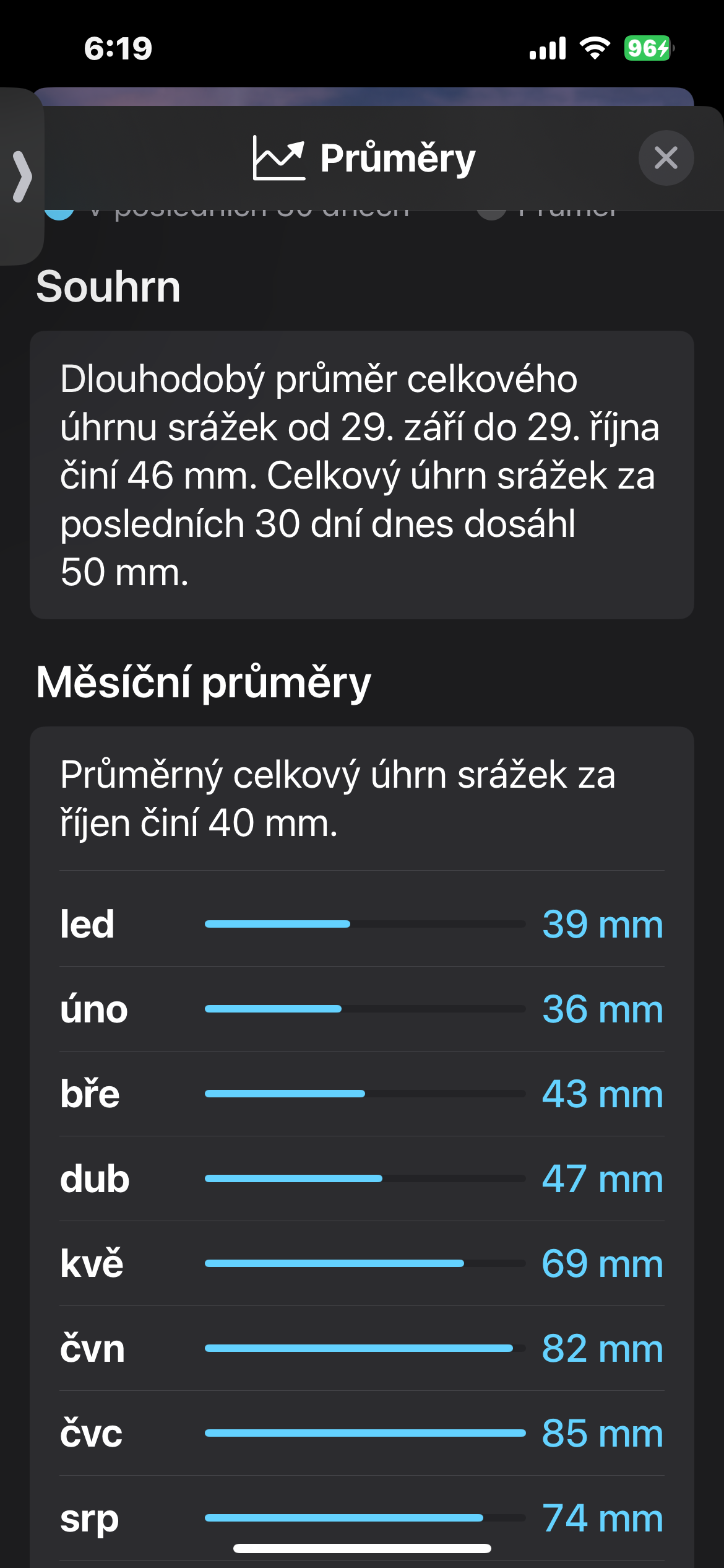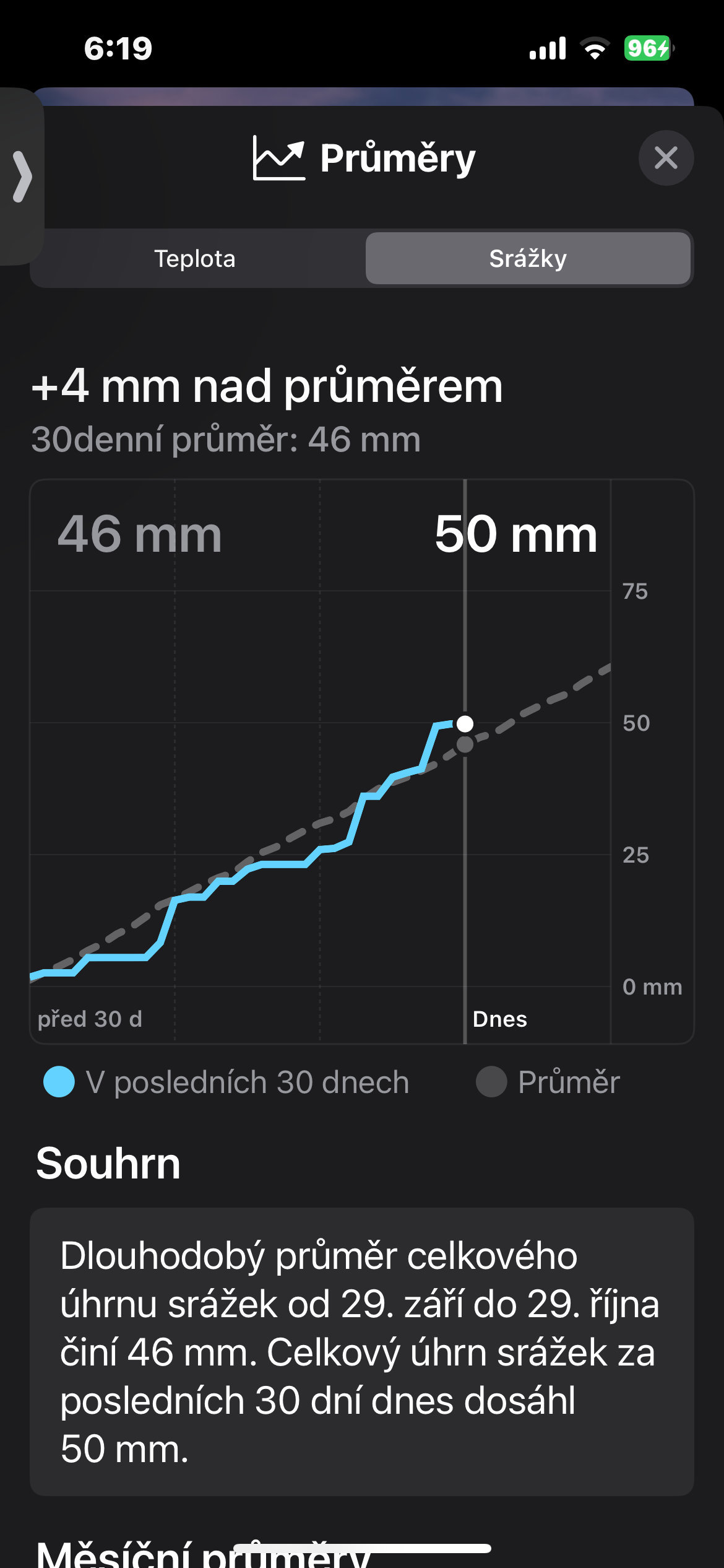Máte pocit, že je v daném období v měsíci podezřele tepleji než v předešlých letech? Svou domněnku si můžete snadno ověřit v kartě, věnované průměrům teplot. Klepněte na vybranou lokalitu a zamiřte o něco níže do sekce Průměry. V horní části displejem můžete přepínat mezi grafem průměrů teplot a srážek, níže najdete přehled měsíčních průměrů a užitečné informace.