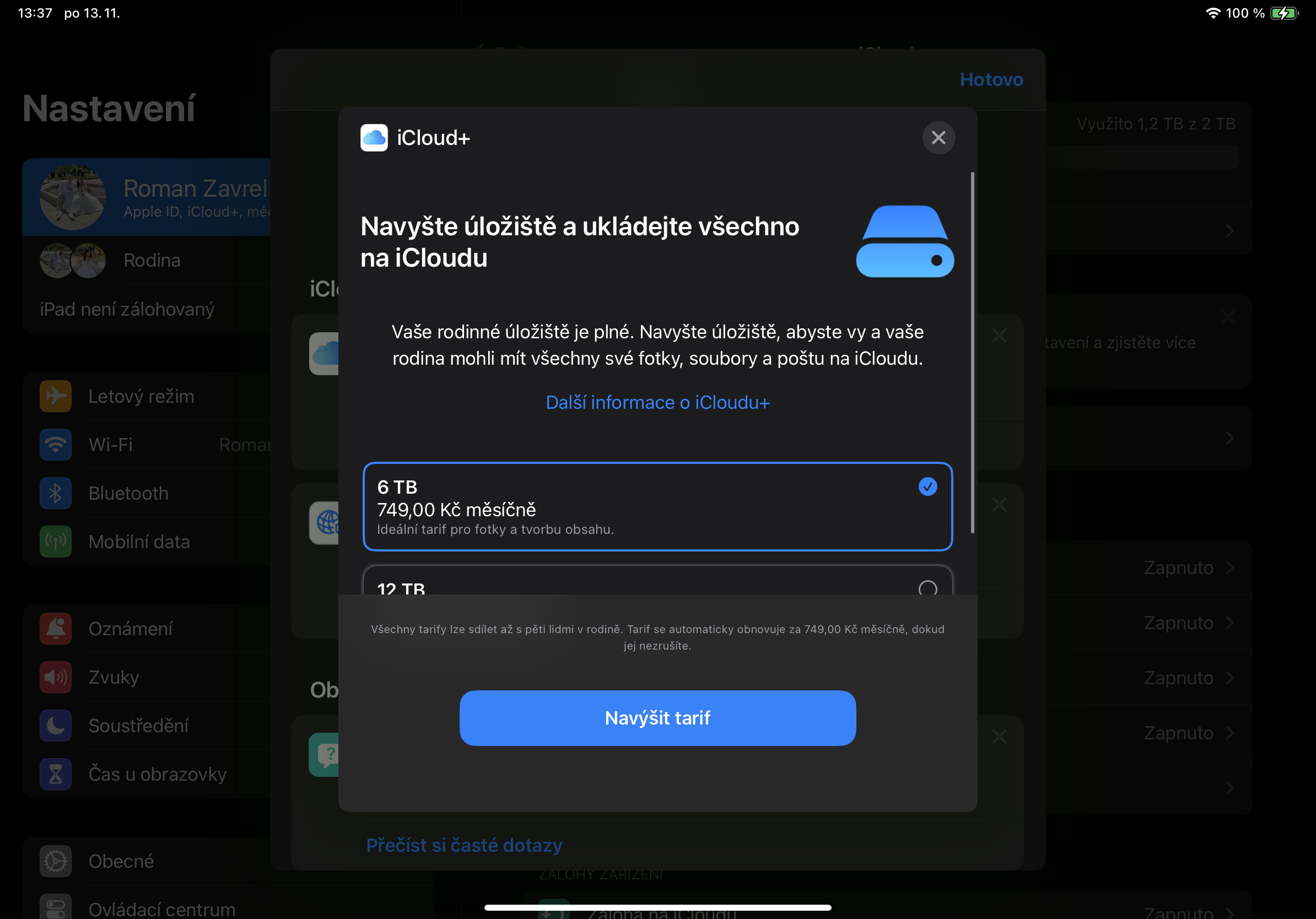 Mezi nimi se na prvním místě objevila možnost Získejte větší uložiště a další funkce. To by asi mohla být celkem užitečná rada, kdyby ji Apple nedával uživateli, který jak vidíte, má 2TB iCloud, z něhož mám 800 GB volného prostoru a to i přesto, že mám zálohována všechna svá zařízení. Apple mi tak nabídl, abych mu měsíčně posílal 749Kč, za což mi dá 6 TB místa a tak budu mít místo 800GB volného místa volných rovnou 4800GB. Super, to zní jako neodolatelná nabídka. Marketing Applu v iOS je v posledních letech celkem zajímavý od toho, že vám nabízí Apple Arcade tím nejotravnějším možným způsobem až po to, abyste si navýšili předplatné iCloudu, které vůbec nepotřebujete. Co k tomu dodat, snad jen to, abyste nedali na každou radu Applu a nejdřív zkusili popřemýšlet, zda vám to, co vám nabízí k něčemu bude.