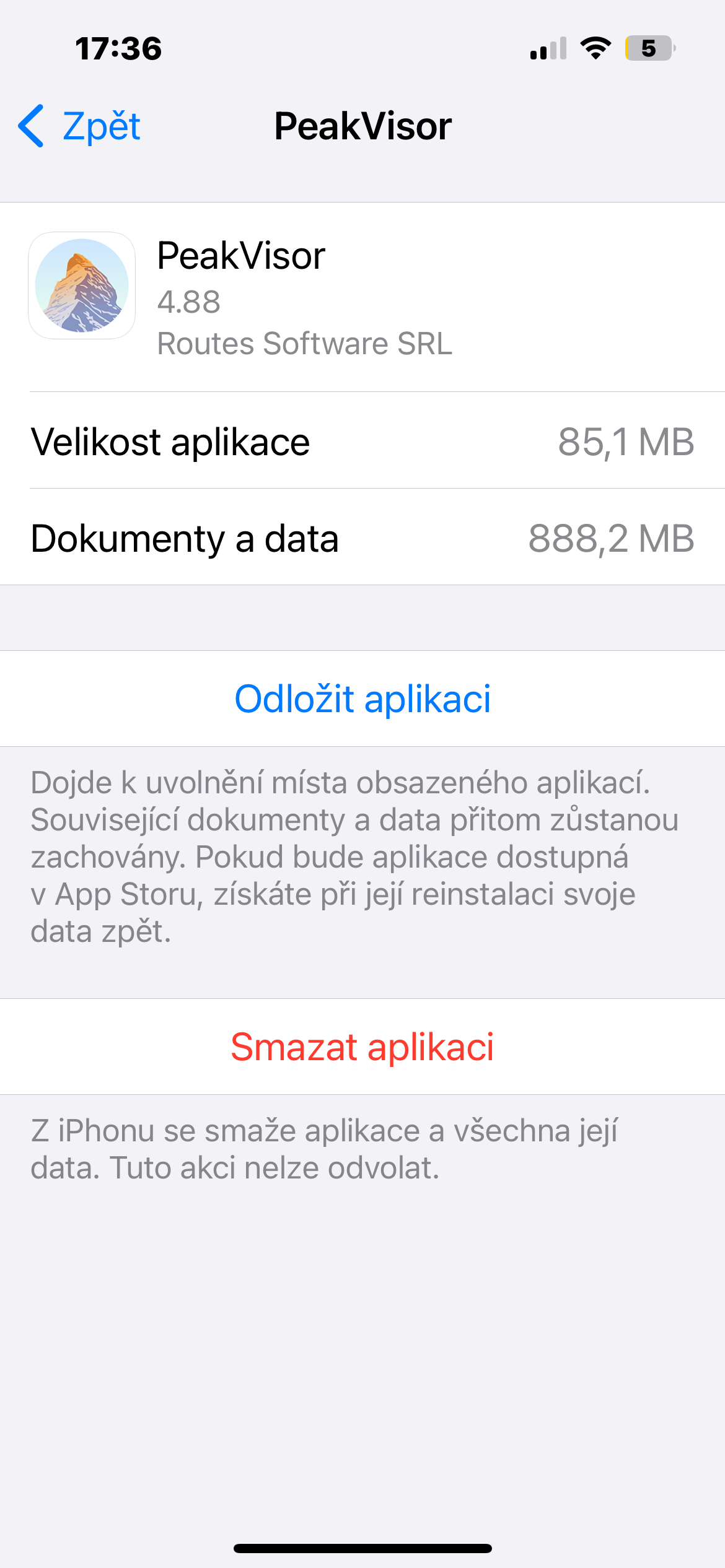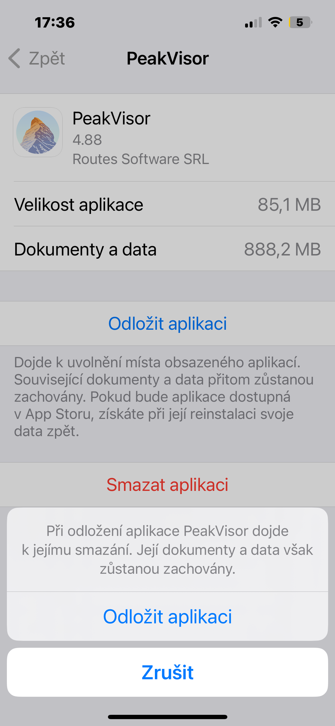 Pro odložení aplikace spusťte Nastavení -> Obecné. Zamiřte do sekce Úložiště v iPhonu, klepněte na vybranou aplikaci a zvolte Odložit aplikaci.