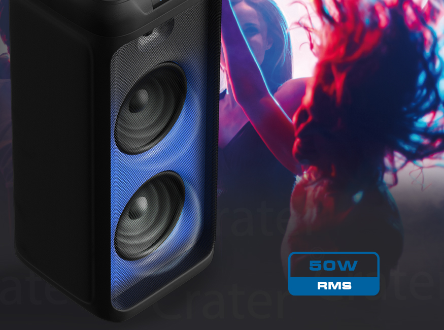 Abychom byli poctiví, zde je několik technických údajů. Crater L je vybaven 3 reproduktory, jedním 25mm výškovým a dvěma basovými o průměru 203 mm, což odpovídá 8″. Frekvenční rozsah výrobce udává v rozmezí 20 Hz až 20 kHz, přičemž výstupní audio výkon činí 50 W (RMS). Zařízení využívá Bluetooth standard 5.0 a v případě dvou kusů je k dispozici možnost párování True Wireless Stereo. Integrovaný tuner je schopen operovat zhruba v rozpětí 87,5 MHz až 108 MHz. Vestavěná nabíjecí lithium-iontová baterie s kapacitou 4 000 mAh dokáže zajistit provoz na 2 až 5 hodin, podle úrovně vybuzení.