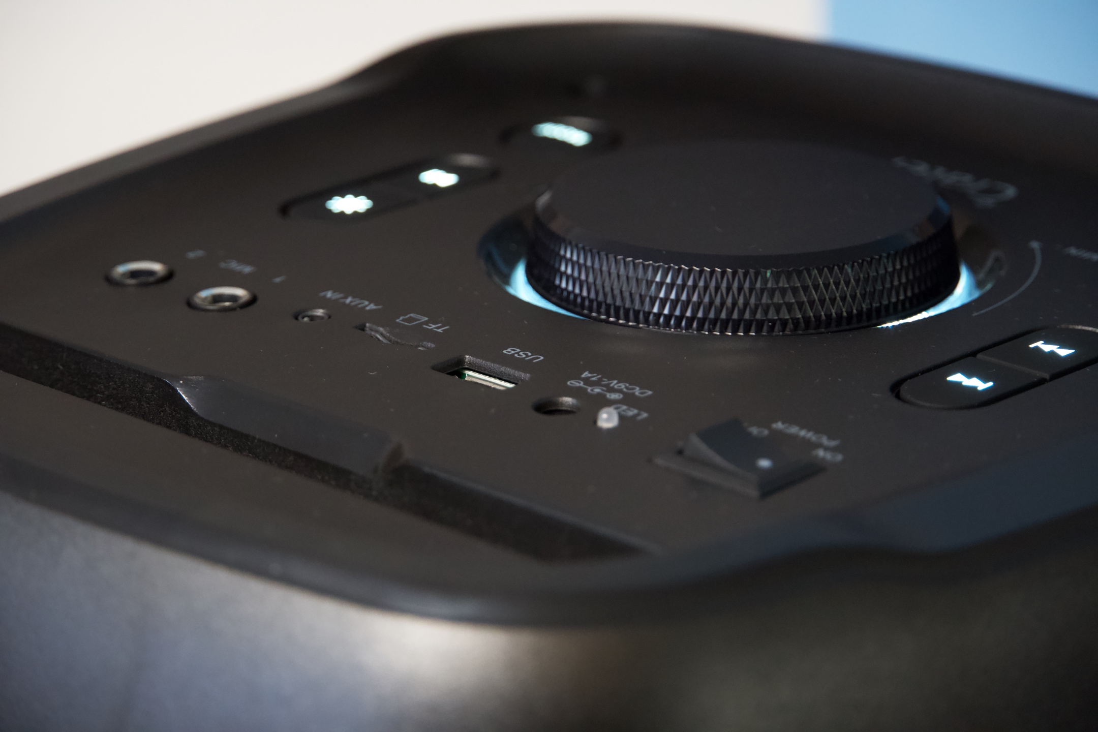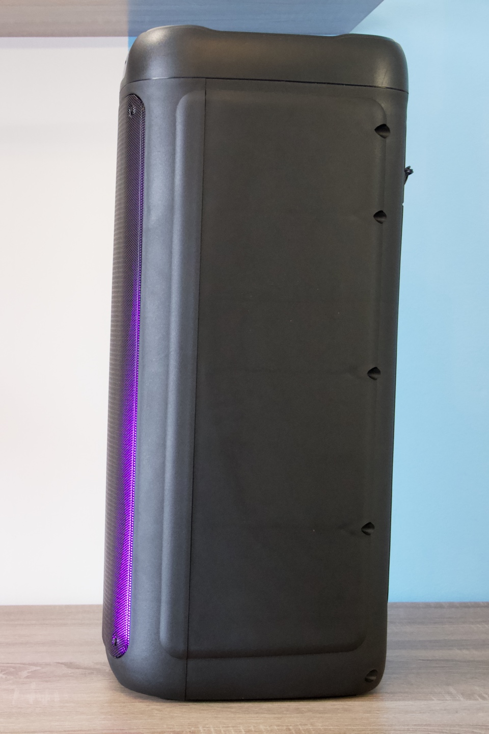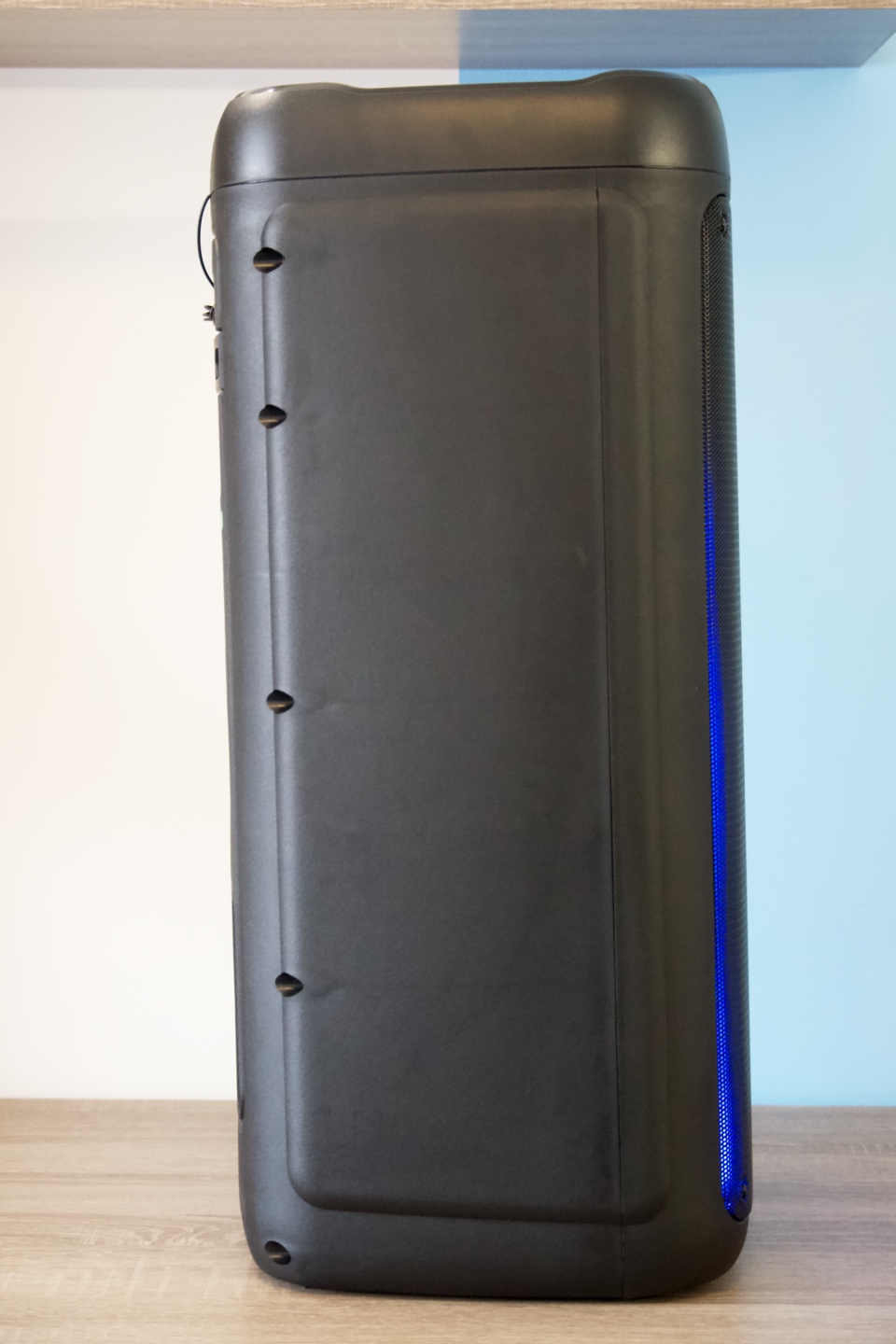 Na šířku si reprobox zabere 26,8 cm, vysoký je 61,6 cm a na hloubku je mu třeba rezervovat 27,1 cm. Drážka v horní části u ovládání dovoluje umístit zde telefon nebo menší tablet, není-li širší než 16 cm a tloušťkou nepřesahuje zhruba 1,7 cm. U produktu, jakým je party reproduktor, se předpokládá, že jej pravděpodobně budete chtít přemisťovat, čemuž je přizpůsobena hmotnost 5,5 kg. Při přenášení oceníte i šikovné madlo na zadní straně, kde najdeme také anténu pro příjem FM. Nechybí ani typické LED osvětlení v pestrých barvách s několika módy reagujícími na hudbu a praktický informační displej.