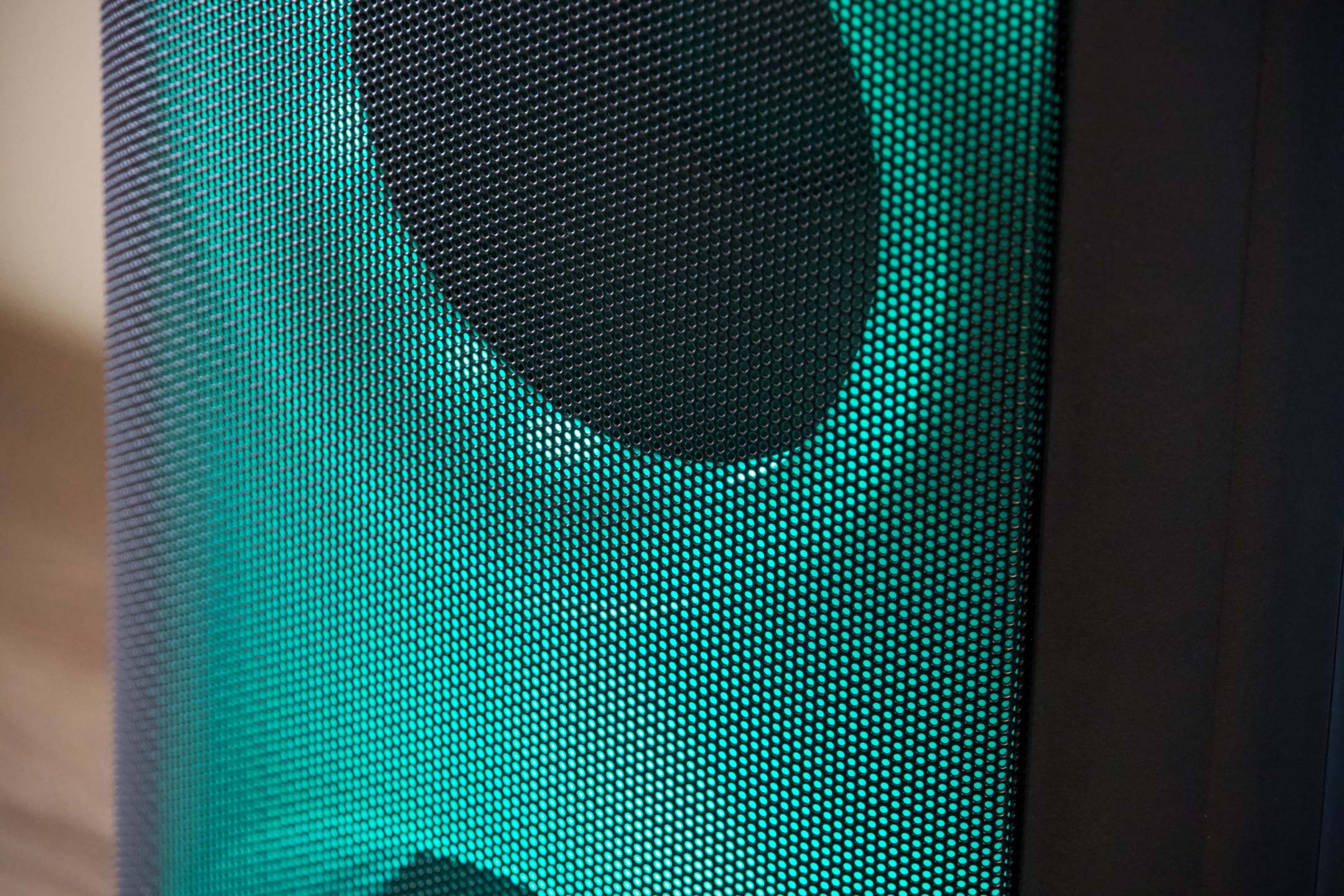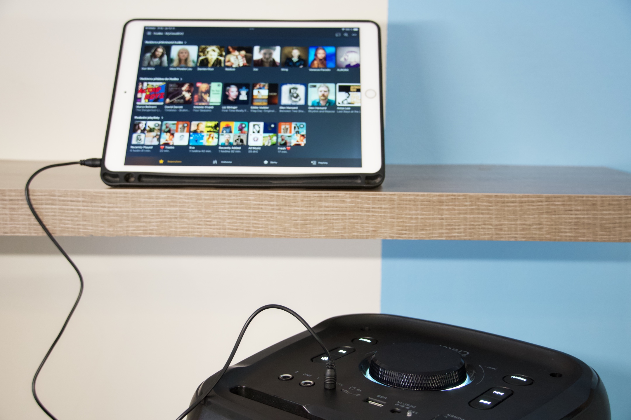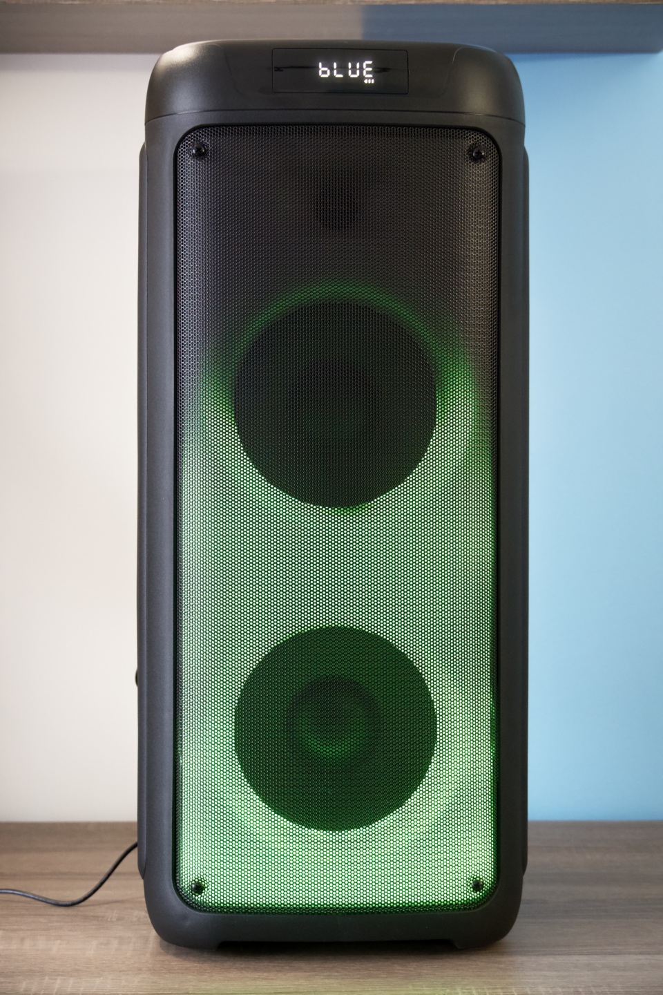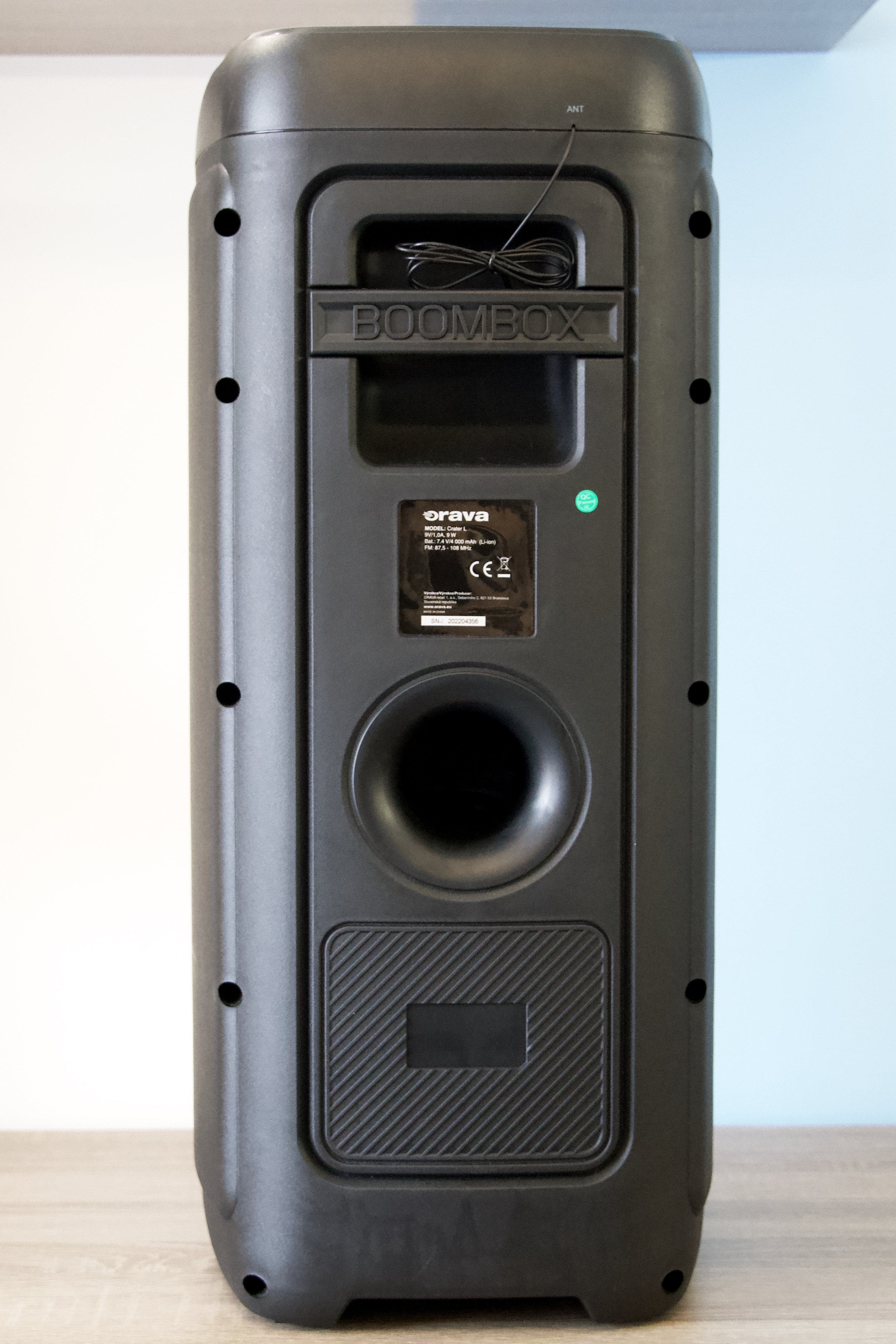 Na šířku si reprobox zabere 26,8 cm, vysoký je 61,6 cm a na hloubku je mu třeba rezervovat 27,1 cm. Drážka v horní části u ovládání dovoluje umístit zde telefon nebo menší tablet, není-li širší než 16 cm a tloušťkou nepřesahuje zhruba 1,7 cm. U produktu, jakým je party reproduktor, se předpokládá, že jej pravděpodobně budete chtít přemisťovat, čemuž je přizpůsobena hmotnost 5,5 kg. Při přenášení oceníte i šikovné madlo na zadní straně, kde najdeme také anténu pro příjem FM. Nechybí ani typické LED osvětlení v pestrých barvách s několika módy reagujícími na hudbu a praktický informační displej.