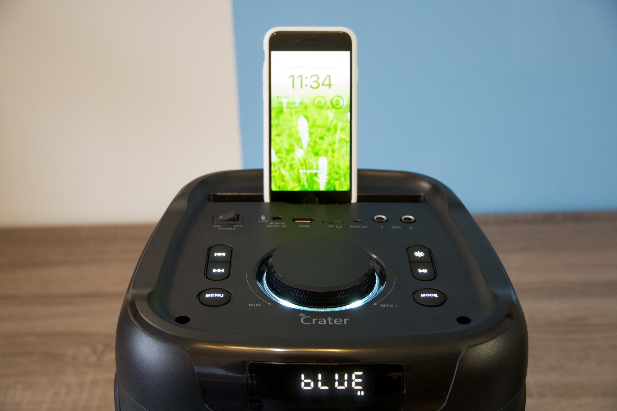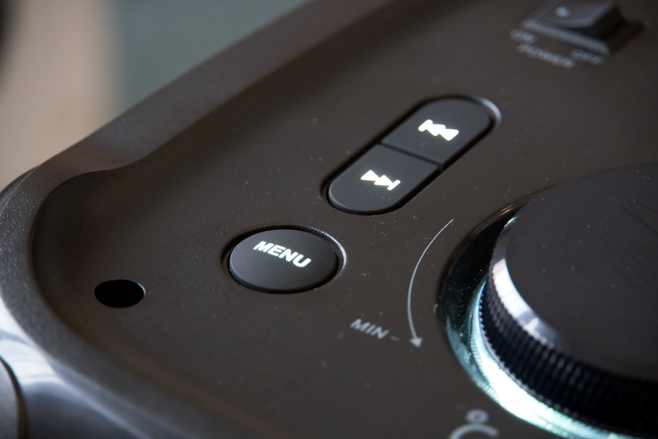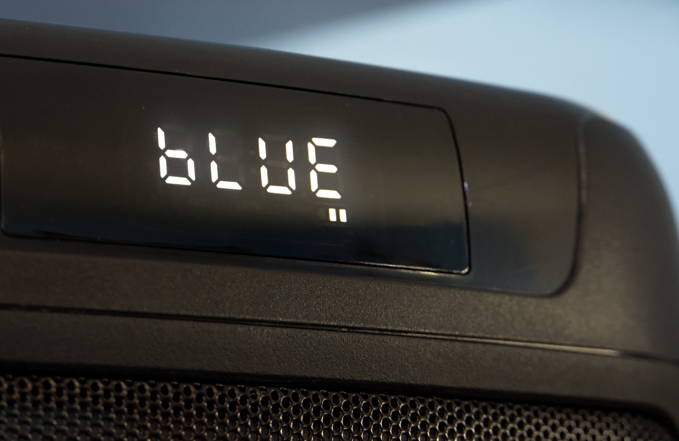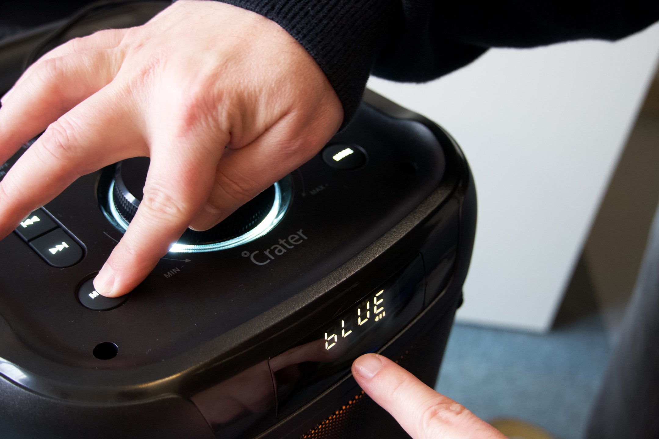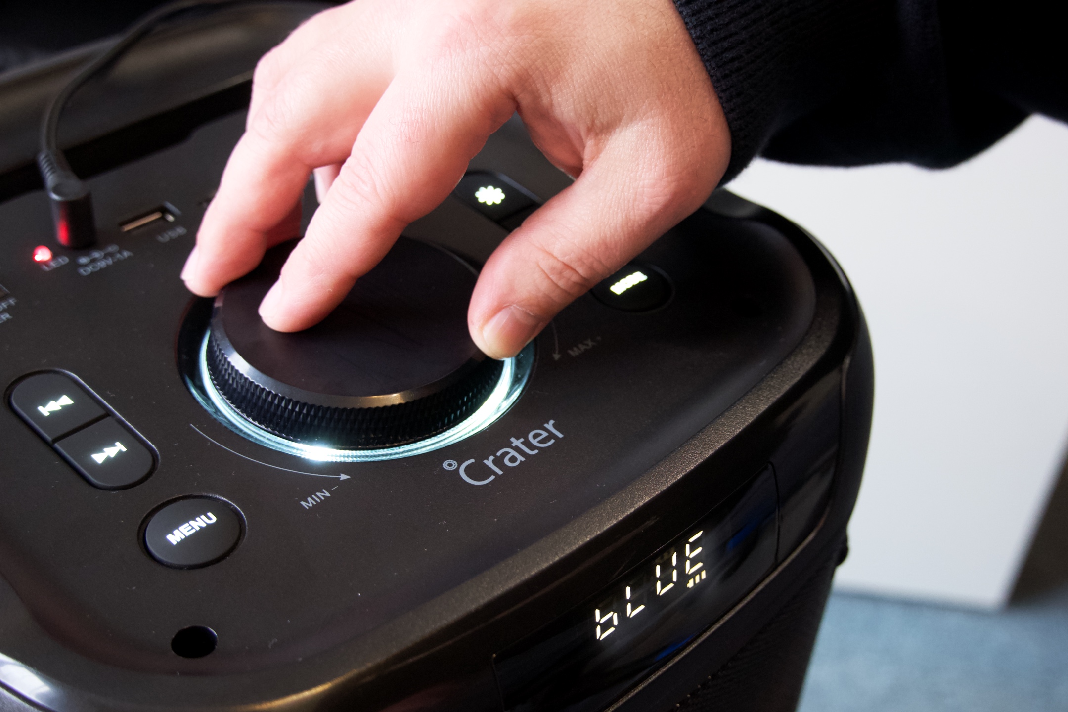 Ovládání je celkem intuitivní. Vše začíná u klasického vypínače. Po jeho zapnutí na sebe podsvícením upozorní jednotlivé prvky, konkrétně pro posun vpřed a vzad, přístup k LED osvětlení s patřičným symbolem a tlačítko pro spuštění či pozastavení přehrávání, na něž níže po stranách navazují Menu a Mode. Uprostřed se pak nachází velký otočný ovladač. Při prvním spuštění je reproduktor ihned připraven k použití v režimu Bluetooth, o kterém displej informuje zobrazením „bLUE“, pod nímž je vidět stav nabití baterie. Samotné párování probíhá velmi rychle a bez obtíží, přičemž při každém opětovném zapnutí se Crater L automaticky znovu spojí s posledním zařízením.