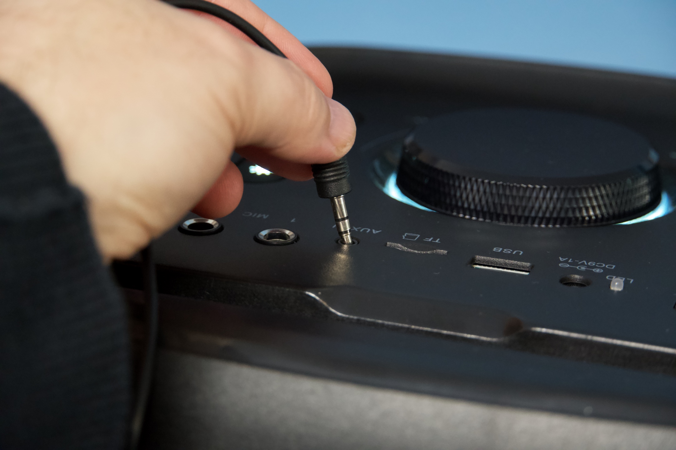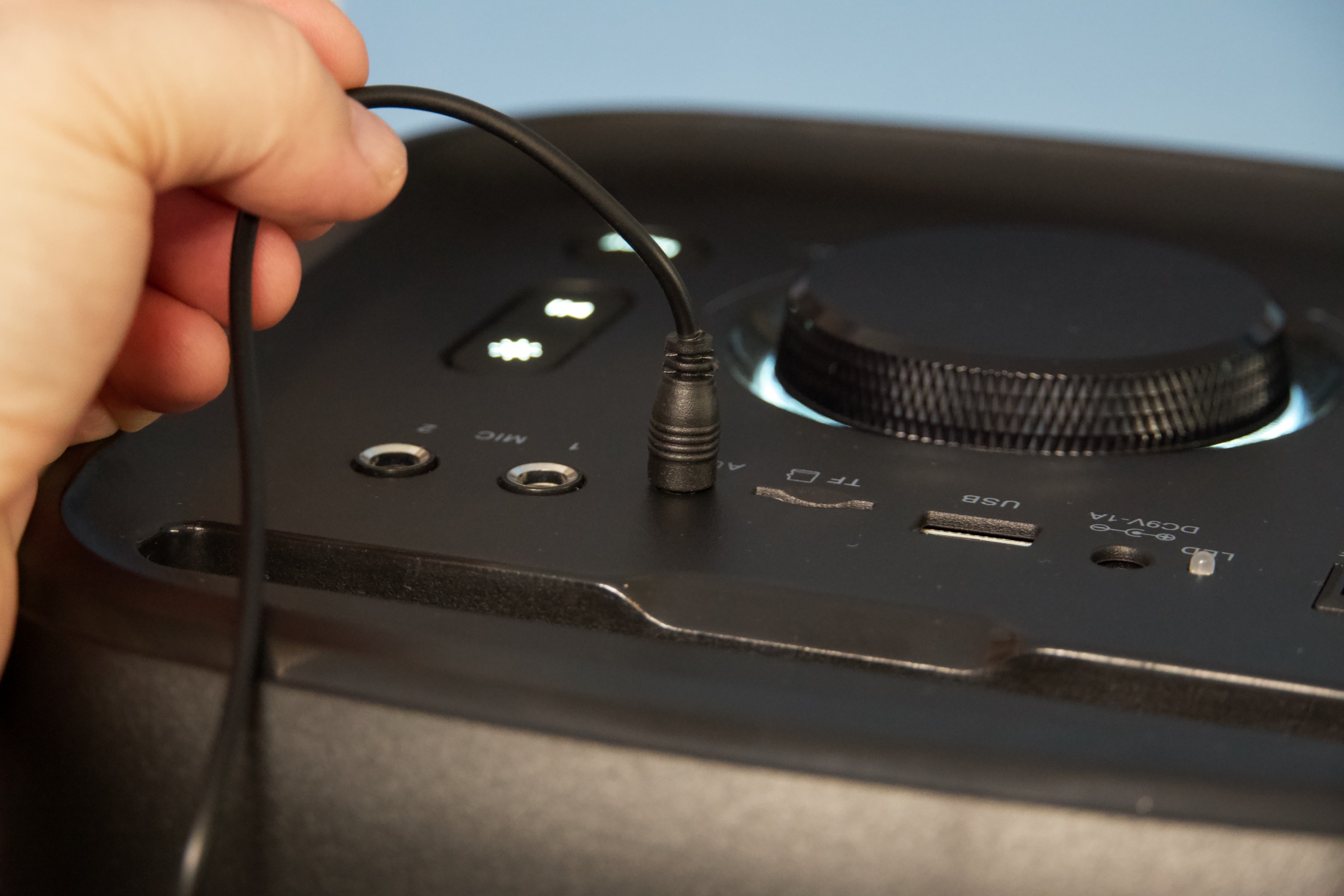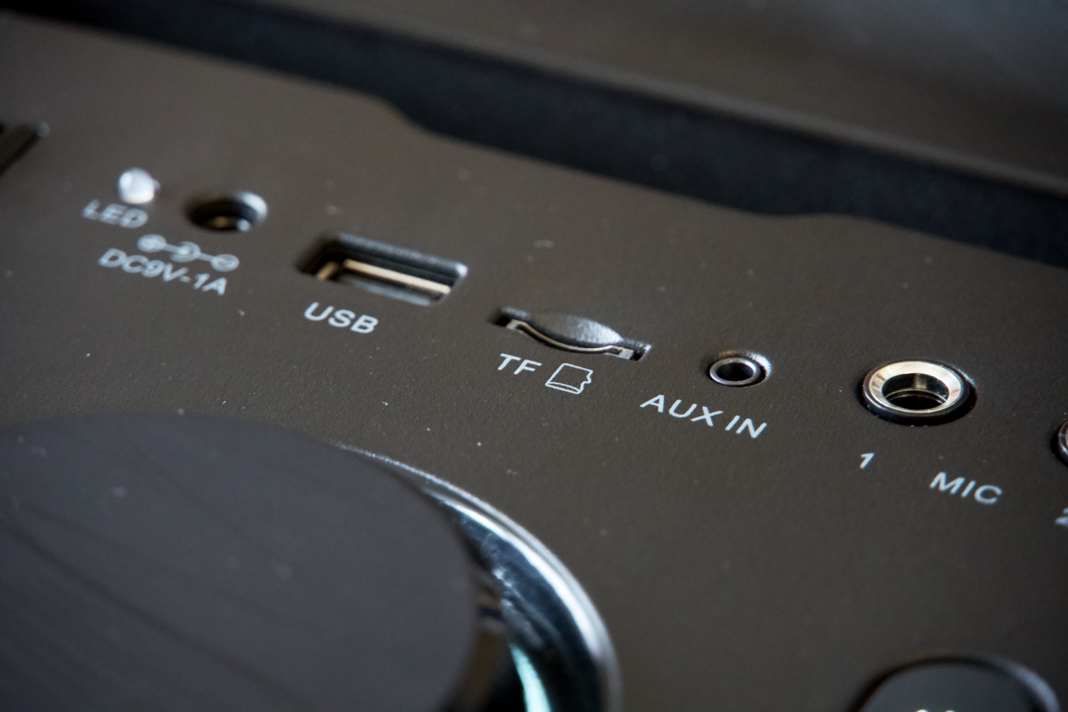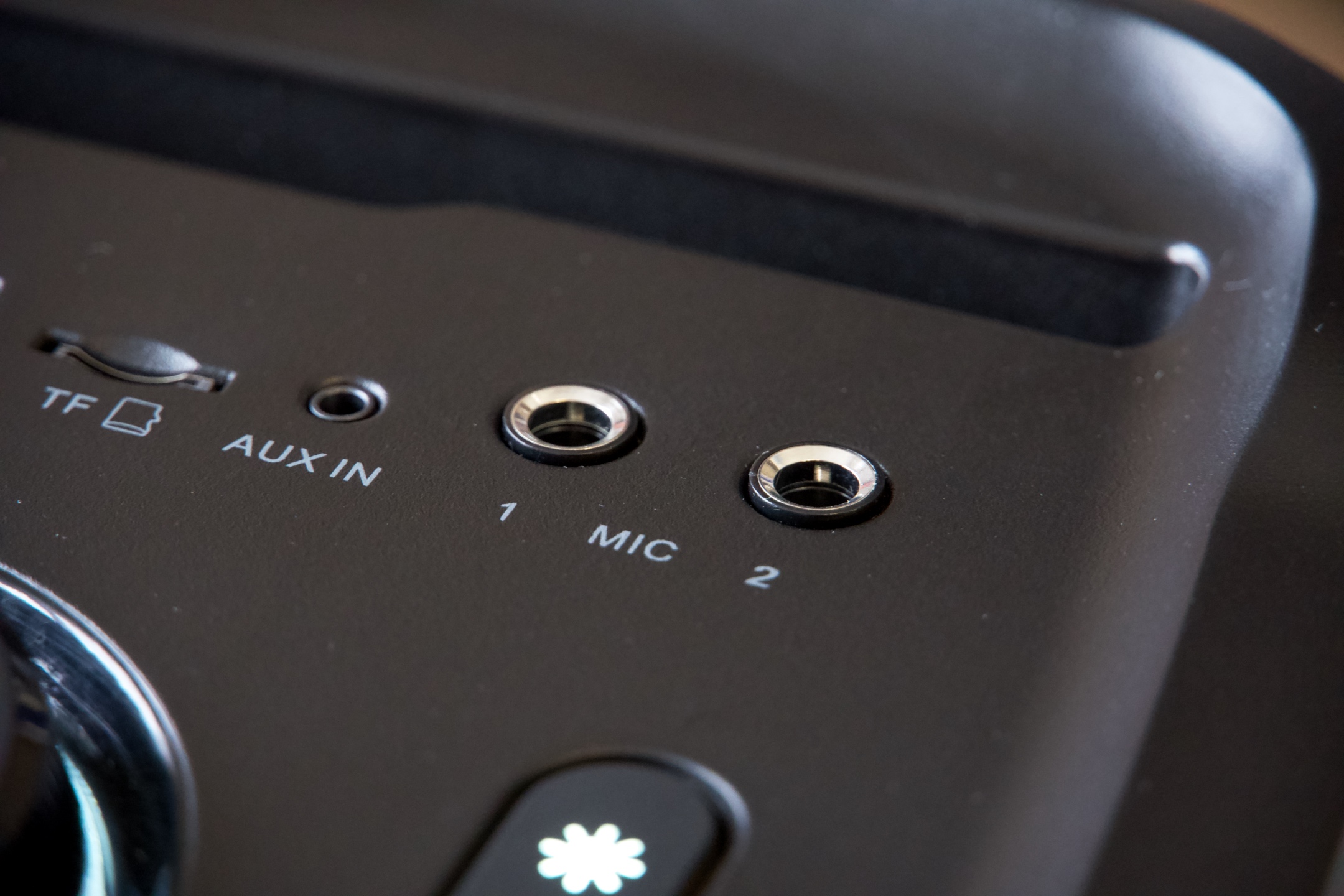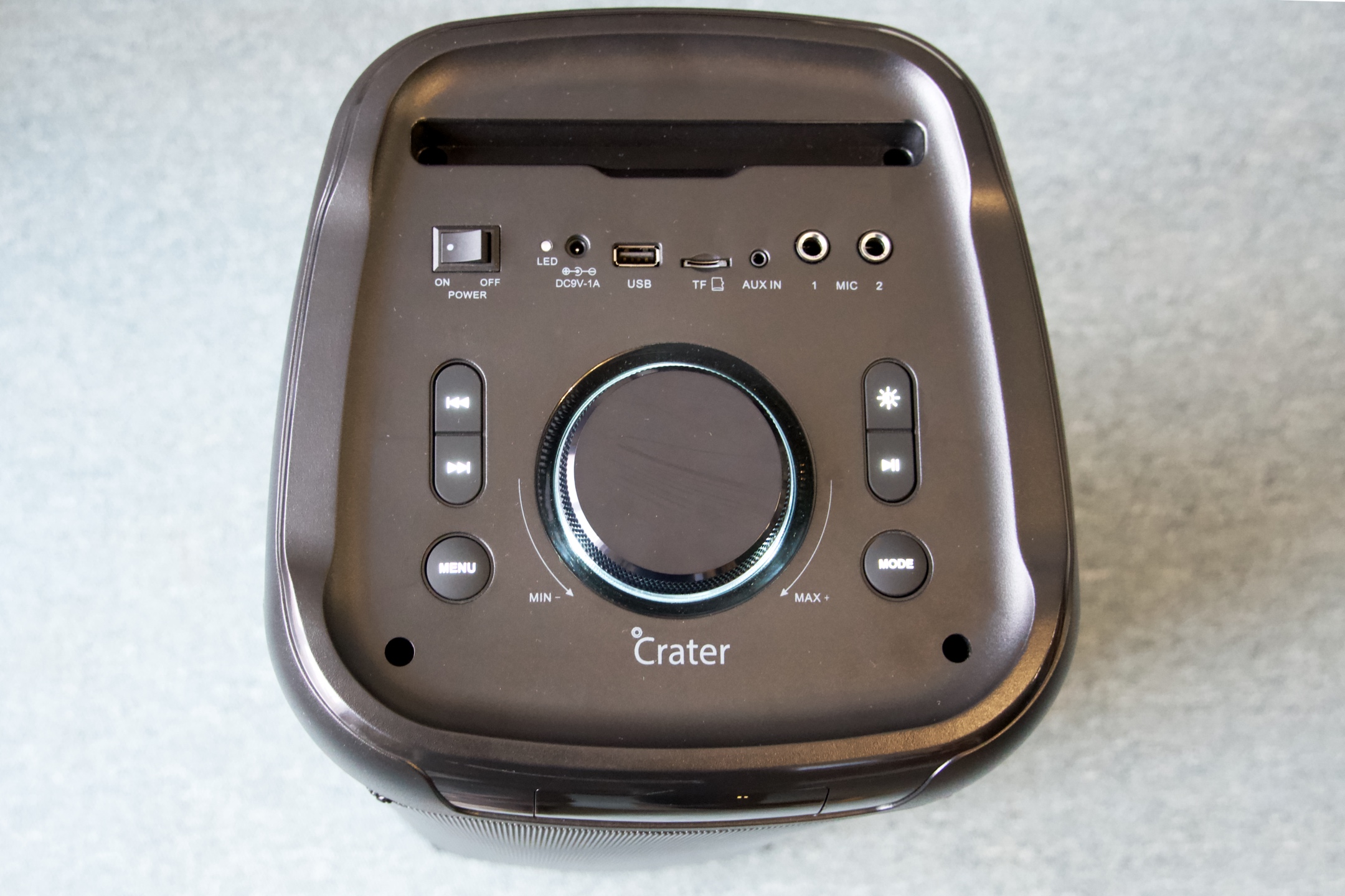 Designově černý Crater L nijak nevybočuje, na první pohled se tedy od konkurenčních produktů stejného typu nijak výrazně neliší. Při bližším pohledu už jsou ale viditelné některé vychytávky. Ne každý party reproduktor dokáže nabídnout takovou výbavu sloty a konektory. Kromě běžného USB přítomnost čtečky micro SD karet už tak častá nebývá a připočítáme-li k tomu ještě 3,5mm stereo AUX vstup, možnost připojení dvojice mikrofonů nebo případně i elektrické kytary, což jsem osobně na 6,3mm vstupu MIC 2 vyzkoušel, a FM rádio, je to poměrně nadstandardní.