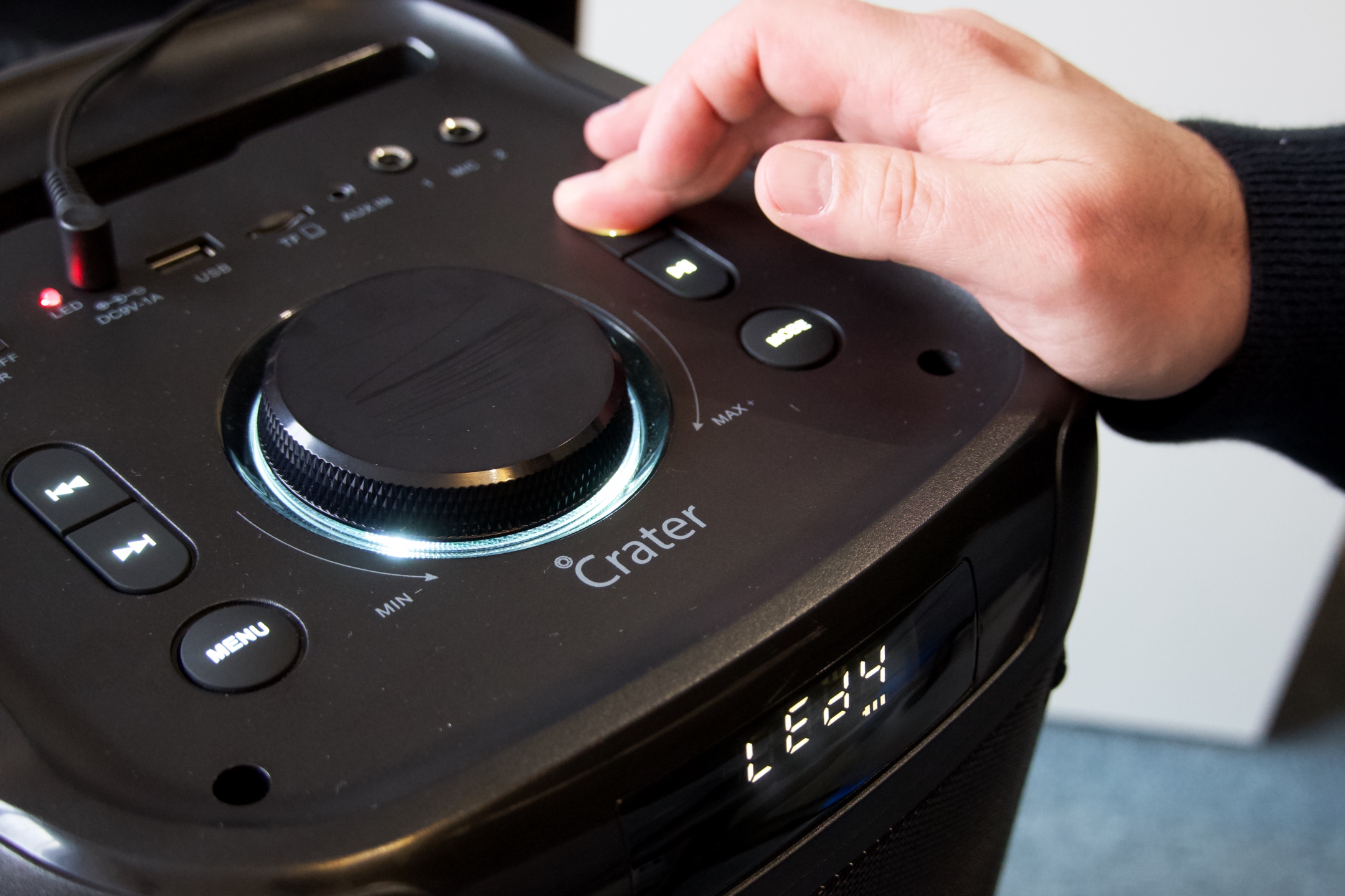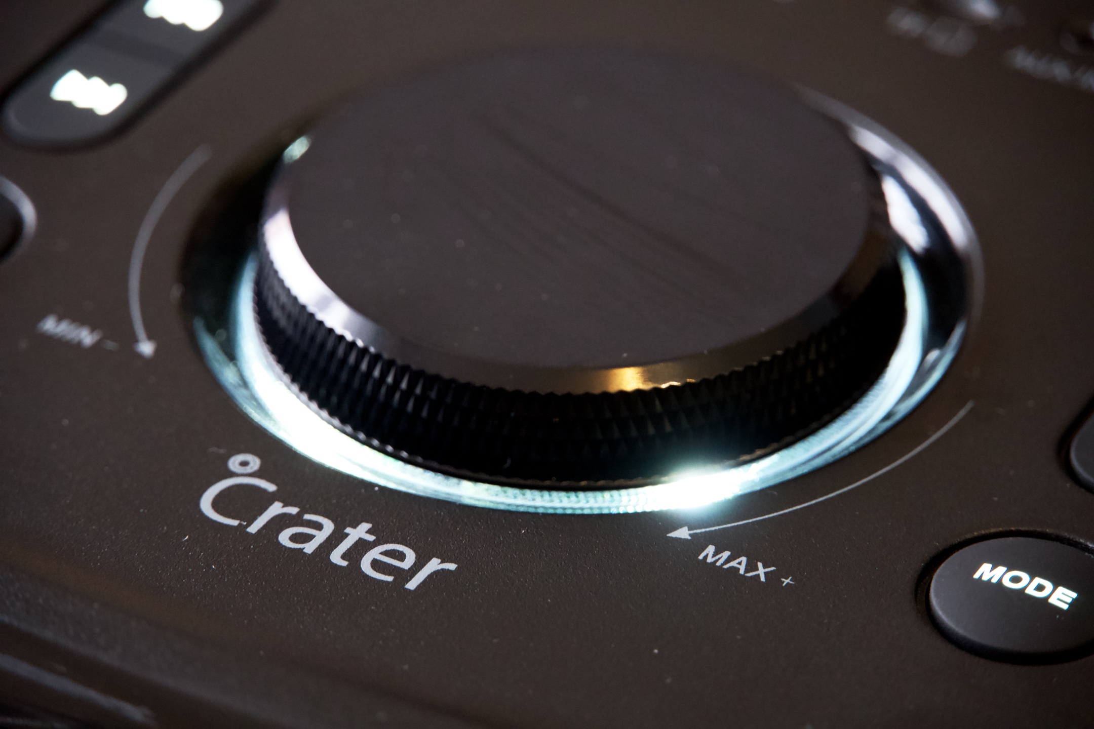 Prostřednictvím Menu a středového enkodéru lze volit mezi hlasitostí přehrávaného obsahu, ekvalizací výšek a basů a dále ovládat mikrofonní vstupy a dokonce k nim, pakliže je to žádoucí, přidat echo efekt, jehož úroveň je nastavitelná v rozmezí 0 až 10. Tlačítko Mode pak umožňuje přepínat mezi Bluetooth, FM rádiem a linkovým vstupem. Pakliže chcete poslouchat s flash disku nebo paměťové karty, stačí ve kterémkoli režimu zasunout médium, Crater se přepne na USB a začne z něj načítat.