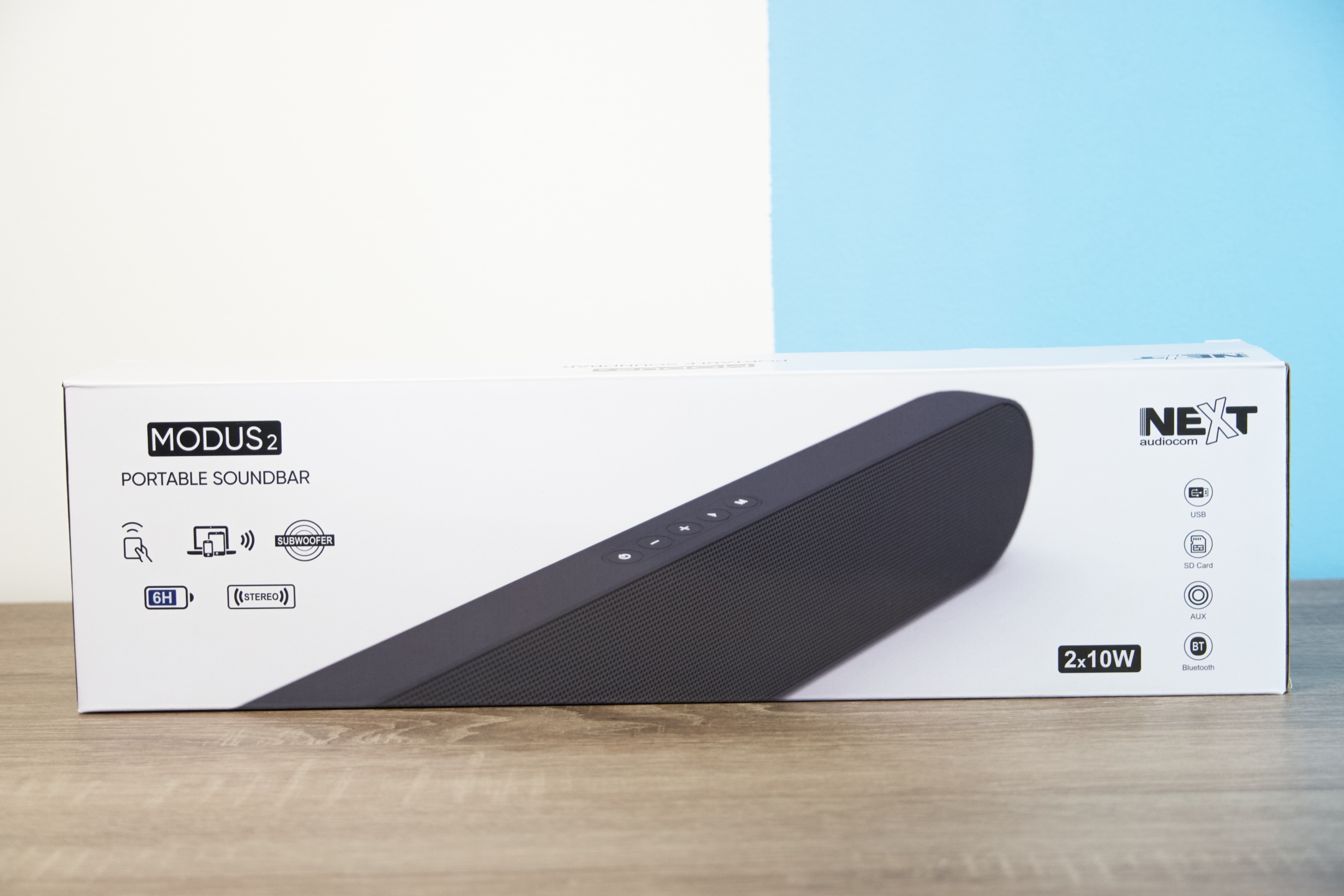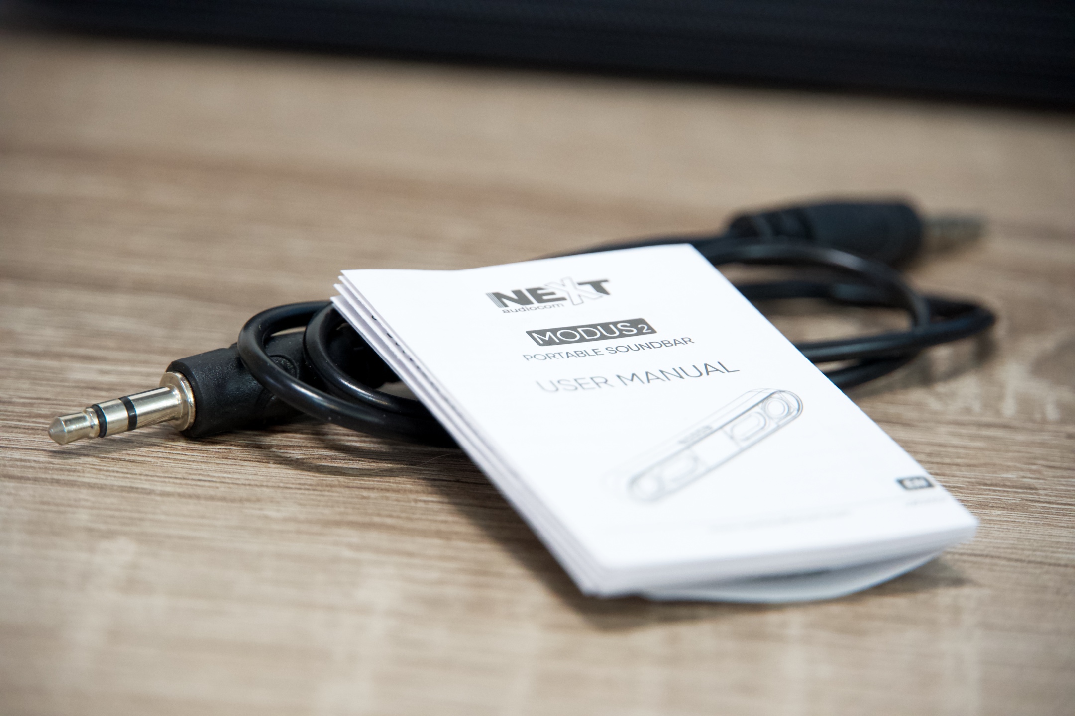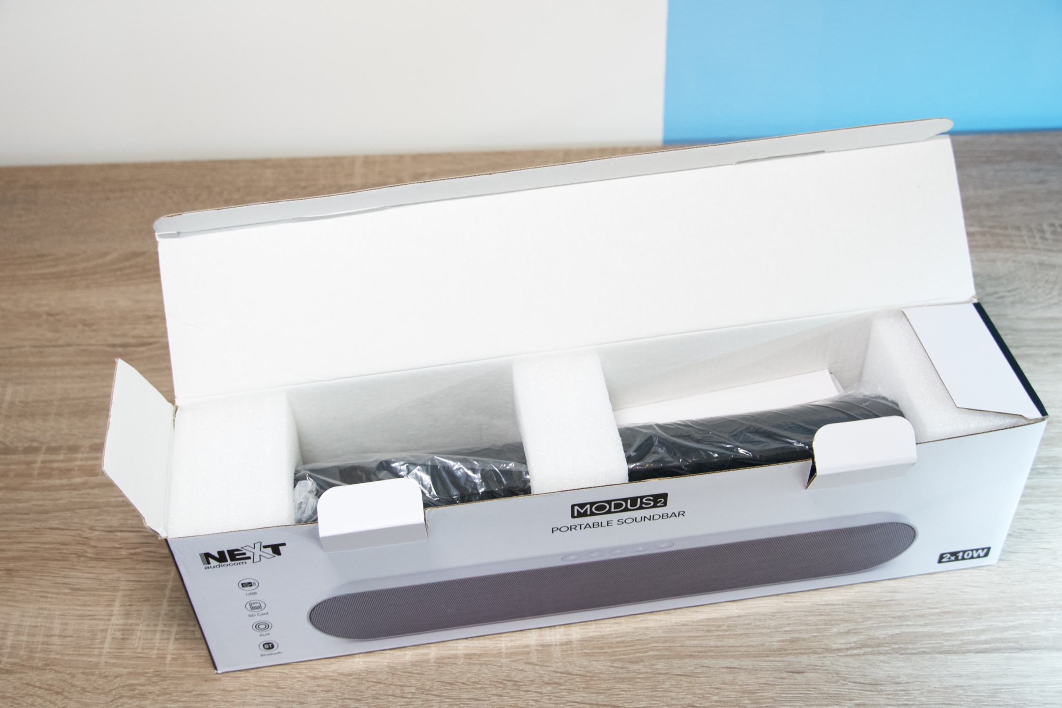 Štíhlá krabice, jejíž rozměry napovídají, že Modus2 si příliš prostoru nepřisvojí, v sobě ukrývá samotný soundbar, 3,5mm audio kabel o délce 50 cm pro přímé připojení externího zdroje zvuku, napájecí USB-A na Micro USB stejné délky a malý box, ve kterém se nachází dálkové ovládání napájené 2 bateriemi typu AAA. Pro uvedení do provozu tedy stačí produkt zbavit transportních ochranných prvků, zasunout USB a Modus2 je připraven k použití.