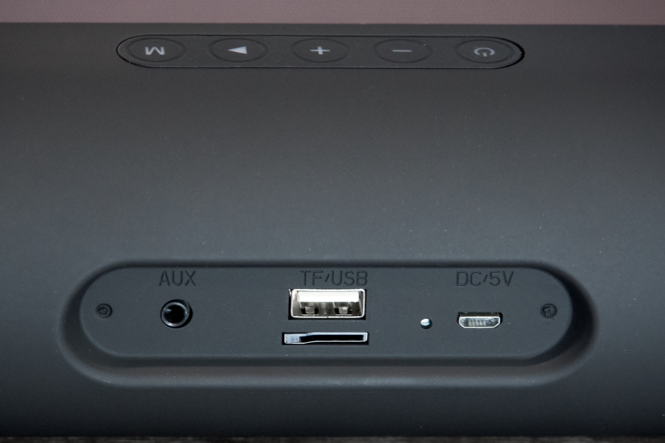 Nijak nevystupující, bíle podsvícené ovládací prvky, jež čítají 5 tlačítek, najdeme na horní straně. První v řadě slouží k zapnutí či vypnutí Modus2. Dále jsou zde minus a plus zprostředkovávající krátkým stiskem zvýšení a snížení hlasitosti a dlouhým posun mezi skladbami či stanicemi FM rádia. Za nimi už narážíme na ikonu „play“, která plní klasickou funkci spuštění nebo pozastavení přehrávání, v FM a AUX módu dojde k okamžitému ztišení či jeho zrušení a podržení v režimu FM započne skenování stanic, přičemž totéž tlačítko lze použít při krátkém dotyku také k přijetí hovoru a při dlouhém k jeho ukončení. Poslední prvek označený písmenem „M“ poskytuje přístup k volbě módu, respektive zdroje. Konkrétně jím může být linkový vstup, FM tuner, Bluetooth, USB nebo paměťová karta, u nichž jsou podporovány formáty MP3 a WAV.