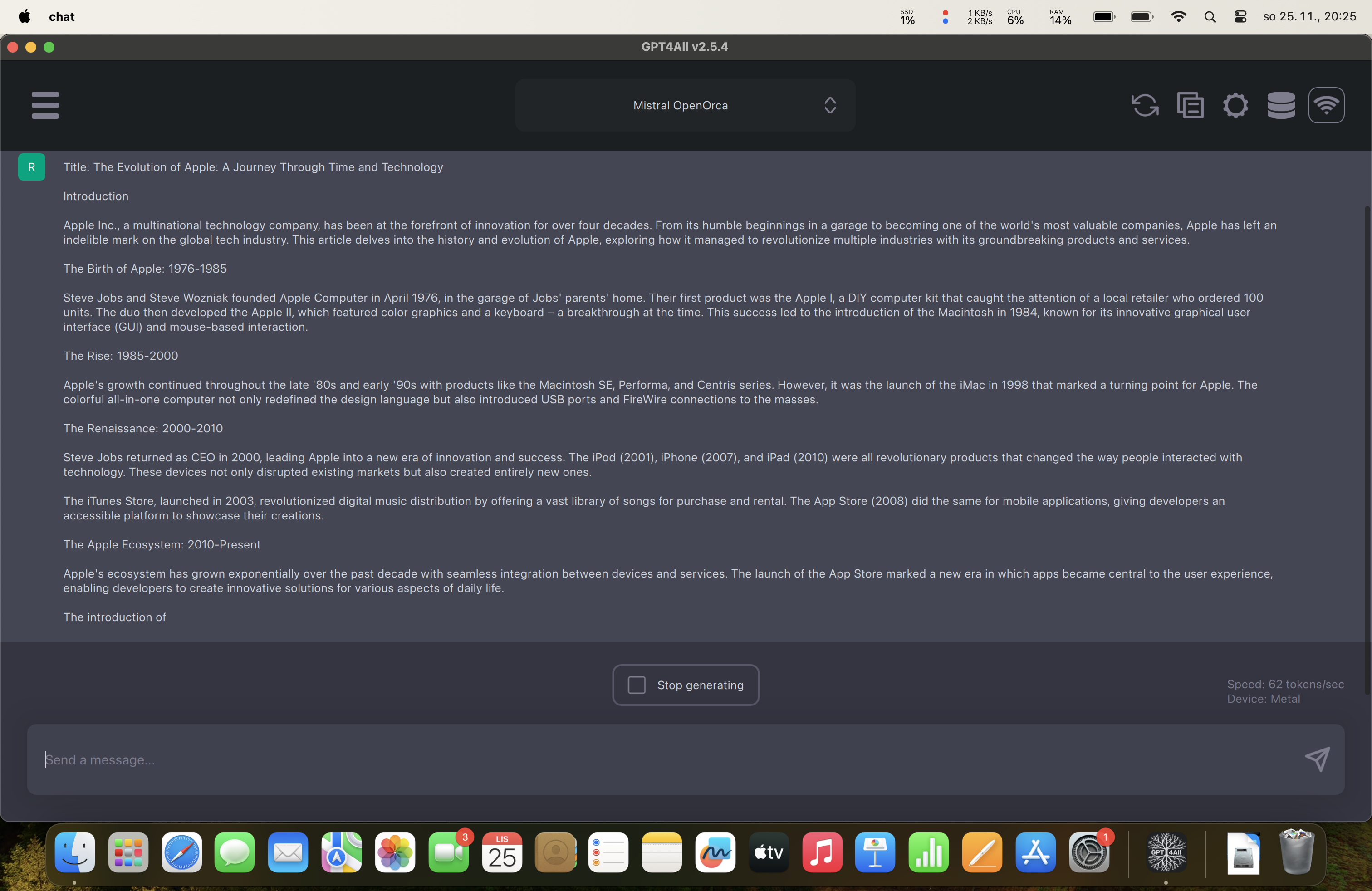 Poslední test CPU se skládal z gpt4all, což je možnost rozběhnout si chatgpt lokálně. Velmi zjednodušeně lze funkčnost této „věci“ popsat tak, že k funkčnosti využívá nějaký dataset, který si vyberete podle zaměření toho, co zrovna chcete provádět, ze kterého následně všechny výpočty pro generování chatu provádí lokálně. Rychlost, se kterou jsem se zde setkal, mi skutečně vyrazila dech. Zatímco MacBook AIr M1 zvládá nějakých 12 až 13 tokenů za sekundu, MacBook Pro M3 Max se dostával na 55 až 60 tokenů. Bavíme se tedy o pětkrát vyšší rychlosti, kterou už zkrátka poznáte chtě nechtě.
