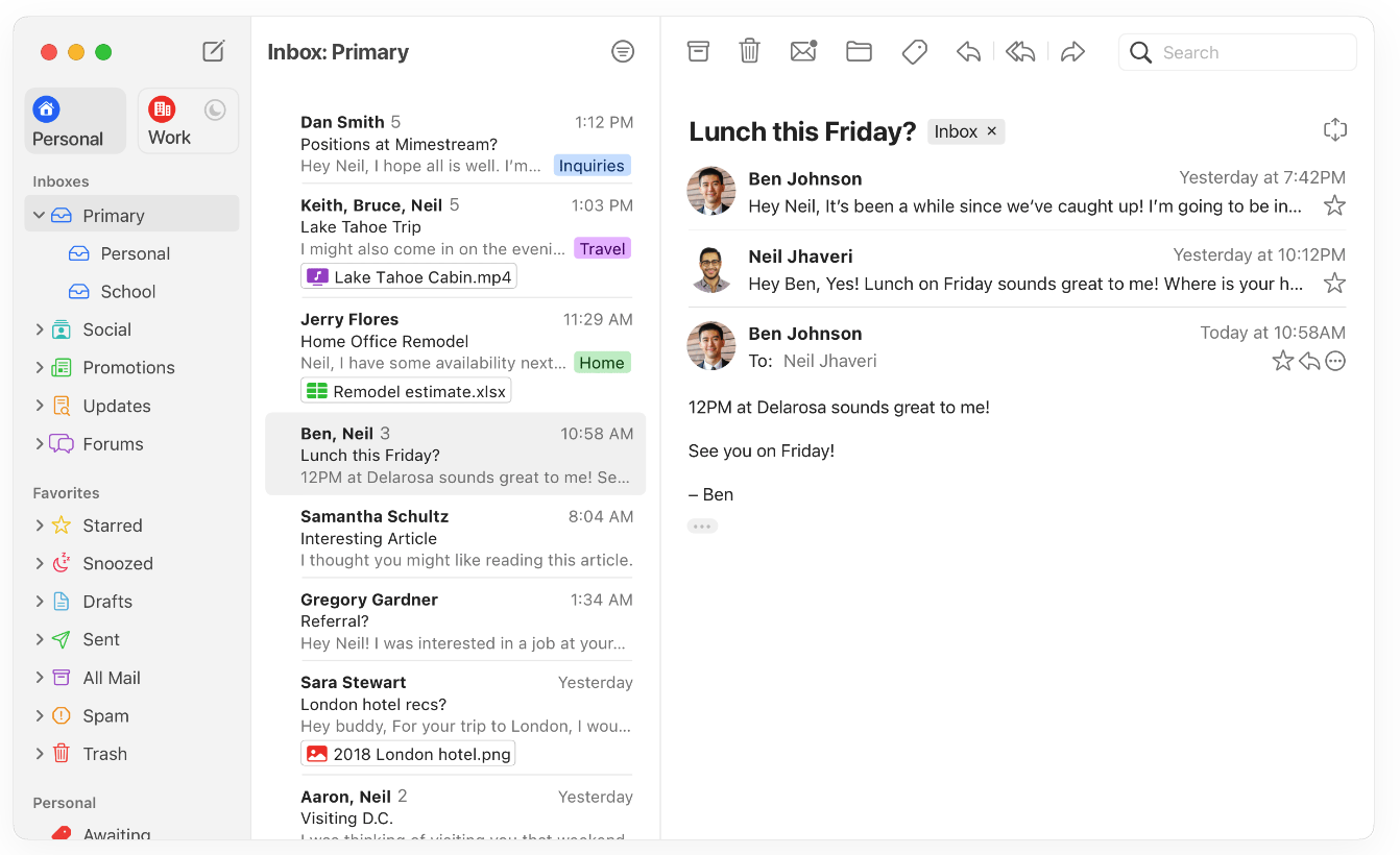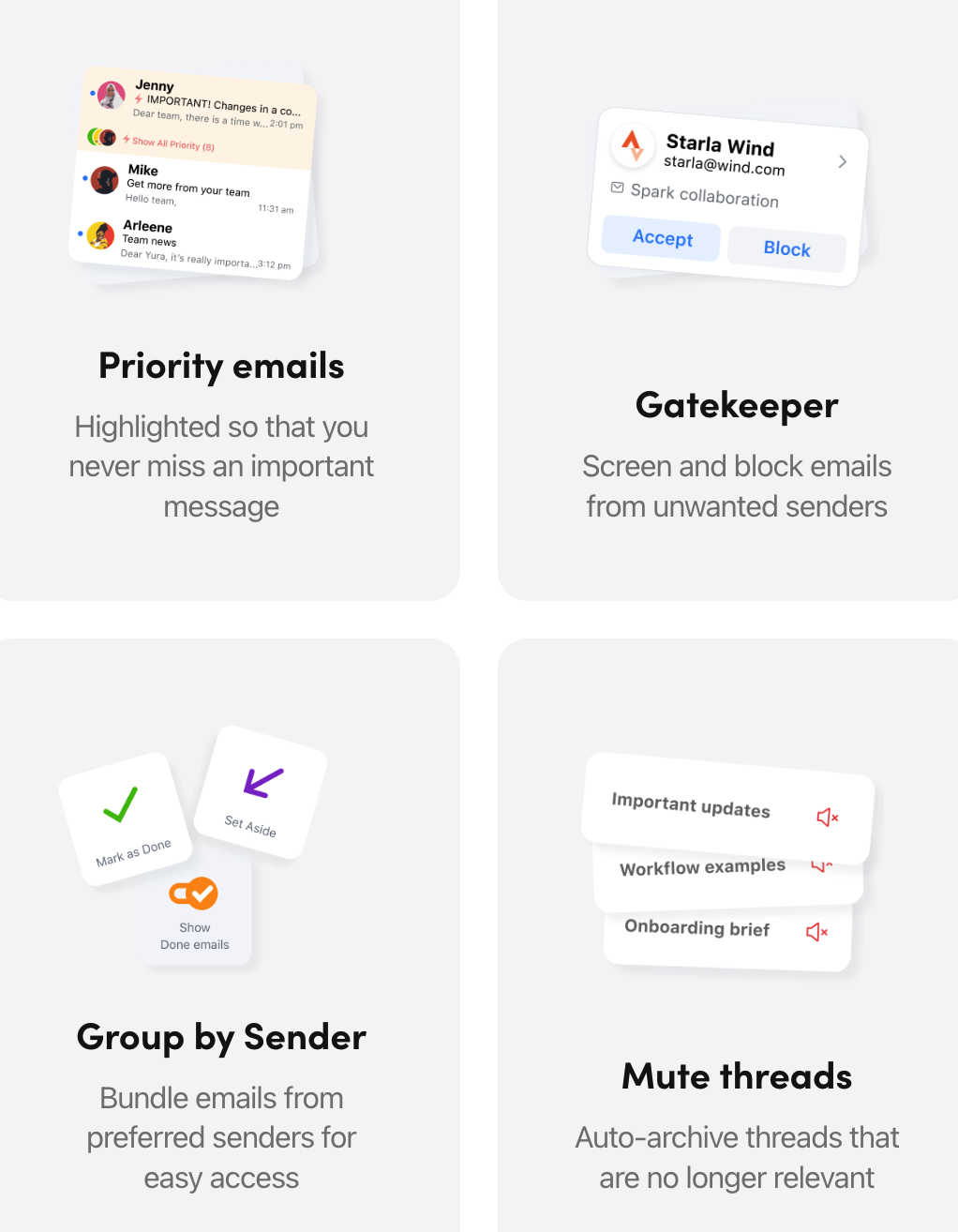 Spark Mail je oblíbenou aplikací zejména u těch, kteří e-mail využívají k hromadné a pracovní korespondenci. Spark nabízí skvělé možnosti nejen v oblasti skupinové korespondence, ale nabízí také opravdu přehledné uživatelské rozhraní, díky kterému se vyznáte i v dlouhých vláknech zpráv. Spark je multiplatformní aplikace, takže ji můžete používat na všech vašich Apple zařízeních, a k fungování využívá podporu umělé inteligence.