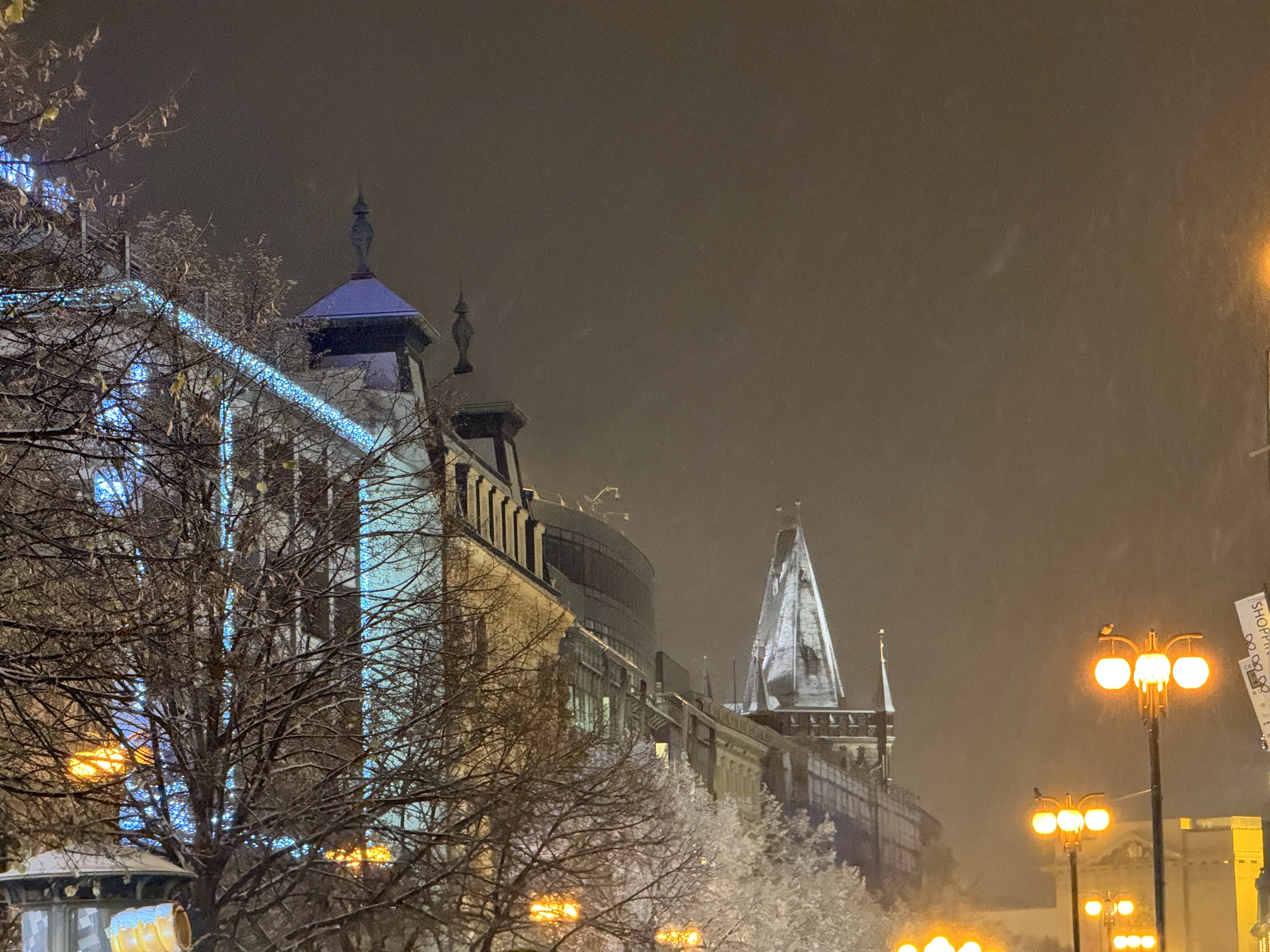 Co prověří kvality fotoaparátu nejvíce? Samozřejmě špatné světelné podmínky. Když si k nim přičtete ještě ty špatné povětrnostní, může se jednat o skutečně náročný test. Právě prudké sněžení nám přichystala i úterní večerní Praha. I tak jsme zkusili, co dokáže 5× zoom iPhonu 15 Pro Max a jsme jednoduše překvapeni.