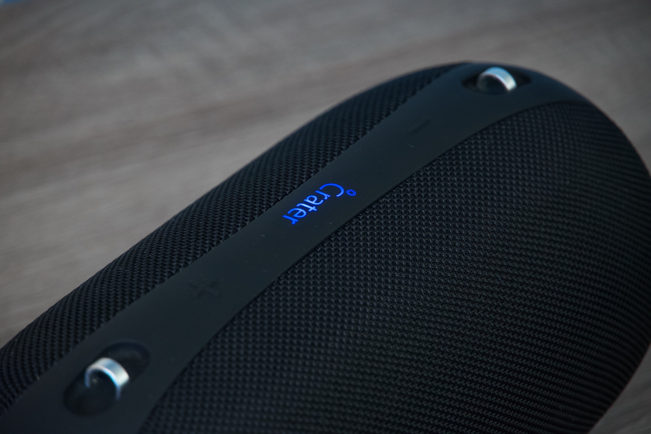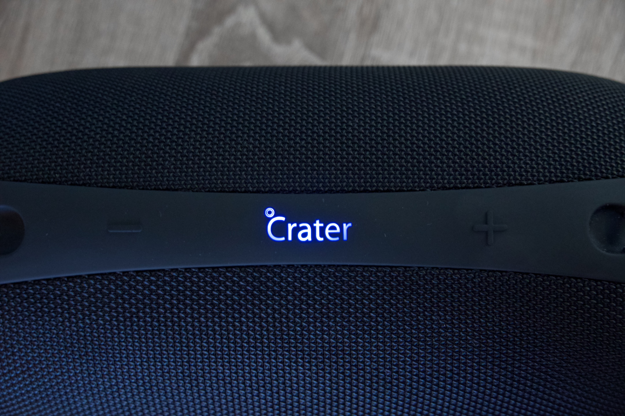 V horní části se nacházejí 3 multifunkční ovladače. Minus slouží k posunu skladeb či FM stanic vzad nebo v průběhu hovoru k jeho přepnutí z reproduktoru na telefon a naopak, pakliže jej stisknete jednou krátce, dvojitým zmáčknutím je možné směrem zpět procházet složkami média a ke snížení hlasitosti stačí totéž tlačítko podržet. Rychlým stiskem modře podsvíceného loga Crater docílíte spuštění nebo pozastavení přehrávání, při delším podržení (cca 3 sekundy) v režimu FM zahájíte automatické ladění stanic a dlouhým (cca 8 sekund) lze obnovit tovární nastavení. Symbol plus pracuje principiálně stejně jako minus, jen opačným směrem, přičemž v případě přepínání hovoru je funkcionalita identická.