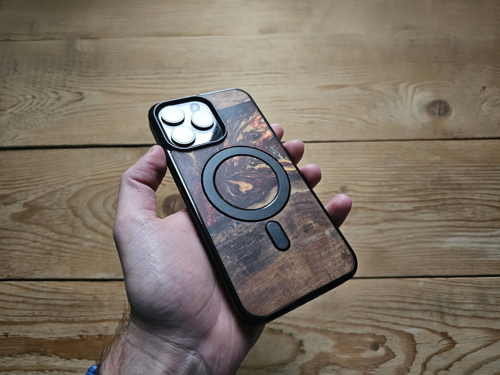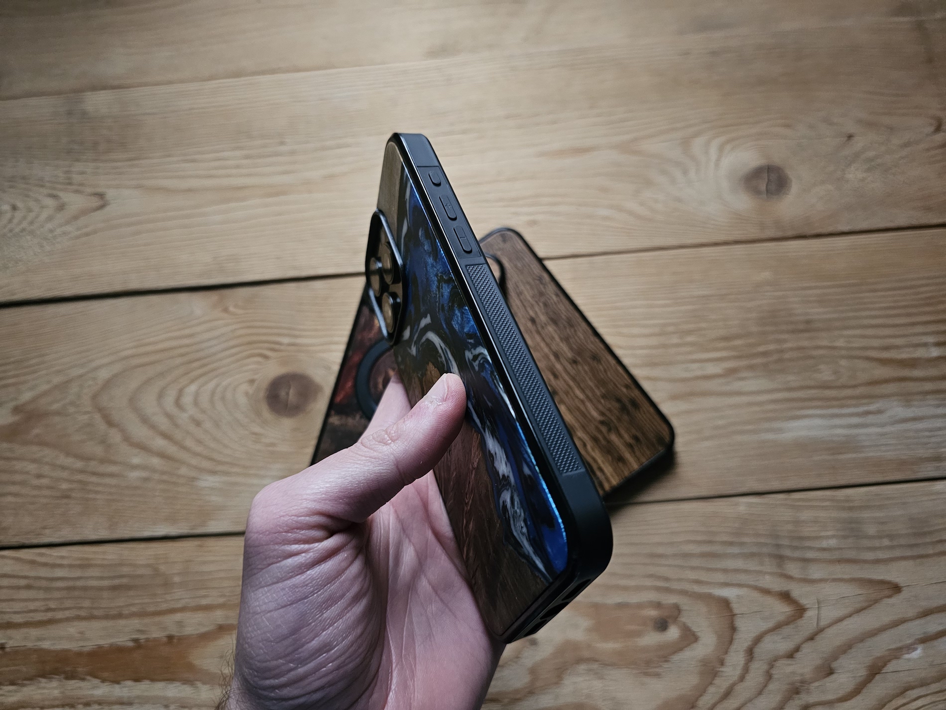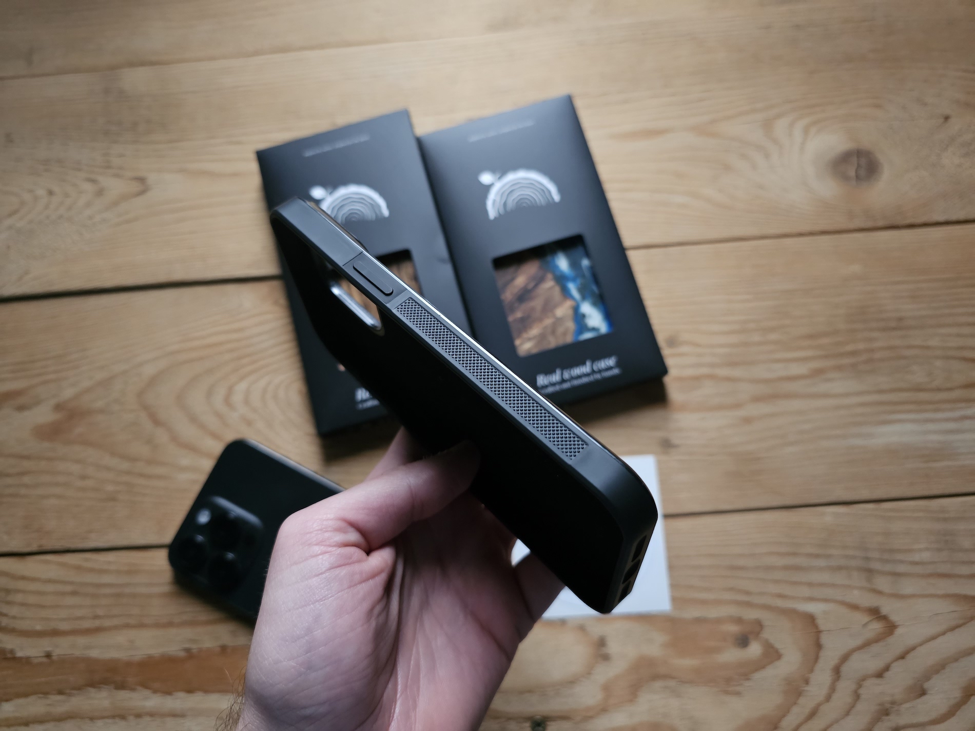 Když jsou záda dřevěná, skořepina sama je z polykarbonátu odolnému proti nárazu, nezapáchá a nemění svůj tvar vlivem teploty. V kombinaci s TPU silikonem padne kryt vašemu telefonu jako ulitý. Samozřejmostí jsou všechny potřebné prostupy tam, kde jsou reproduktory, konektory a fotoaparáty (u nich je kryt zesílen, aby se telefon na stole opíral o něho, a ne o objektivy). Tlačítka hlasitosti, tlačítko Akce a zapnutí jsou kryté, takže je tisknete přes obal. Stisk je ale jistý a nestává se, že byste si jím nebyli jistí. Hodí se ale ještě poznamenat, že po bocích krytu jsou protiskluzové plochy, z vnitřní strany je jemná měkká vrstva materiálu.