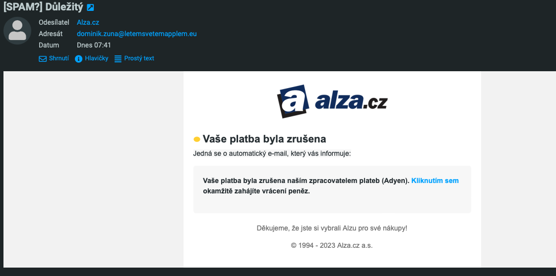 I letos se Alza potýká také se sérií podvodných SMS a e-mailů, které většinou informují o výhře v neexistující soutěži. Tyto tzv. phishingové útoky mohou být velmi zrádné v tom, že se tváří jako oficiální komunikace e-shopu. Obsažené odkazy však zpravidla vedou na zcela jinou stránku, kde vyžadují zadání platby či osobních údajů.