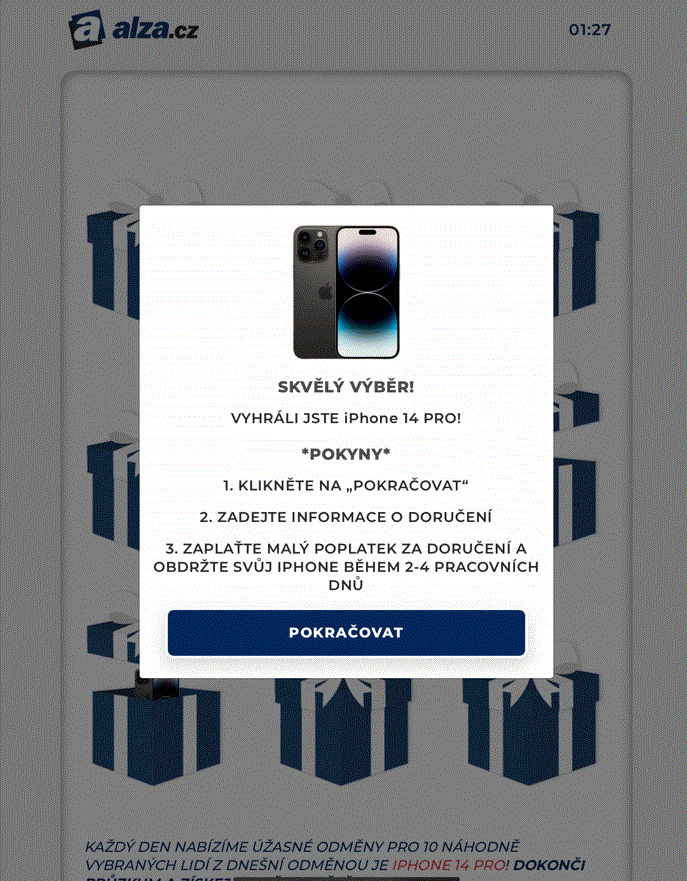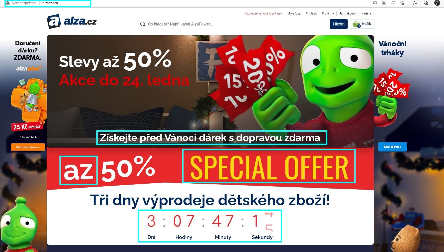 I letos se Alza potýká také se sérií podvodných SMS a e-mailů, které většinou informují o výhře v neexistující soutěži. Tyto tzv. phishingové útoky mohou být velmi zrádné v tom, že se tváří jako oficiální komunikace e-shopu. Obsažené odkazy však zpravidla vedou na zcela jinou stránku, kde vyžadují zadání platby či osobních údajů.