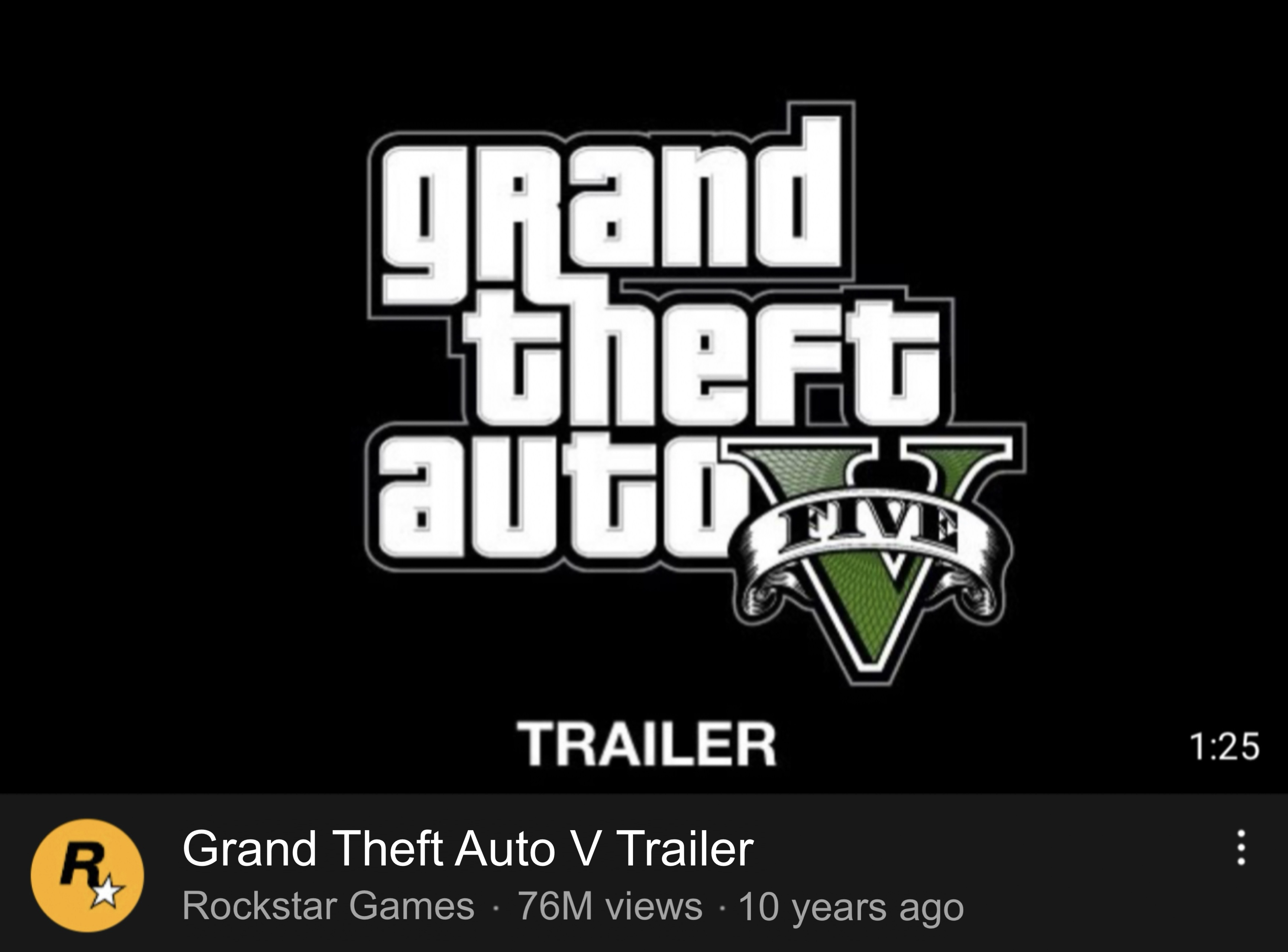 Mě zas nevychází, že neumíte číst. Ve článku je napsáno, že po 10 letech měl trailer ke GTA 5 76 milionů views.