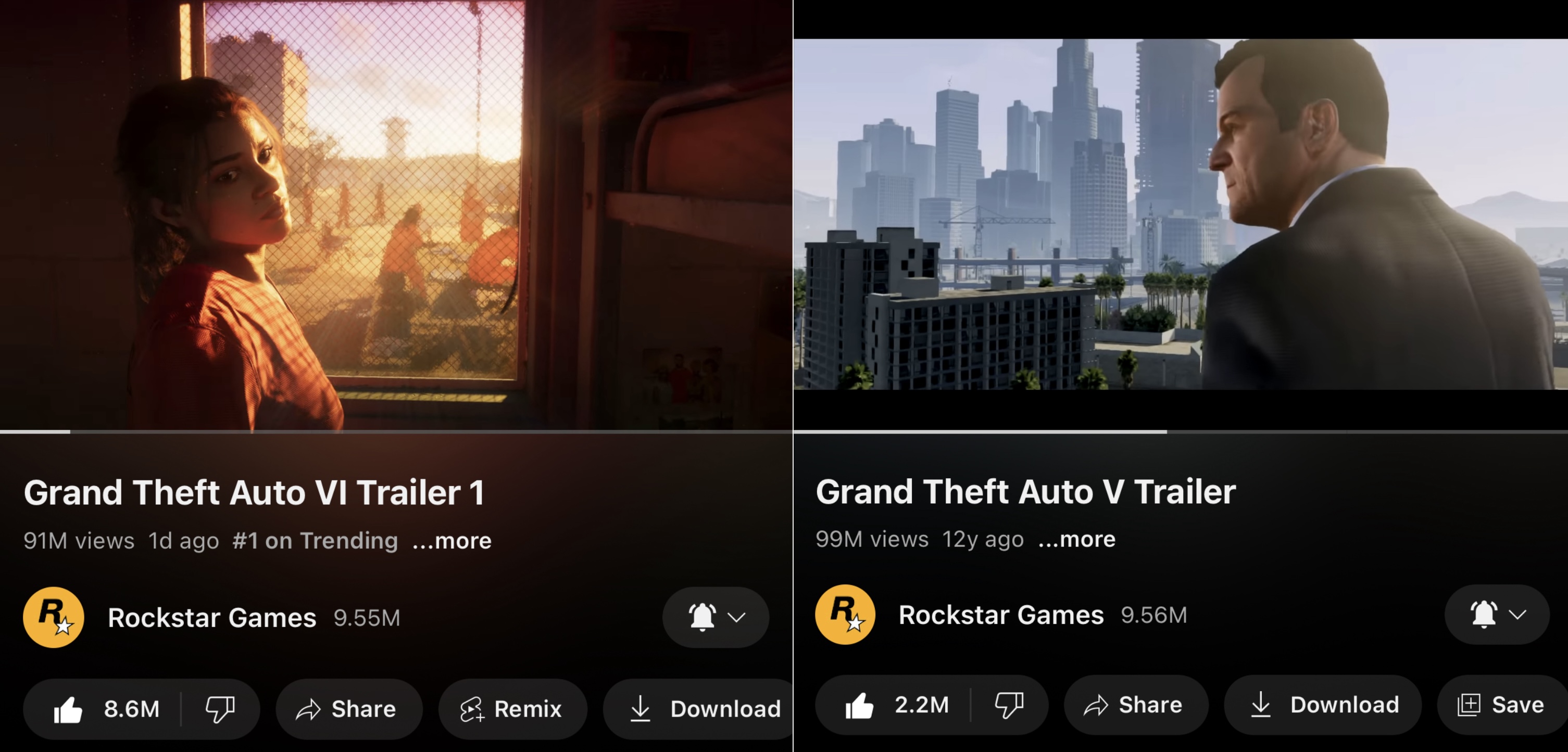 GTA 5 viděl svět poprvé před 12 lety, přičemž už tehdy se o titulu hovořilo jakožto o novodobém fenoménu. Série Grand Theft Auto byla totiž již tehdy extrémně oblíbená zejména díky GTA: Vice City a Andreas. Čtvrtý díl sice zabodoval méně než Rockstar čekal, nicméně od „pětky“ si lidé slibovali velké věci, které hra nakonec i naplnila. O to úsměvnější je, že po 10 letech měl trailer na GTA 5 „pouhých“ 76 milionů přehrání na YouTube, přičemž po 12 letech je to 99 milionů. A GTA 6? To zvládlo za pouhý 1 den 91 milionů přehrání. V době psaní tohoto článku pak na YouTube už svítilo neuvěřitelných 116 milionů přehrání.