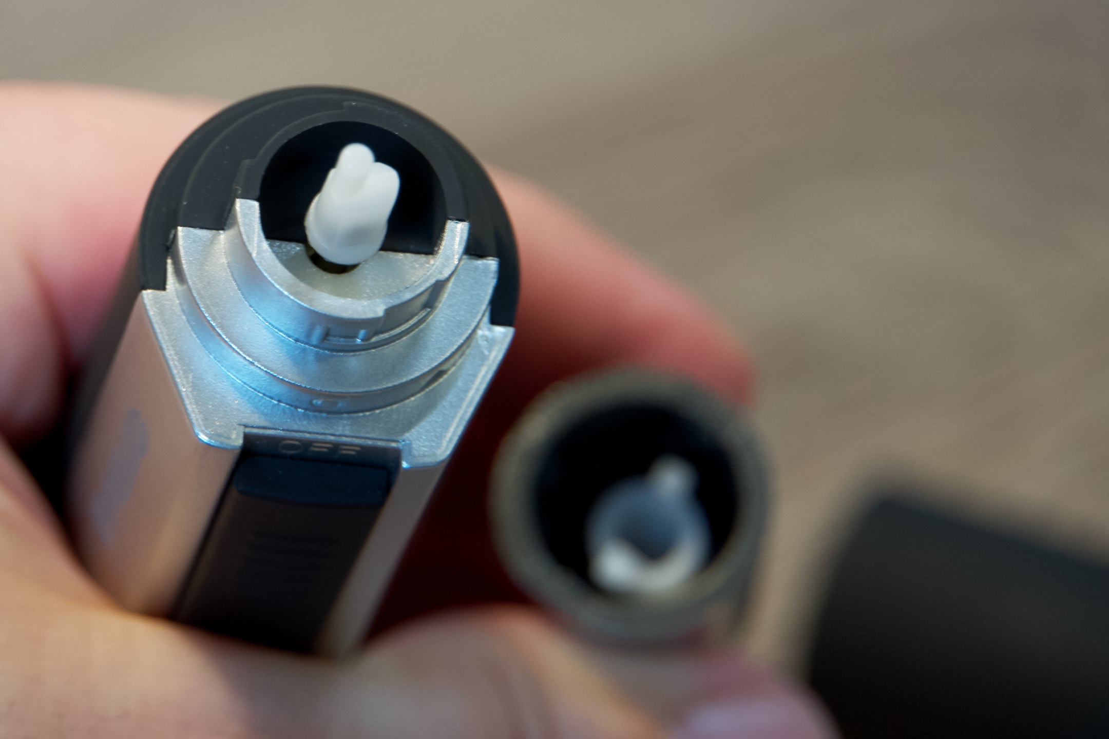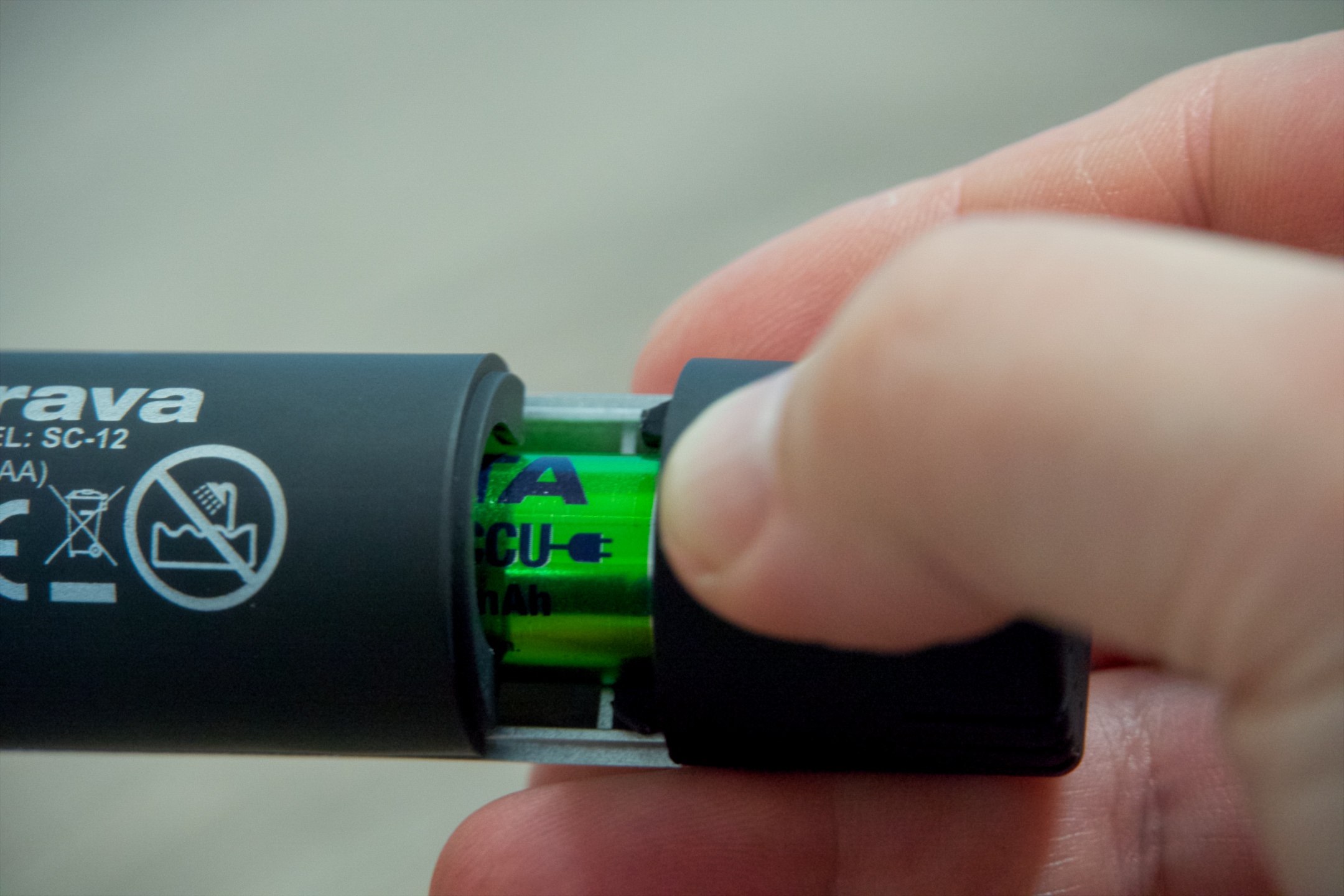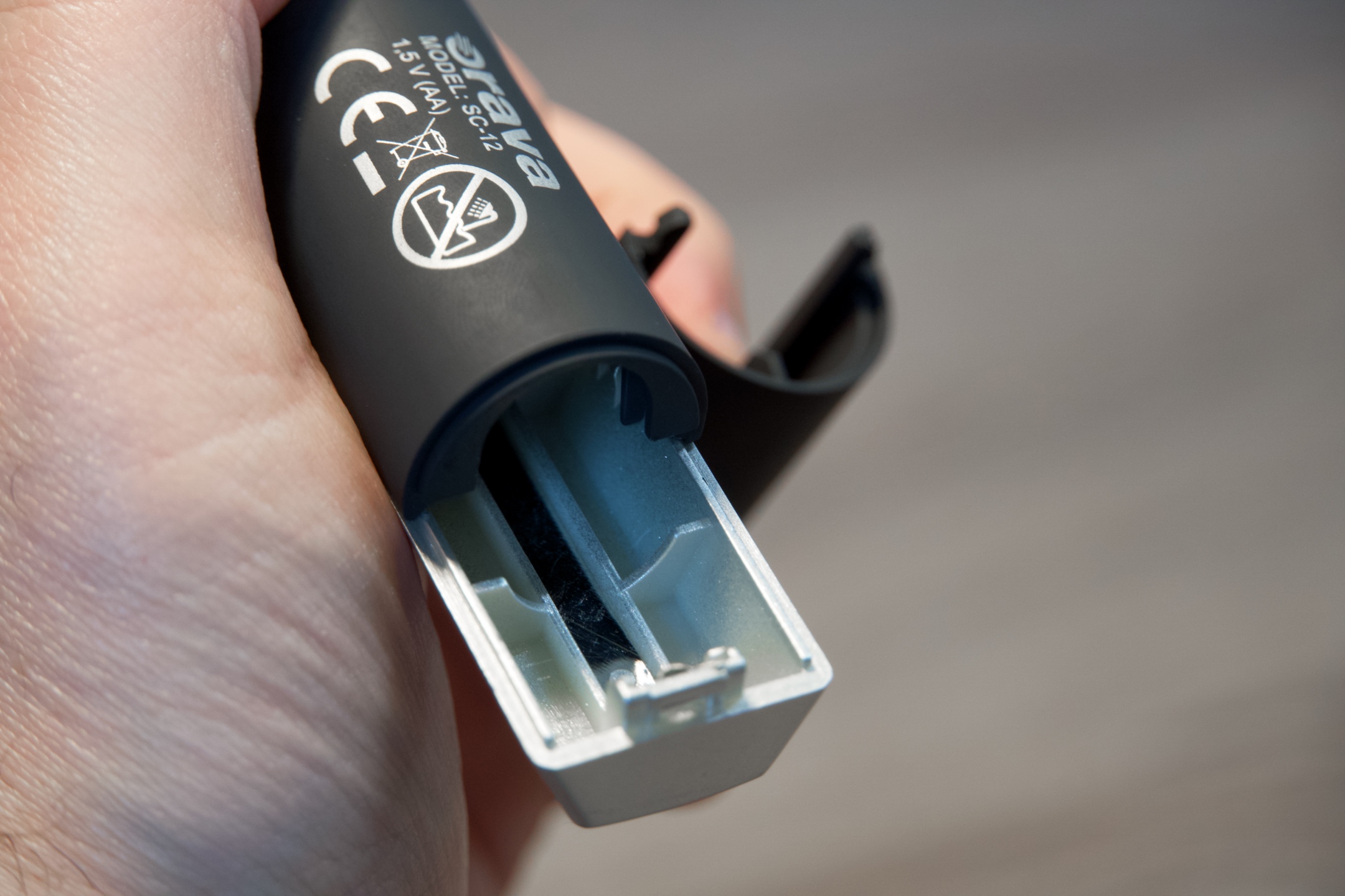Uvedení do provozu je jednoduché. Stačí tahem dolů odkrýt prostor pro baterii, s ohledem na polaritu ji správně vložit, aby plus směřovalo dolů, kryt zavřít a černým spínačem SC-12 zapnout. Pakliže chcete vyměnit hlavu, docílíte toho pootočením proti směru hodinových ručiček, přičemž optimální pozici pro manipulaci na zařízení naznačují symboly trojúhelníku a kruhu a na nástavcích ryska. Při opětovném nasazení je třeba vyvinout mírný tlak, aby hlava zapadla, takže se pak ryska nachází přesně ve středu kruhového symbolu.
