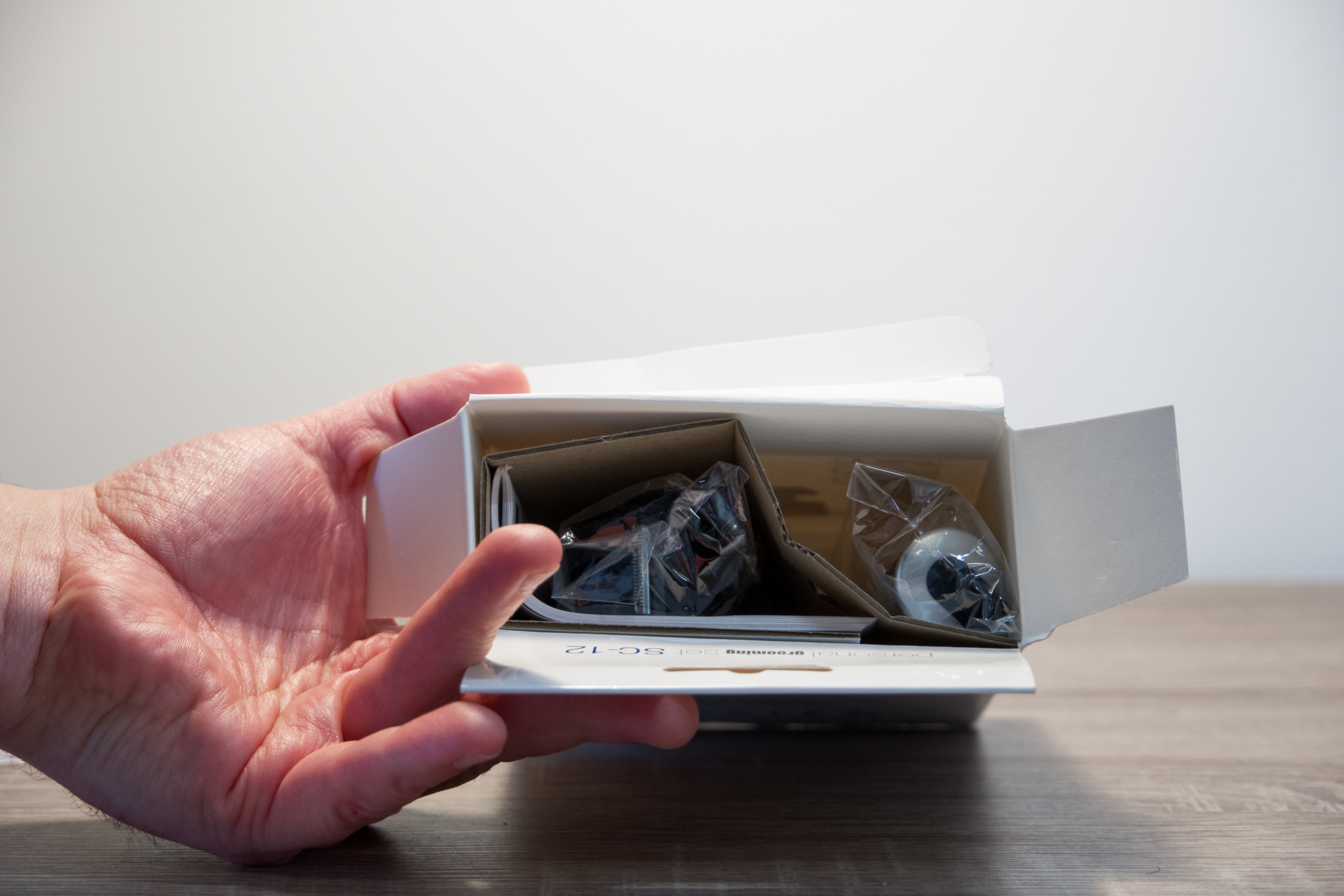 Nevelká bílá krabička s potiskem ve svých útrobách ukrývá kromě samotného zastřihovače, který kombinuje stříbrnou a černou barvu a je opatřen ochranným víčkem, také druhý nástavec, hřebínek, čistící kartáček a praktický stojánek, do něhož lze celý set usadit. Obě hlavy jsou v případě potřeby omyvatelné, což usnadňuje údržbu a k napájení slouží jediná baterie typu AA. Bez příslušenství váží SC-12 pouhých 108 g a rozměrově zabírá 2,5 cm na šířku, 12,5 na výšku a 3 cm hloubky.