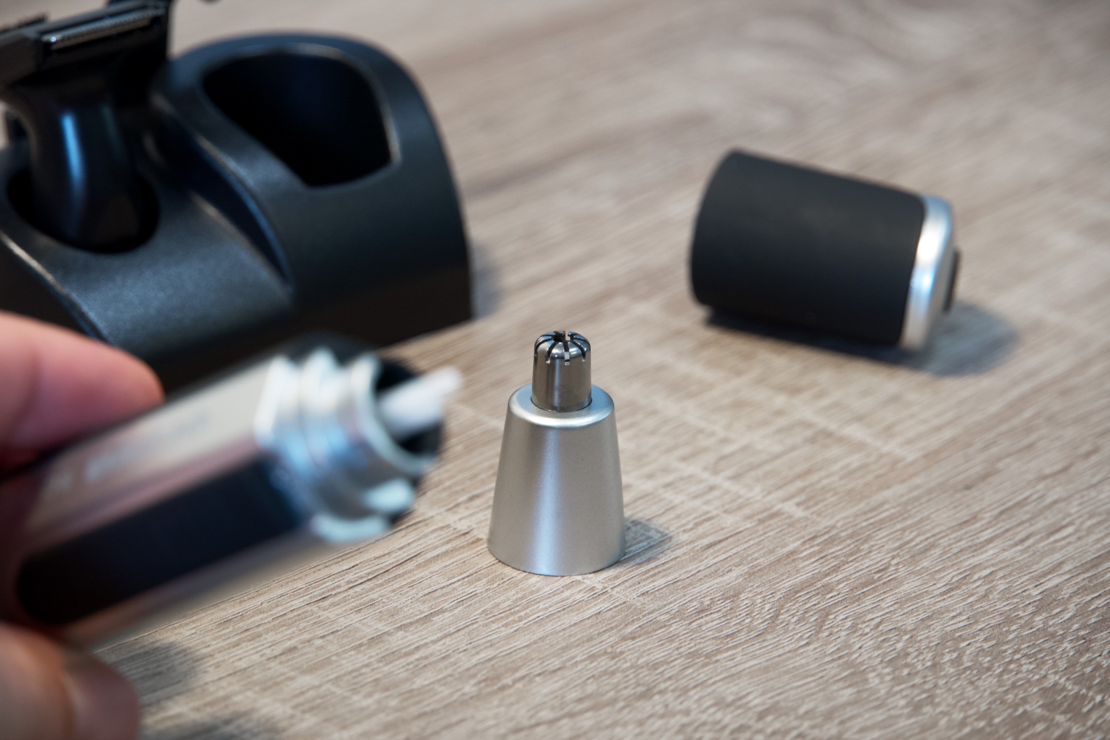 K zastřihování ušních i nosních chloupků slouží klasická kruhová hlavice, která je dostatečně pevná a při výměně se vám nevysype do dlaně, jak tomu někdy bývá u levných konkurenčních variant. K úpravě kontur vousů, vlasů nebo chloupků na krku je určen nástavec s plochou čepelí.
